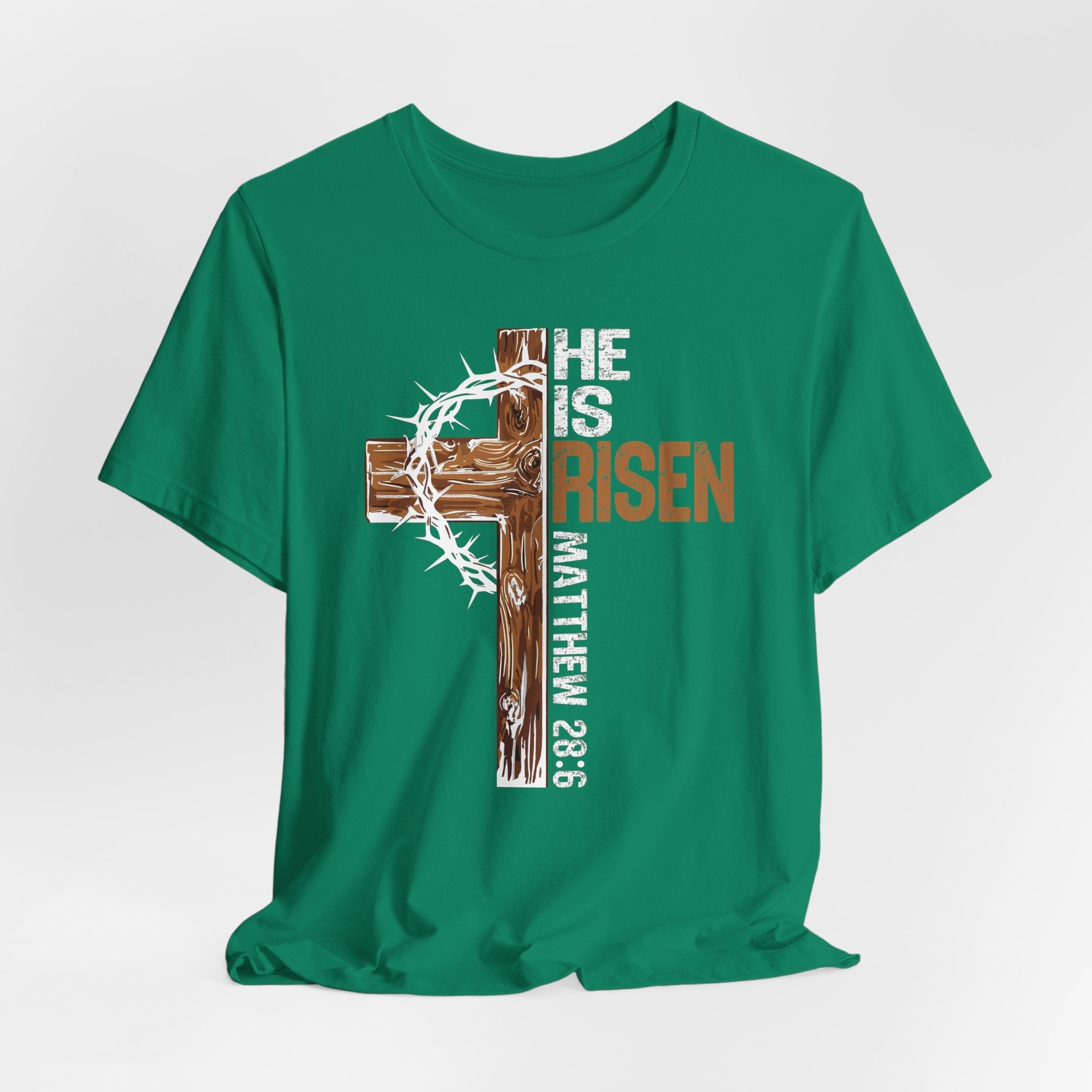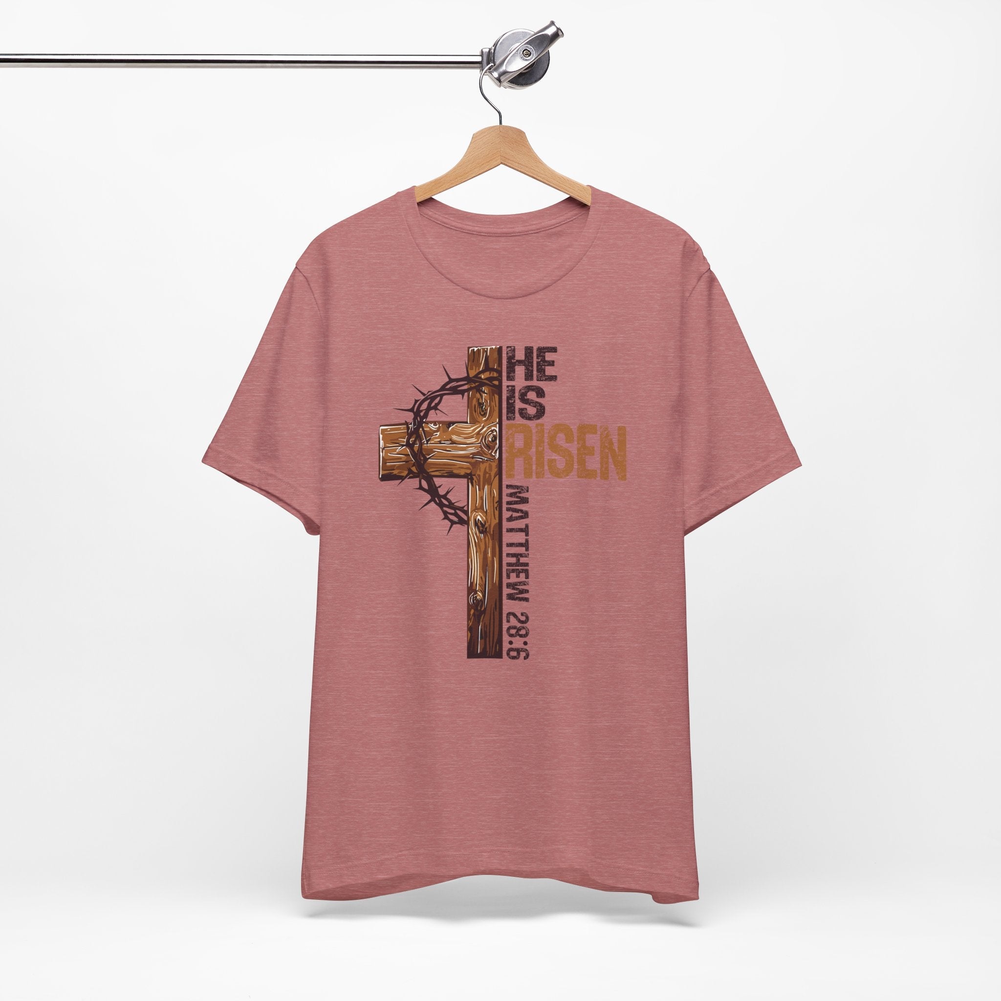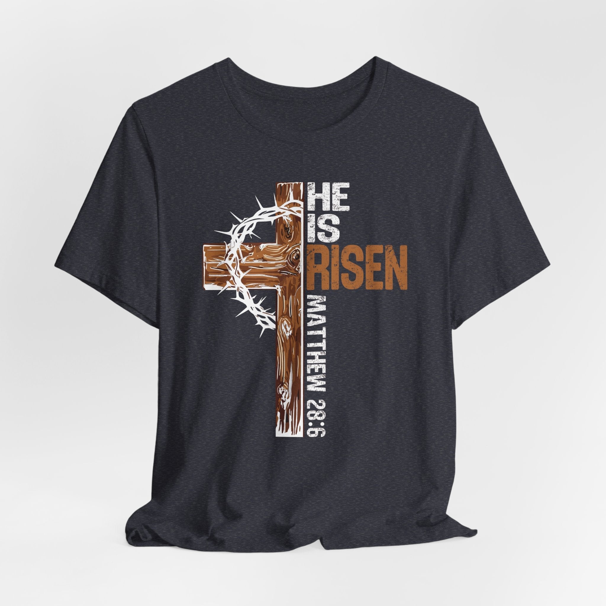 He Is Risen tee • a powerful, faith-affirming Christian T-shirt inspired by Matthew 28:6, celebrating the victory of Jesus’ resurrection.