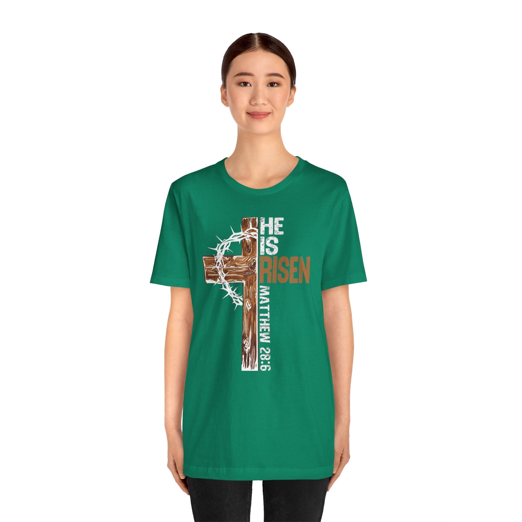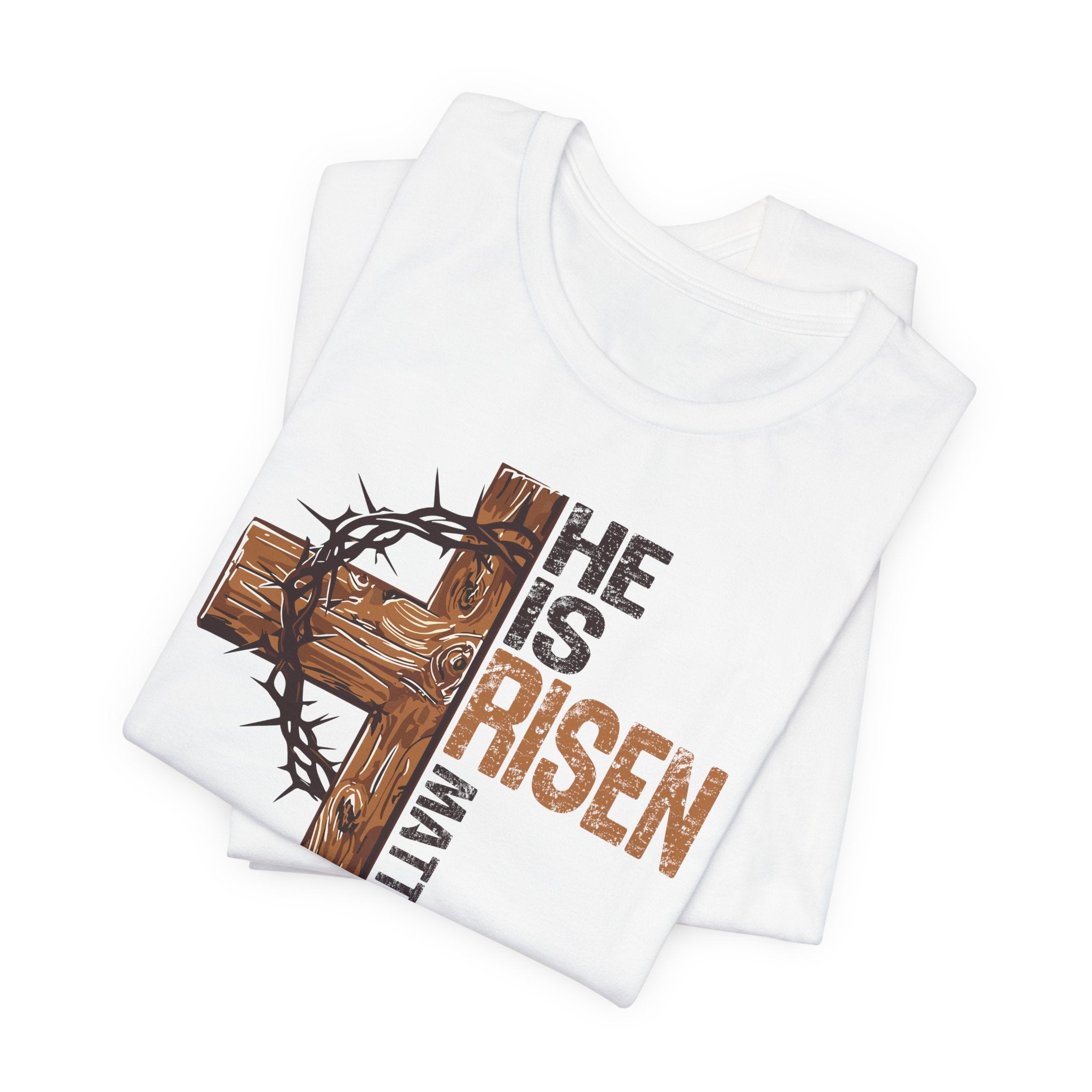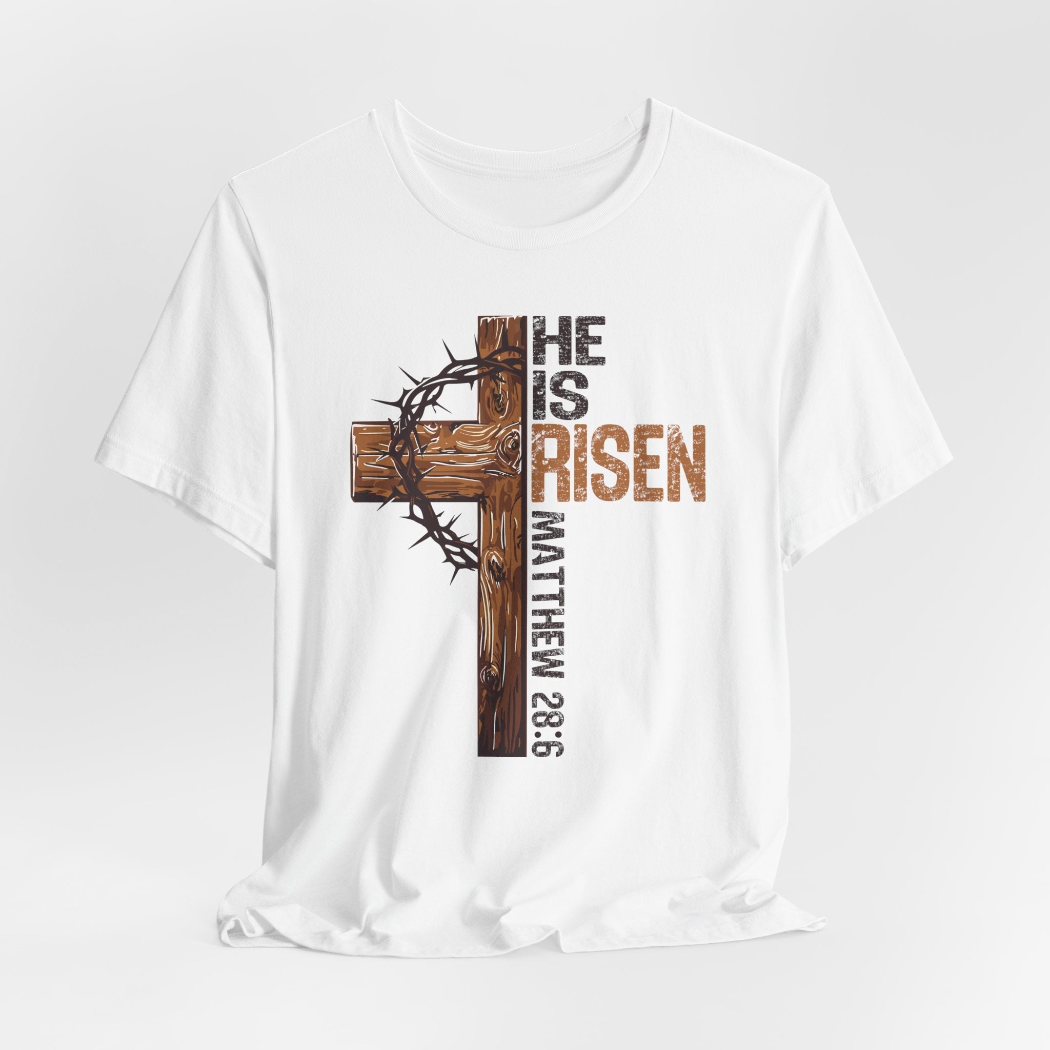 He Is Risen tee • a powerful, faith-affirming Christian T-shirt inspired by Matthew 28:6, celebrating the victory of Jesus’ resurrection.