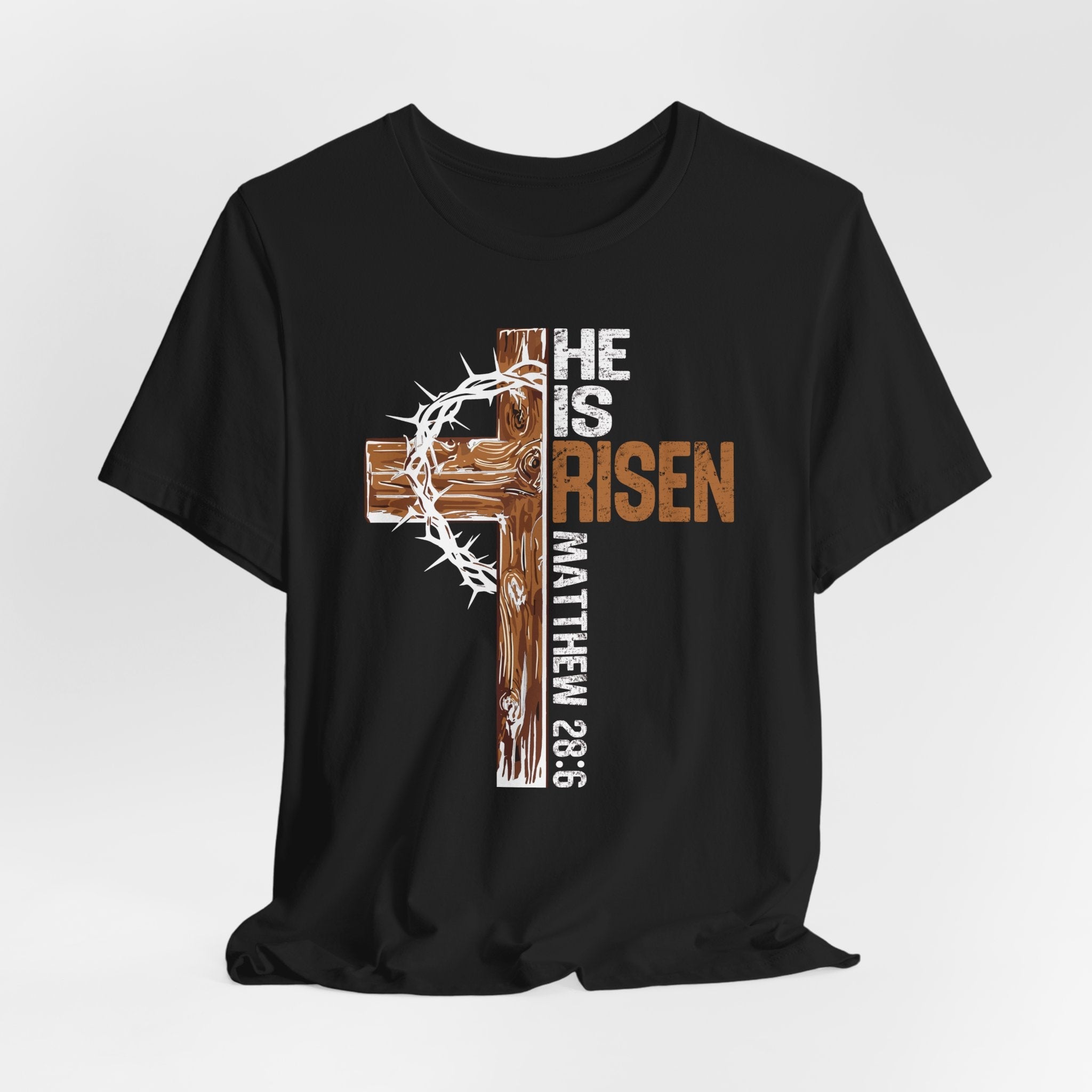 Resurrection Message — this “He Is Risen” tee boldly proclaims the heart of the Gospel from Matthew 28:6, celebrating Jesus’ triumph over death.