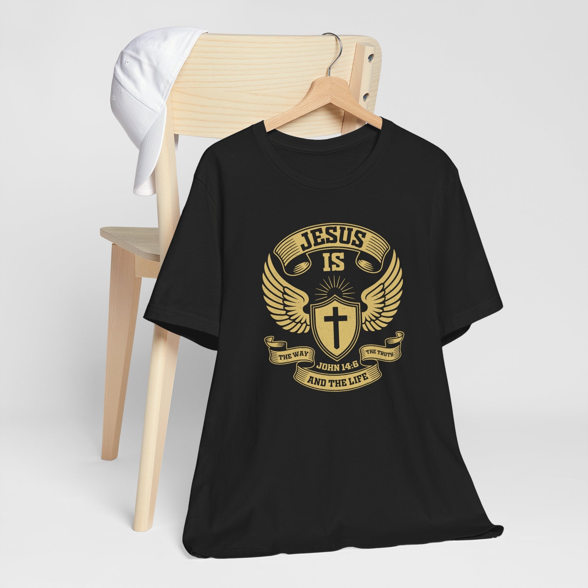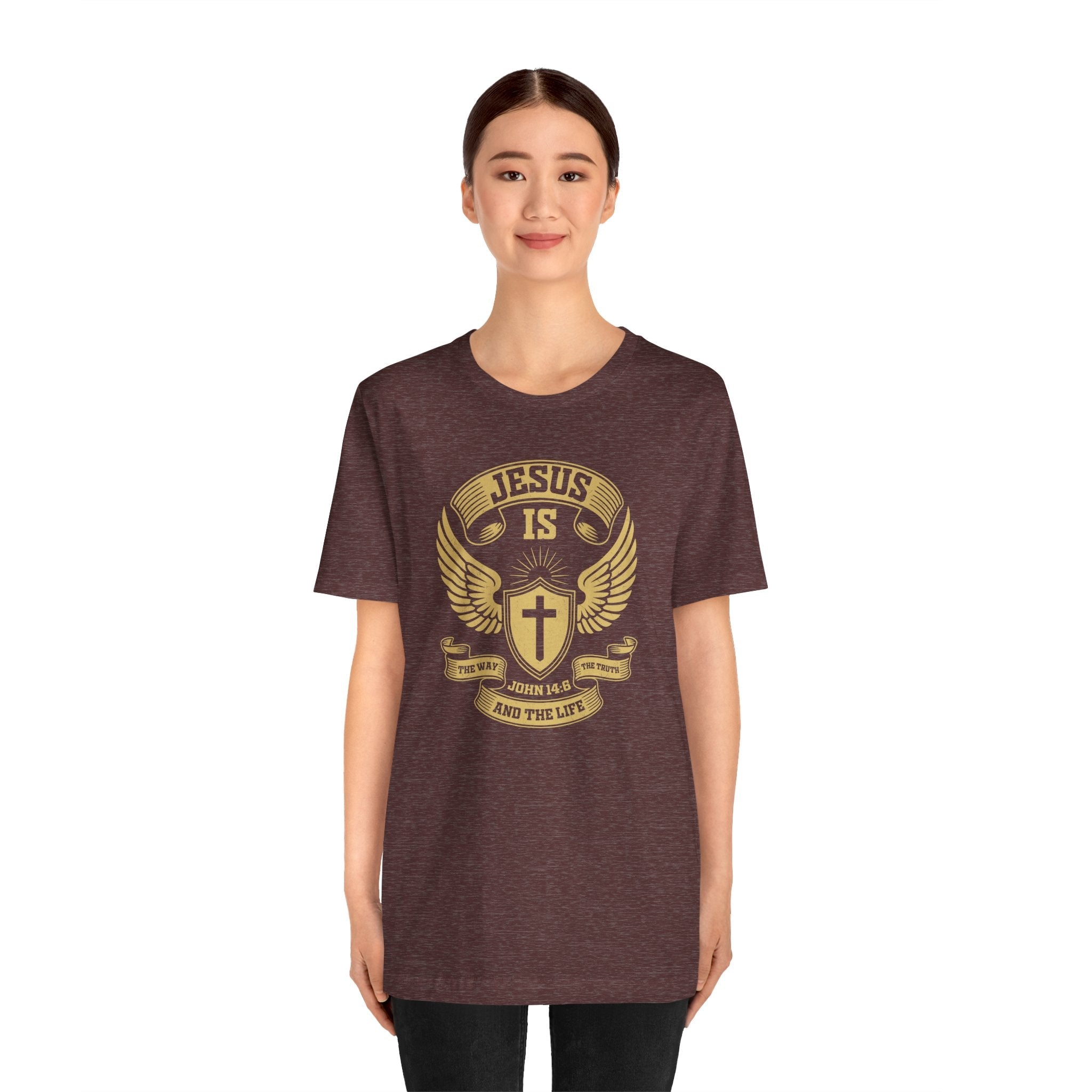 Proclaim the Ultimate Truth: This bold Christian T-shirt features the foundational Bible verse John 14:6, declaring "Jesus is The Way, The Truth, and The Life."