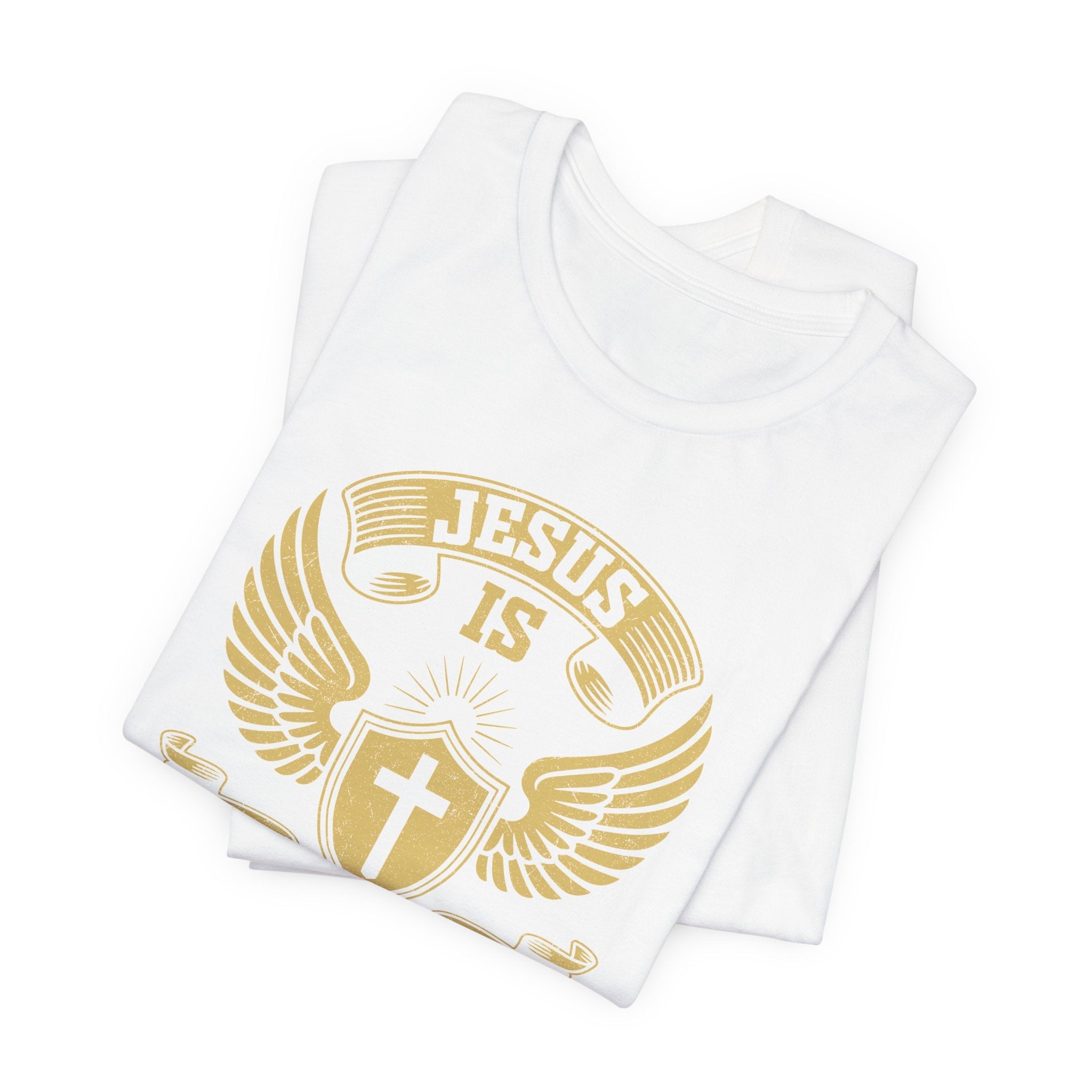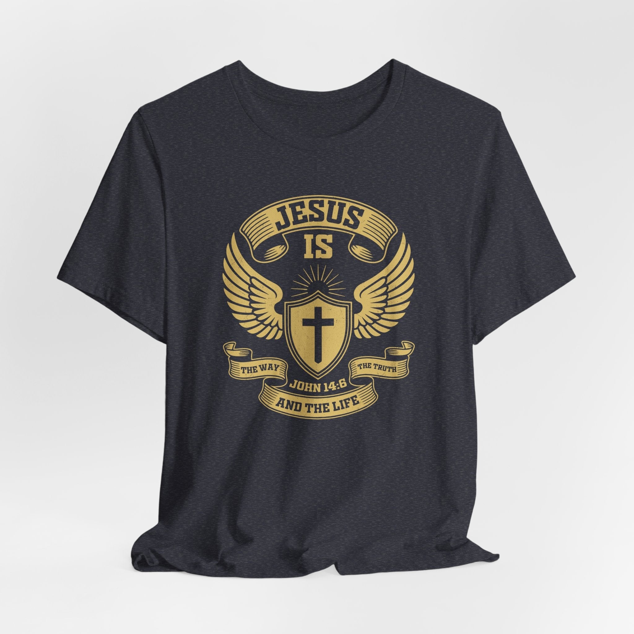 A Shield of Faith: The classic crest design, featuring a shield and wings, makes this Scripture tee a powerful statement of your identity in Christ and the one true path to salvation & grace.