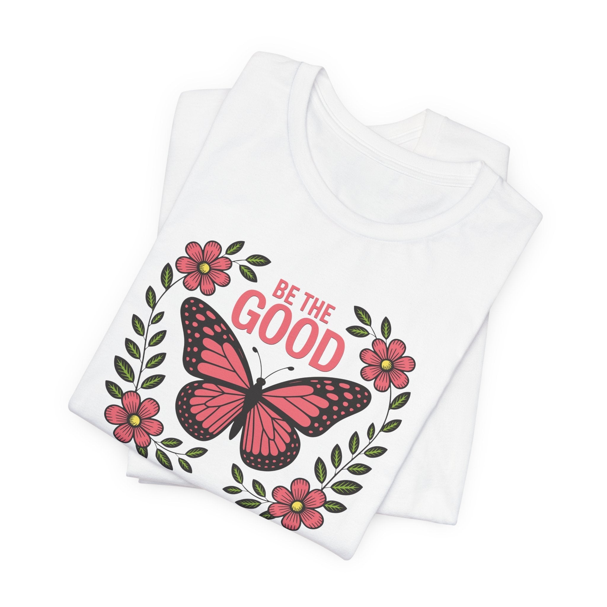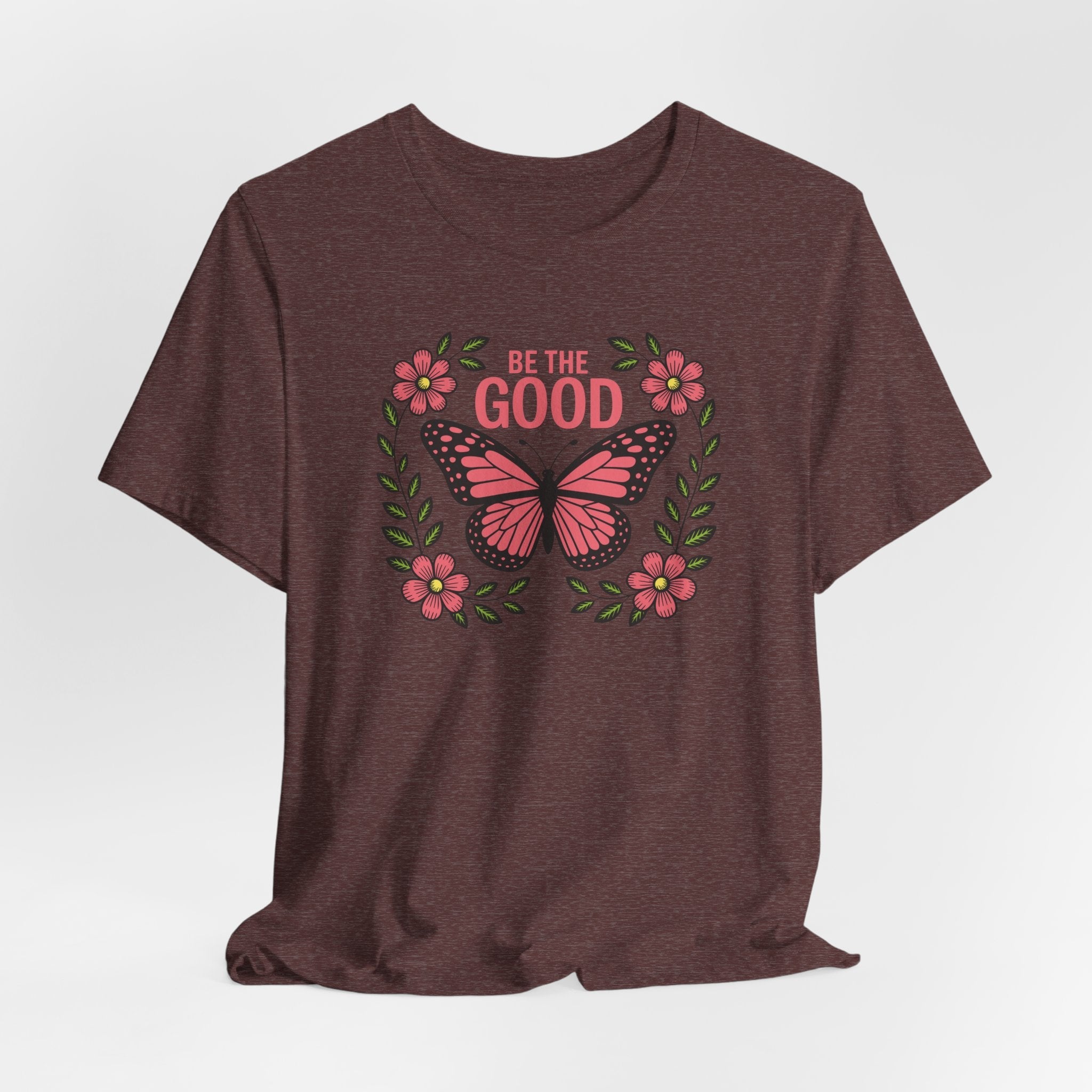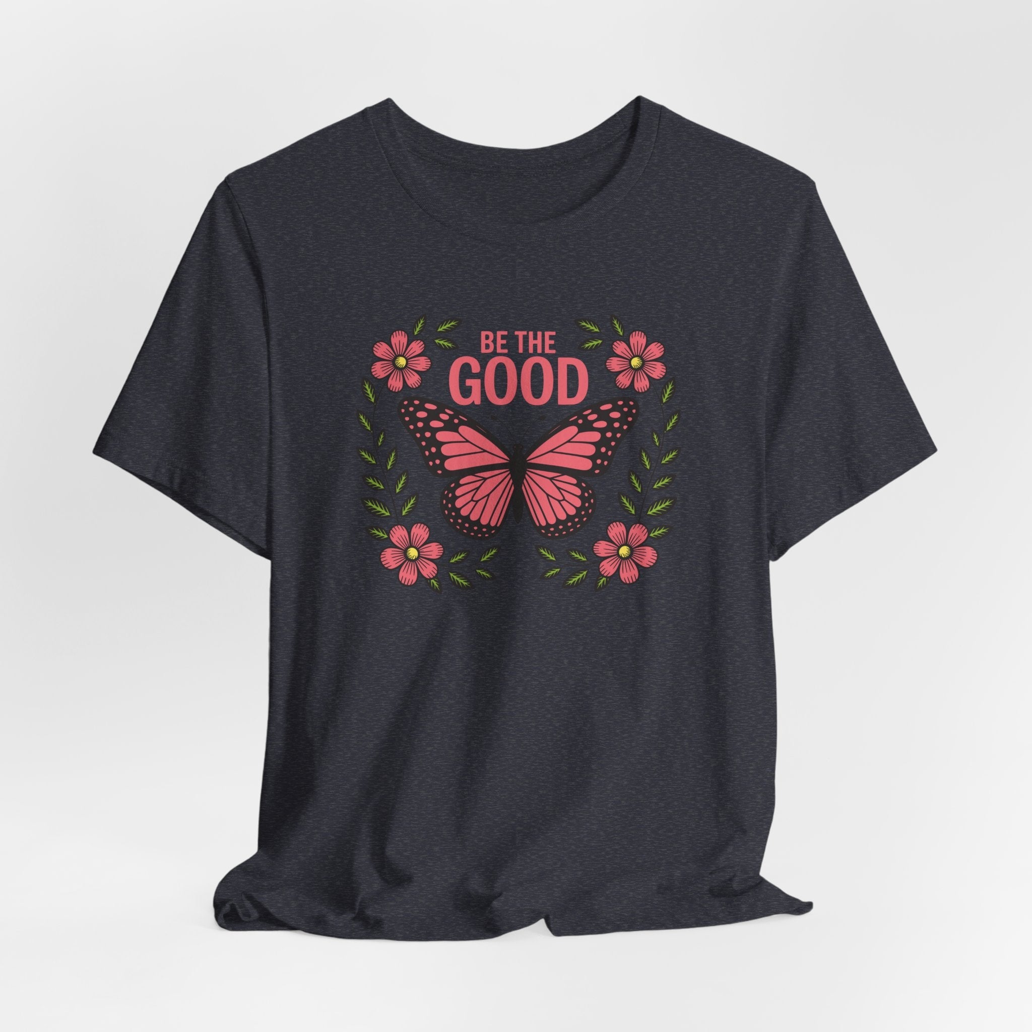 Be The Good tee — a soft, uplifting Christian T-shirt with butterfly and floral design, reminding you to live with gratitude, faith, and kindness every day.