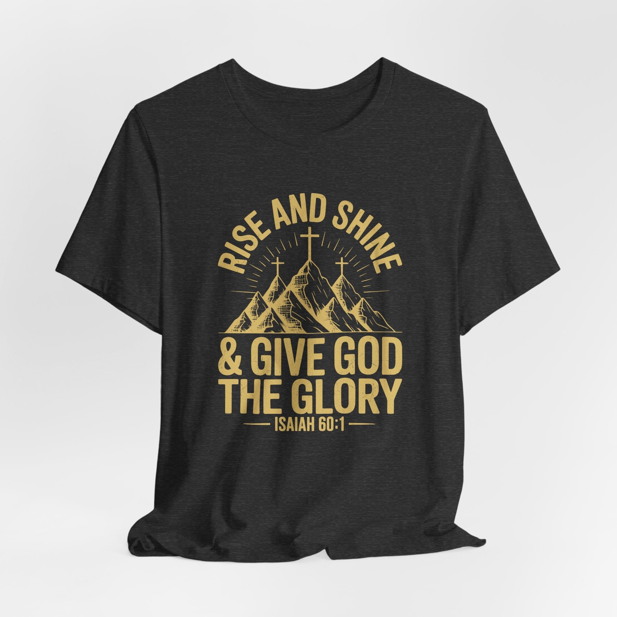 Inspired by Isaiah 60:1 — “Arise, shine, for your light has come.” This uplifting Christian tee encourages you to start every day with gratitude and glorify God in all that you do.