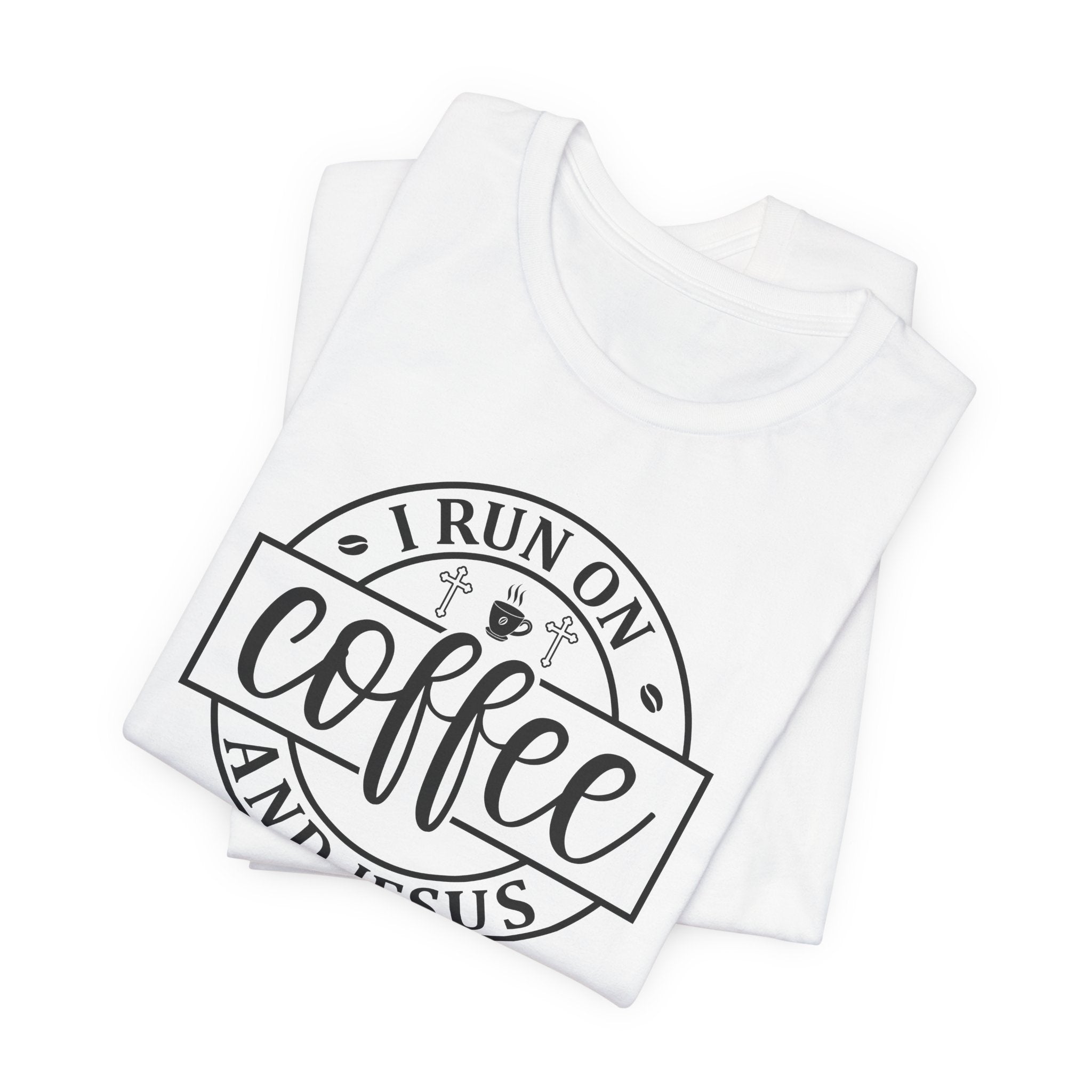 I Run On Coffee and Jesus tee — a fun, relatable Christian T-shirt for the woman who loves her caffeine and her Savior.