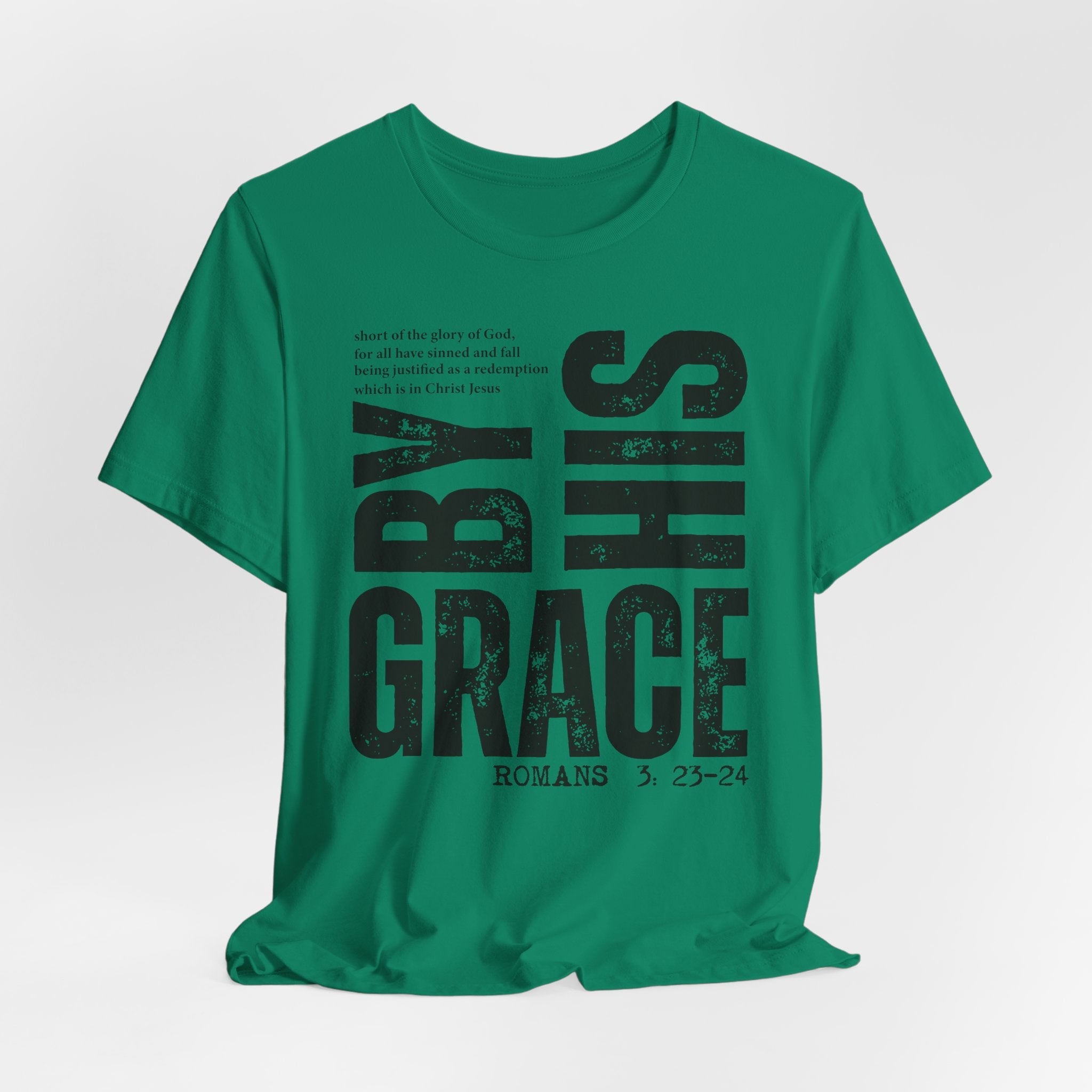 By His Grace tee — a bold, faith-anchored Christian T-shirt inspired by Romans 3:23–24, celebrating redemption and the power of God’s grace.