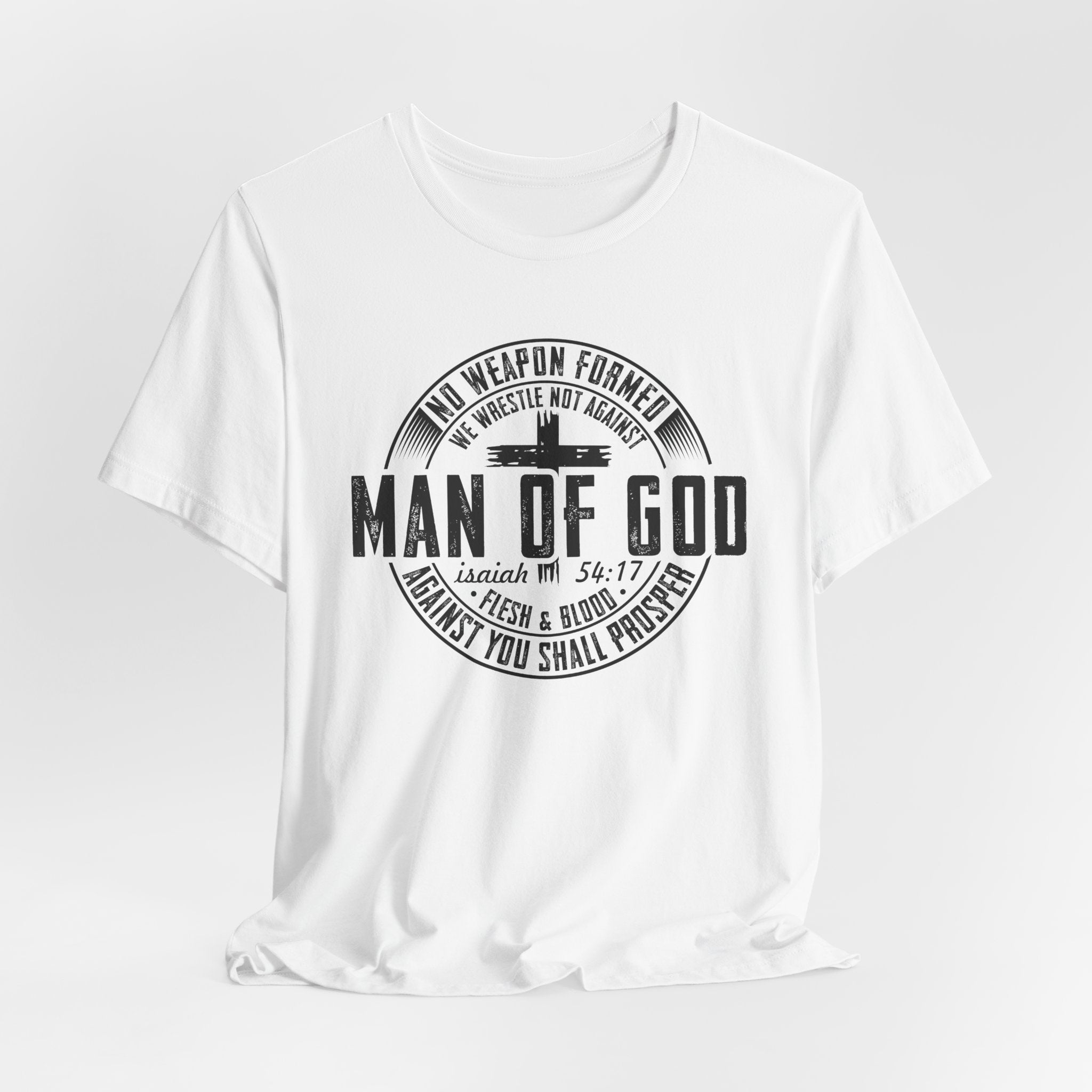 Man of God tee • a bold, scripture-inspired Christian T-shirt featuring Isaiah 54:17, a powerful reminder that no weapon formed against you shall prosper.