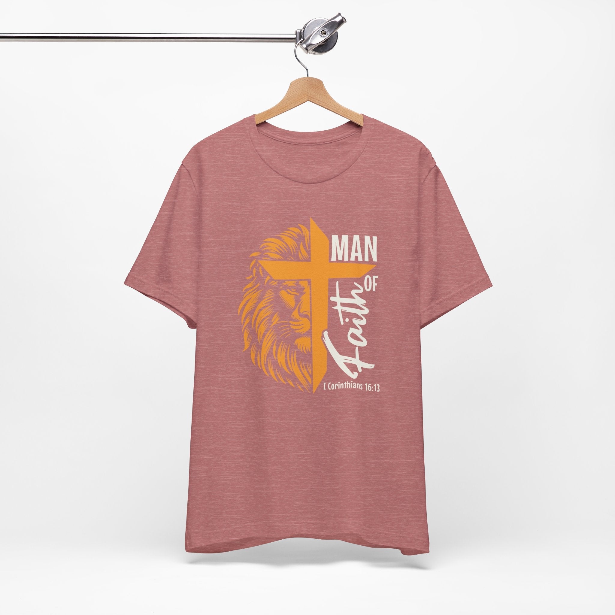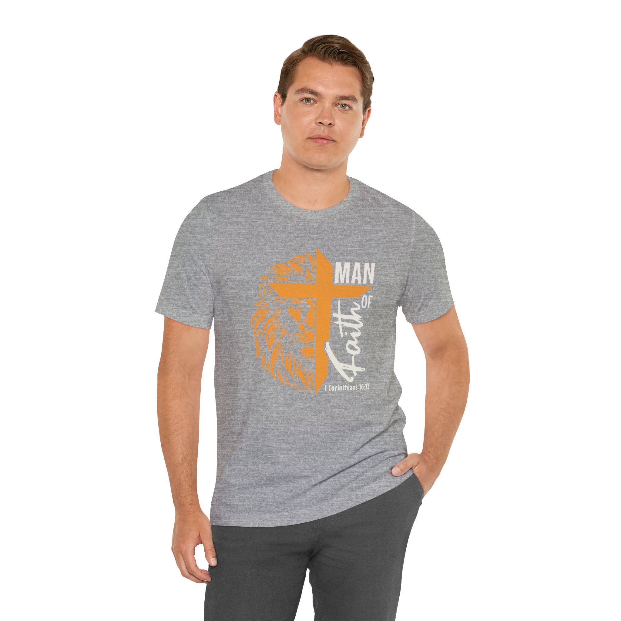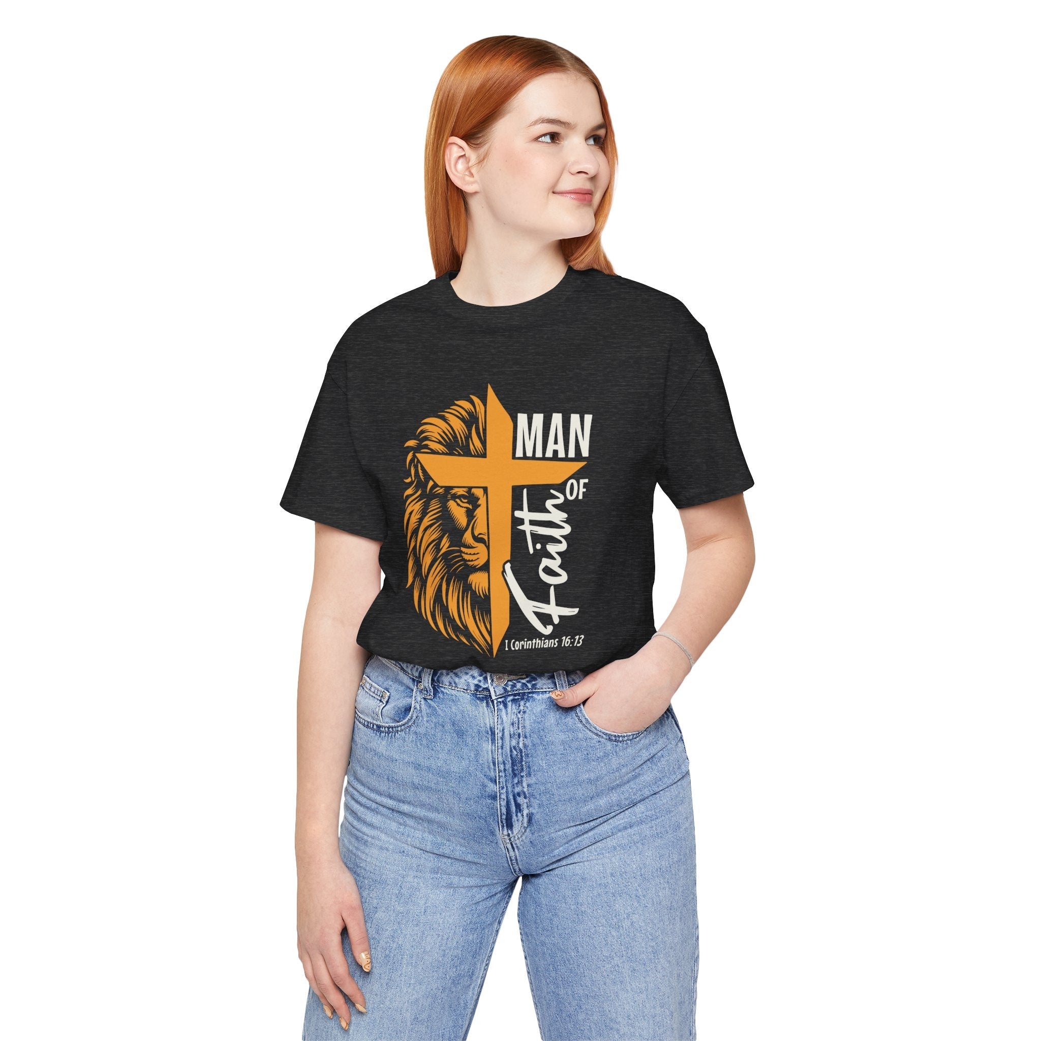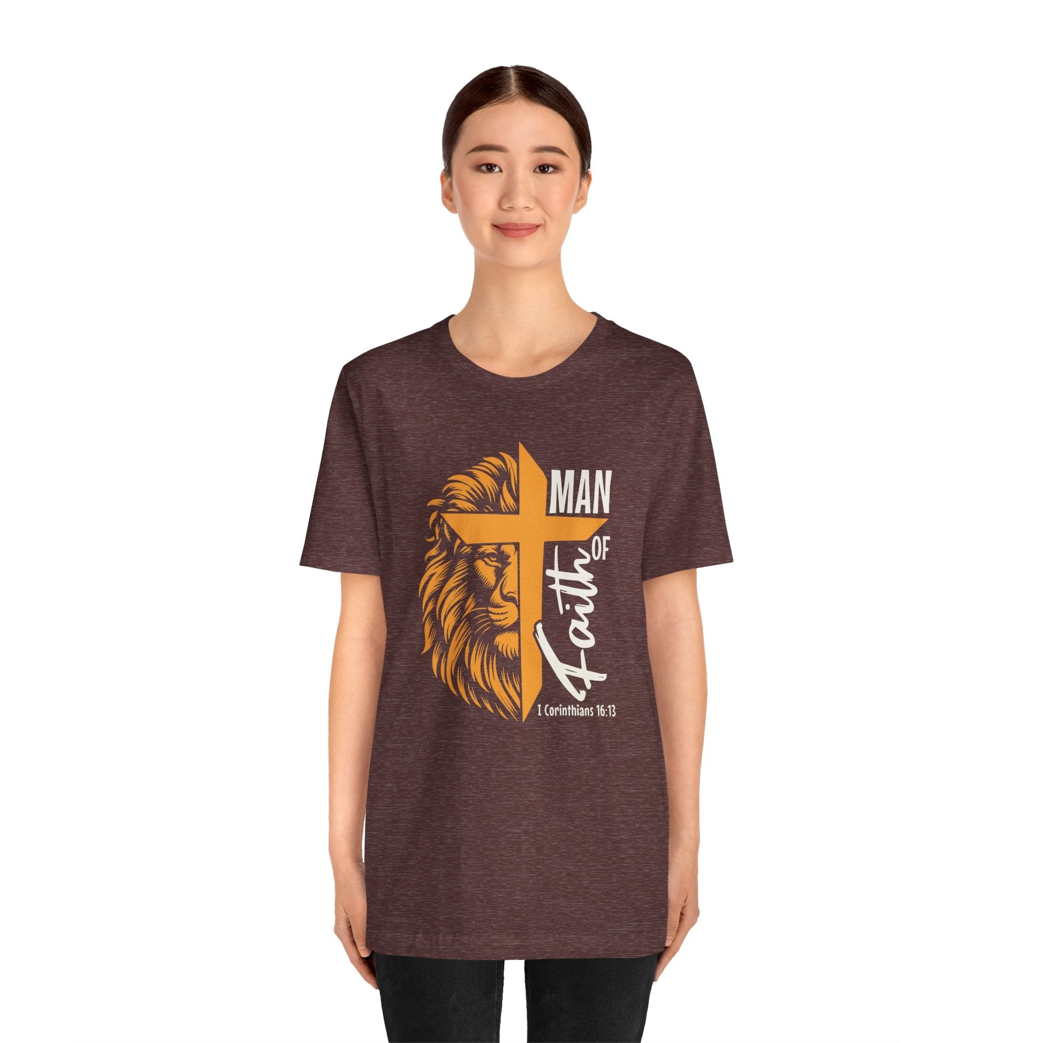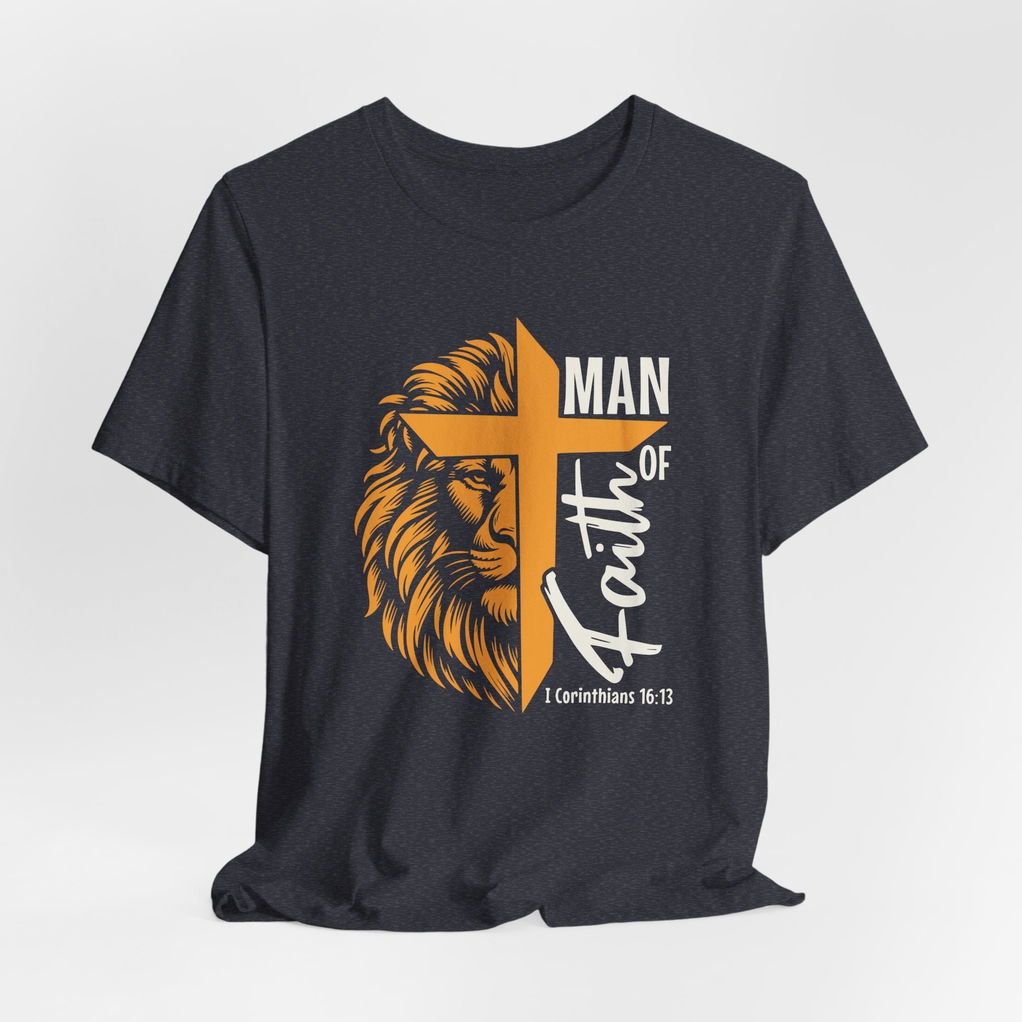 Man of Faith tee — a bold, empowering Christian T-shirt inspired by 1 Corinthians 16:13, symbolizing strength, courage, and steadfast belief in Christ.