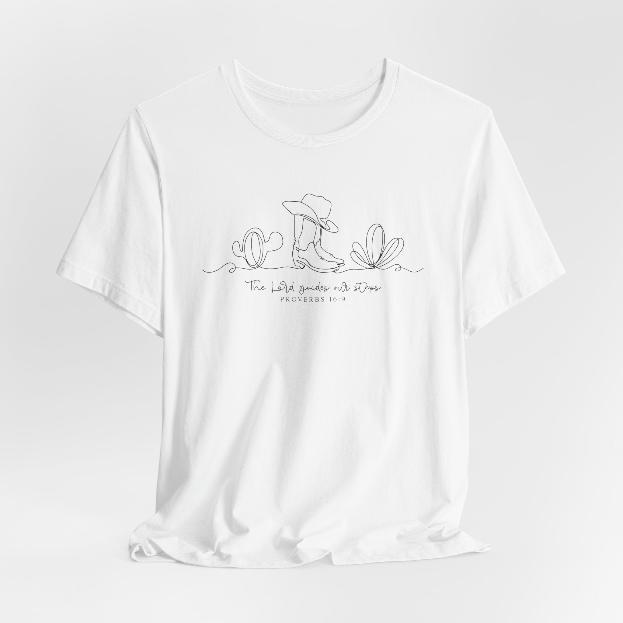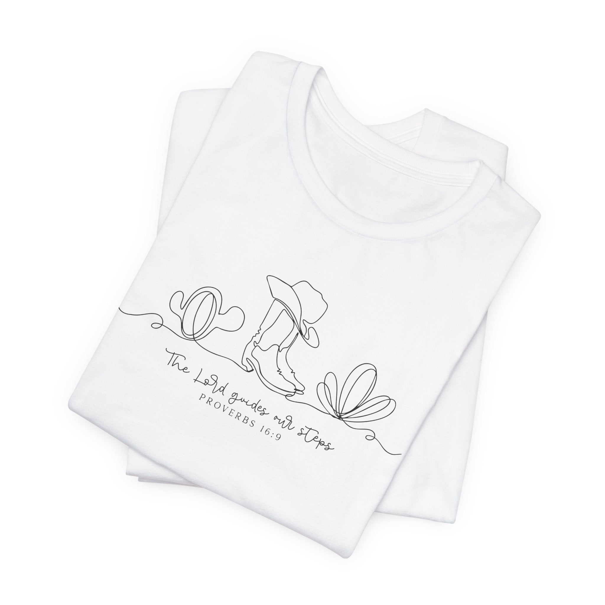 The Lord Guides Our Steps tee • a minimalist Christian T-shirt inspired by Proverbs 16:9 — a reminder that God directs every path with grace and purpose.