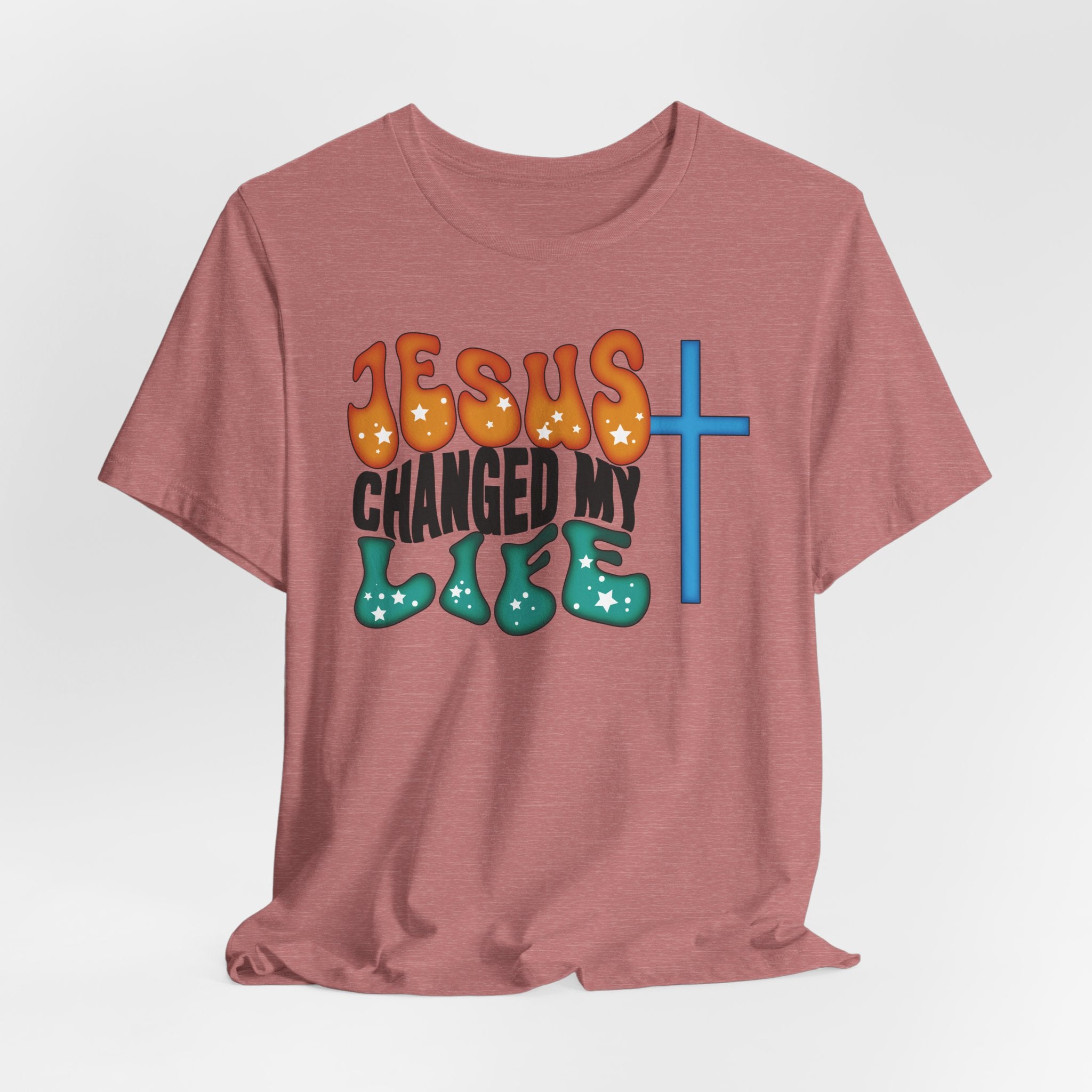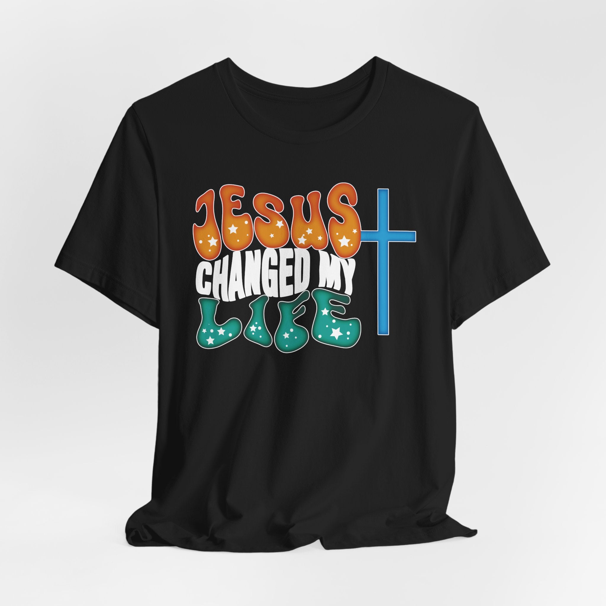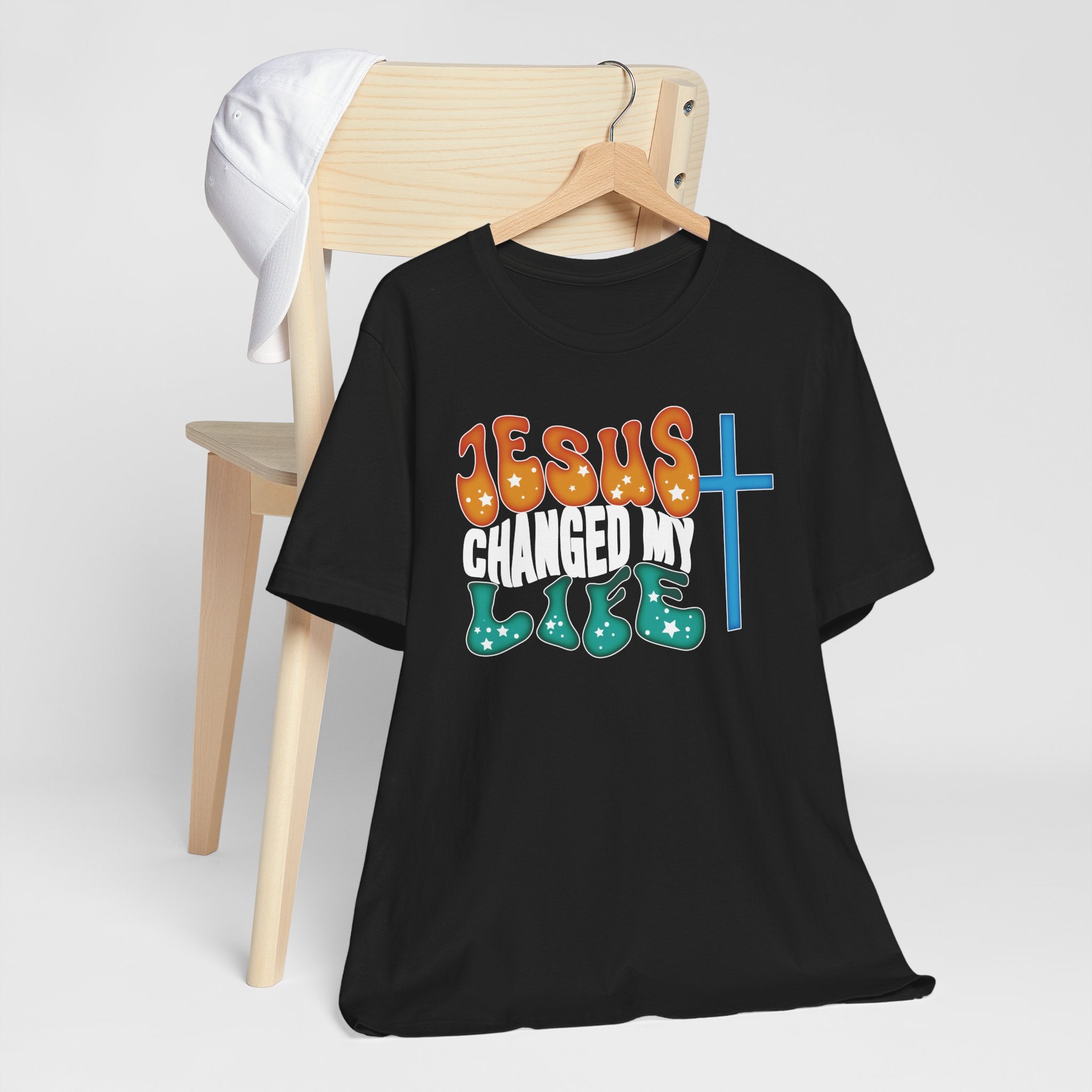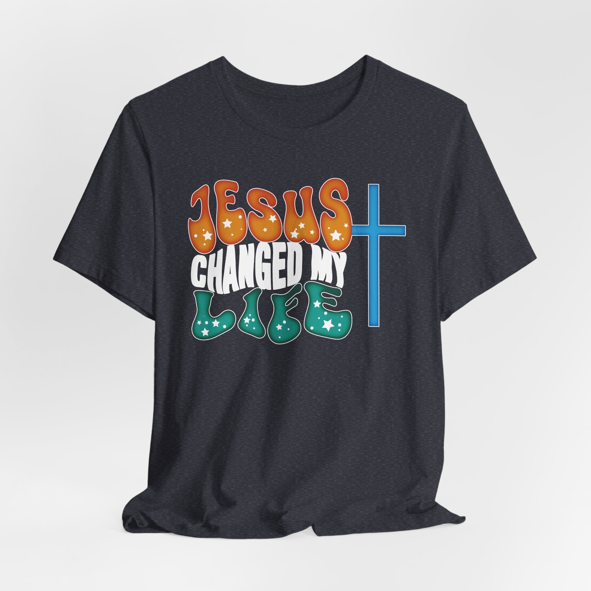Jesus Changed My Life tee • a vibrant, retro-style Christian T-shirt celebrating transformation, grace, and faith through Jesus.