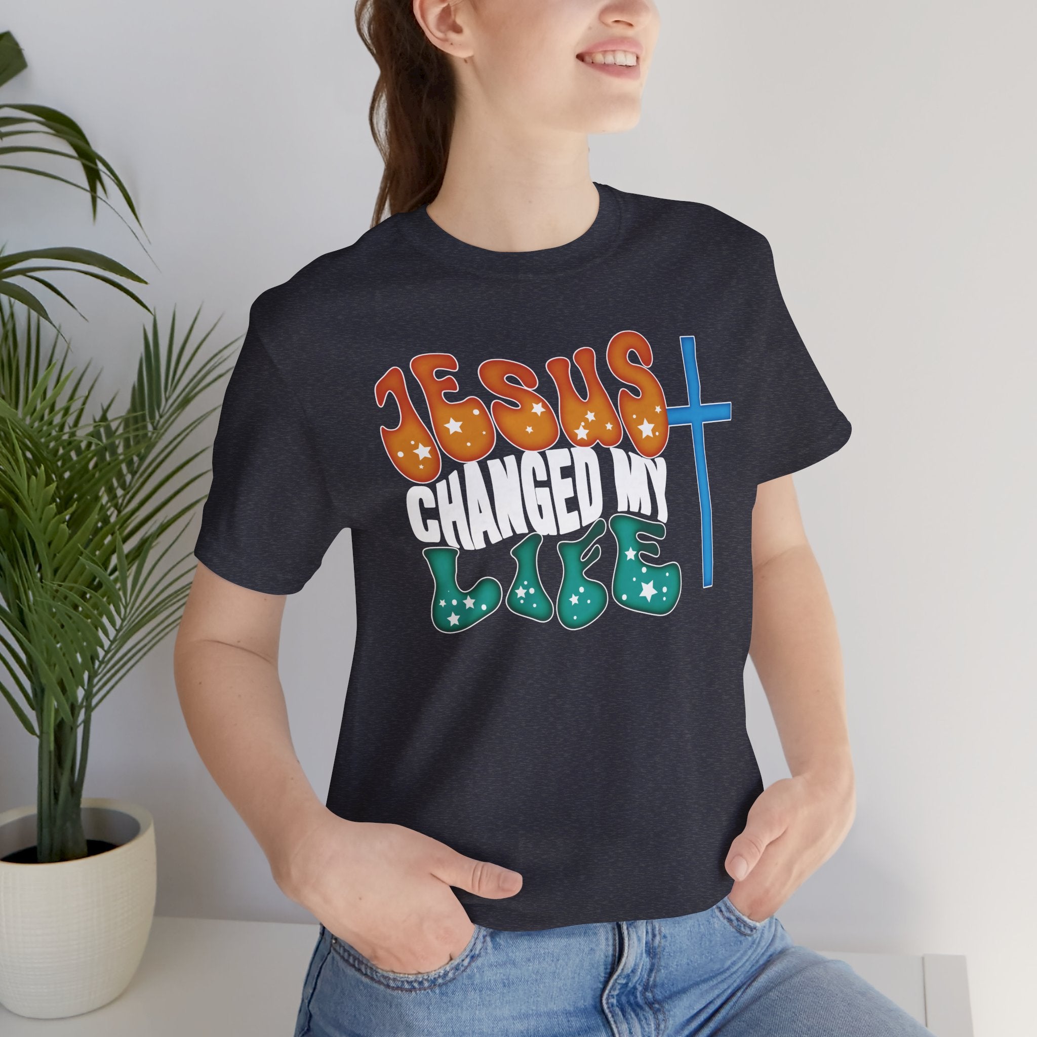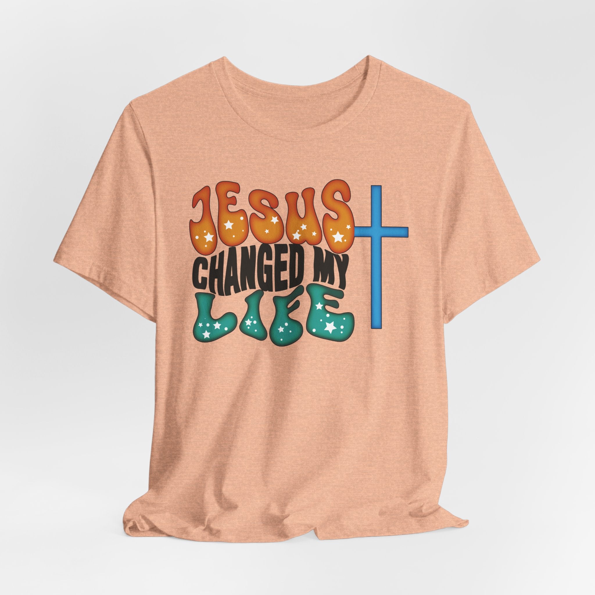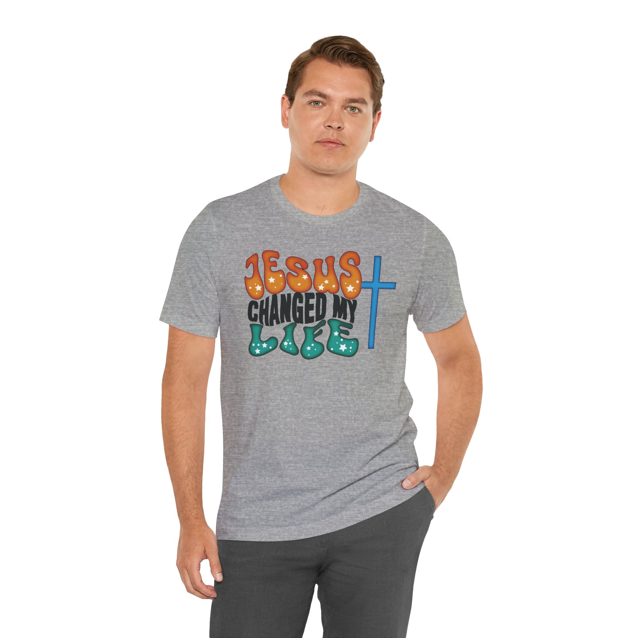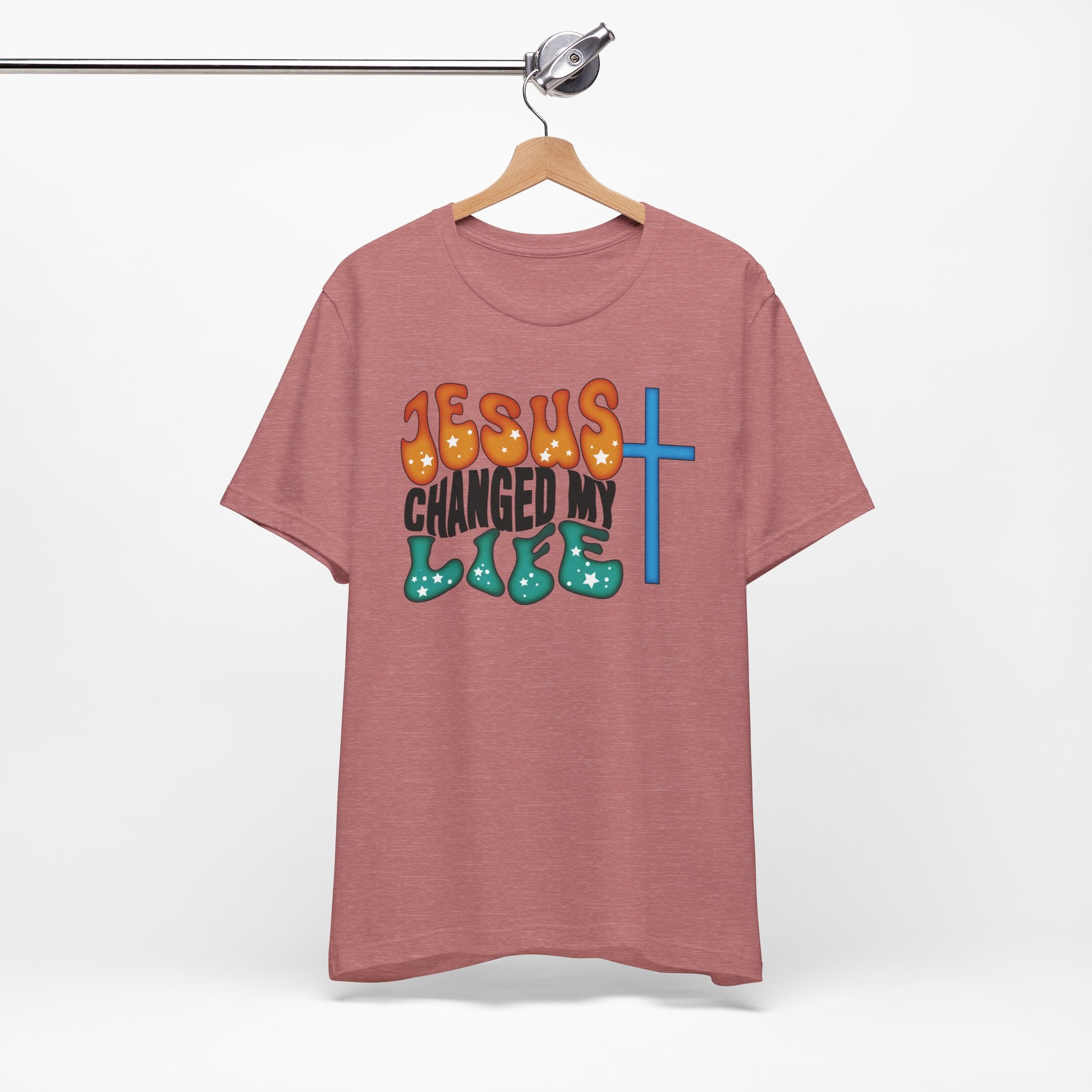 Jesus Changed My Life tee • a vibrant, retro-style Christian T-shirt celebrating transformation, grace, and faith through Jesus.