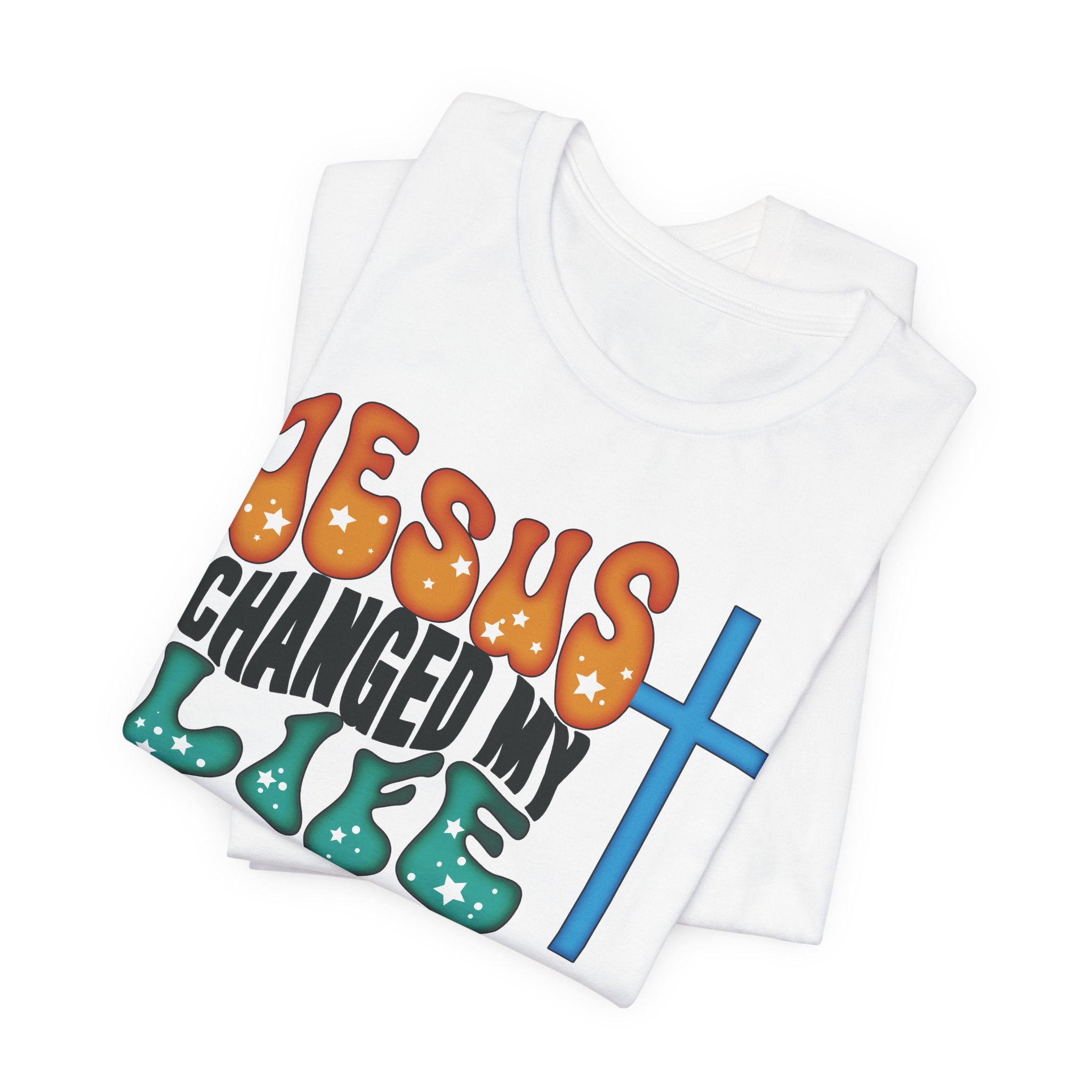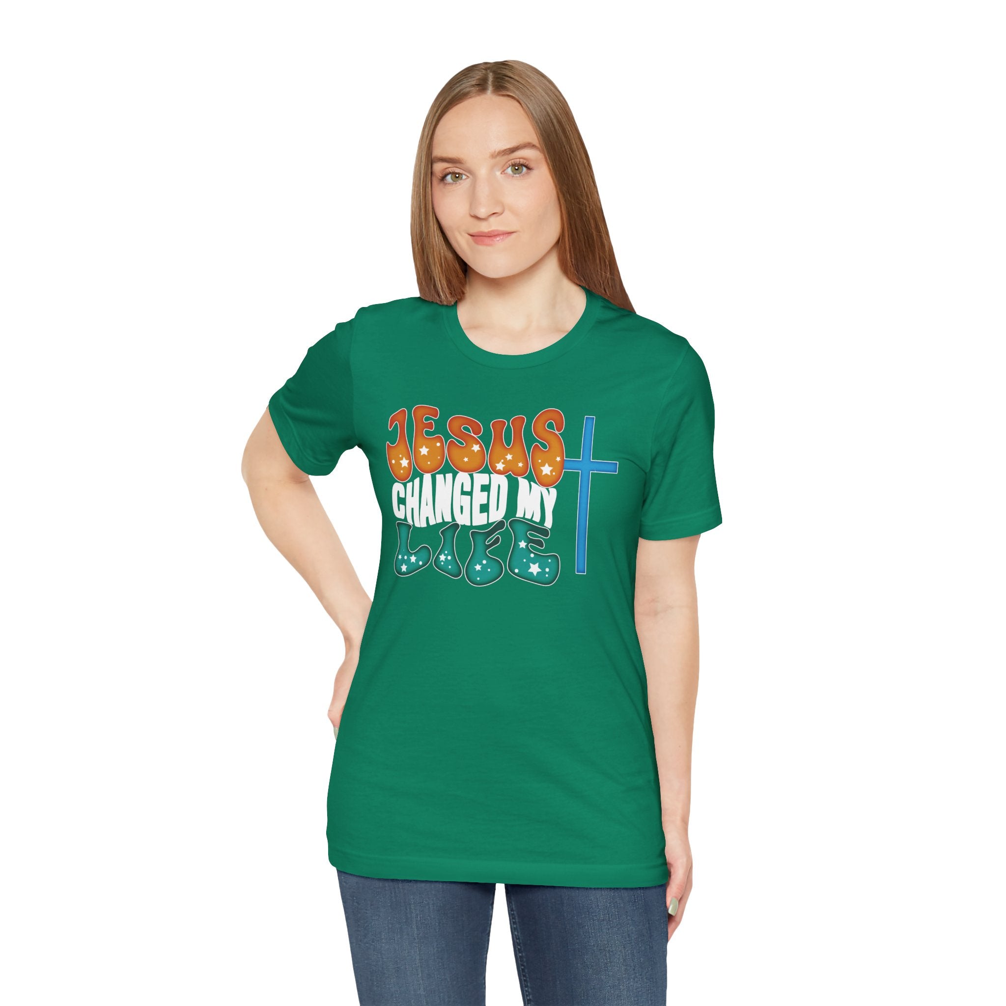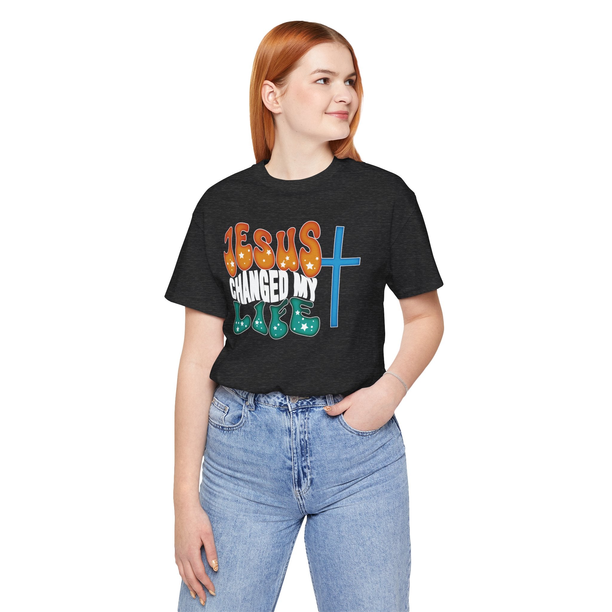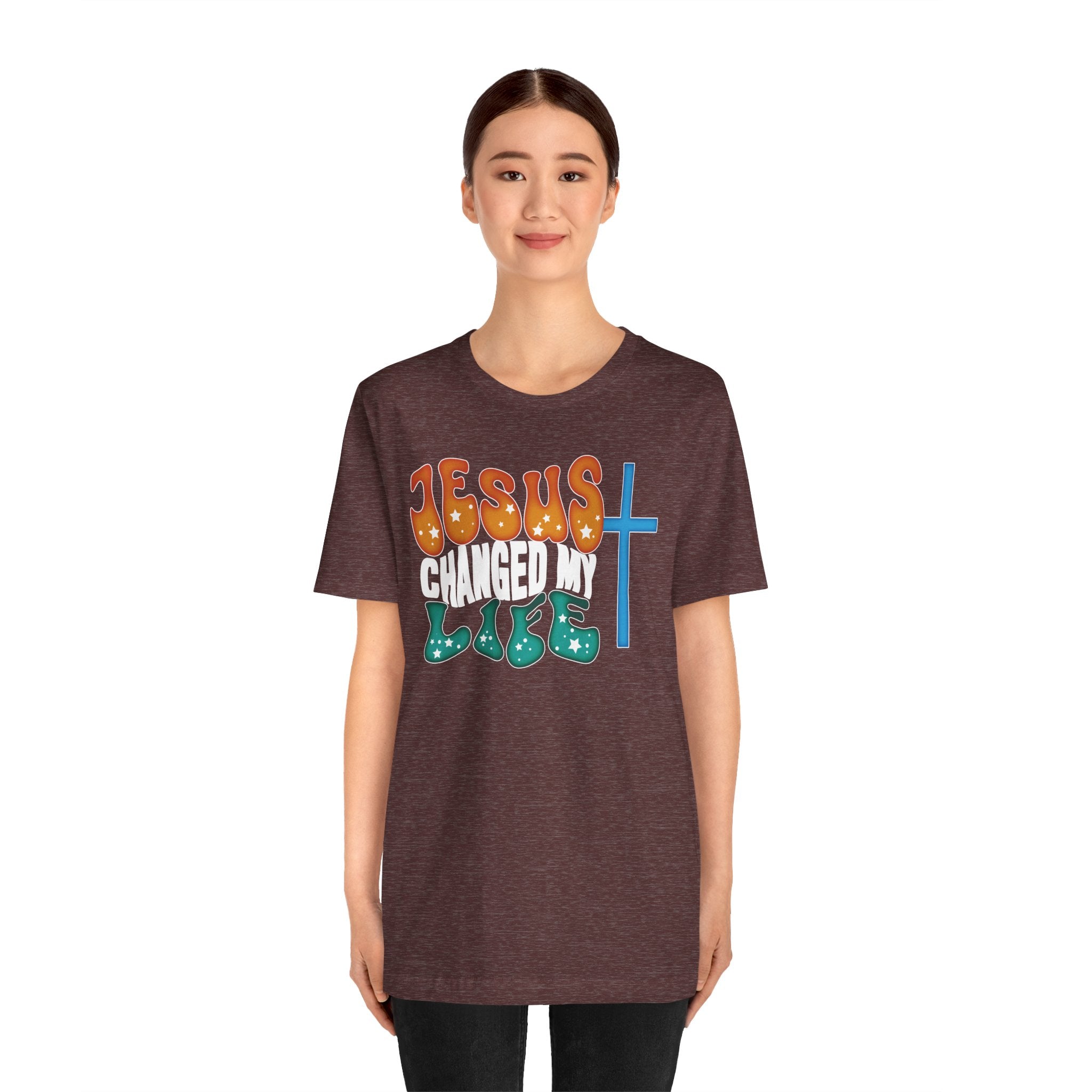 Jesus Changed My Life tee • a vibrant, retro-style Christian T-shirt celebrating transformation, grace, and faith through Jesus.