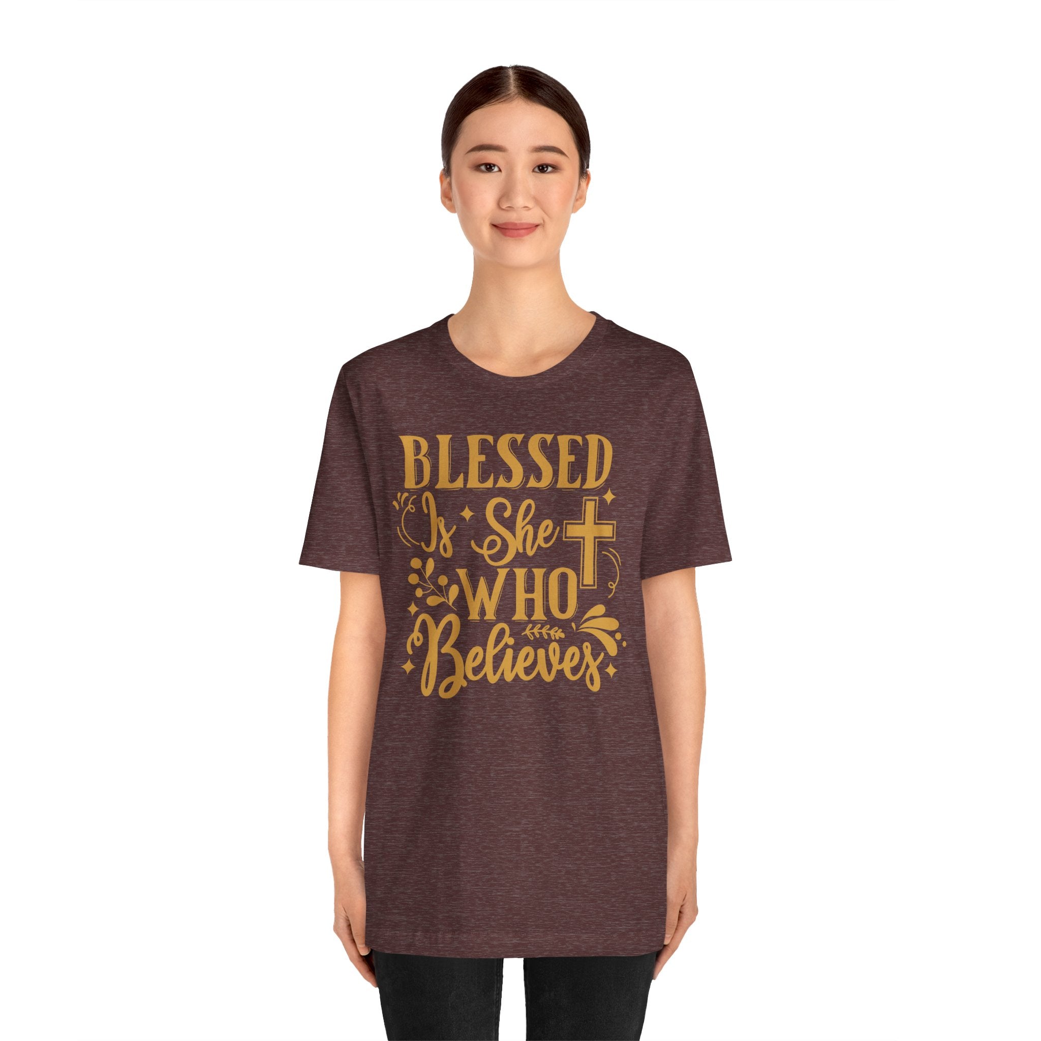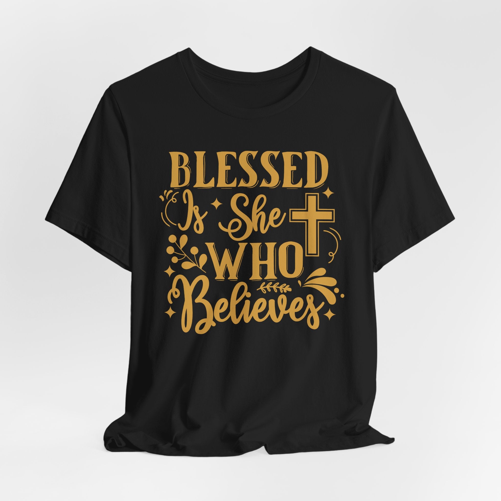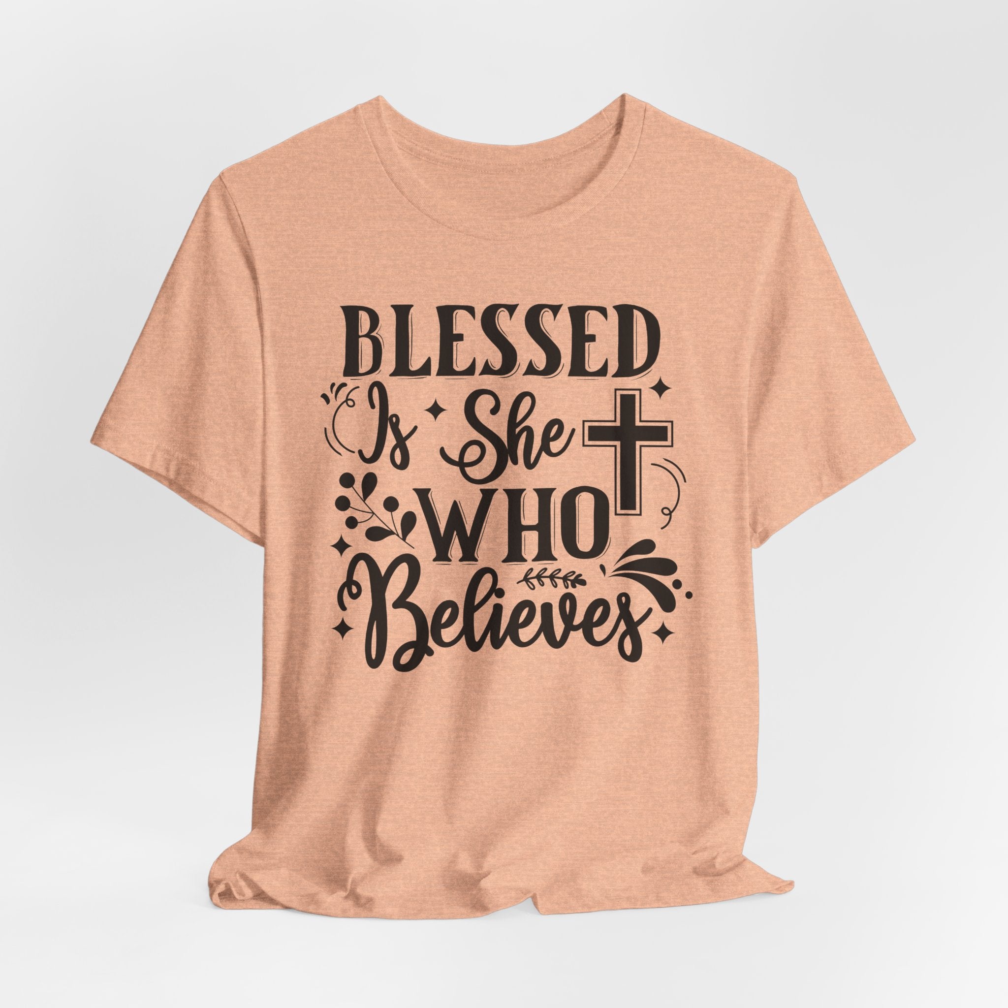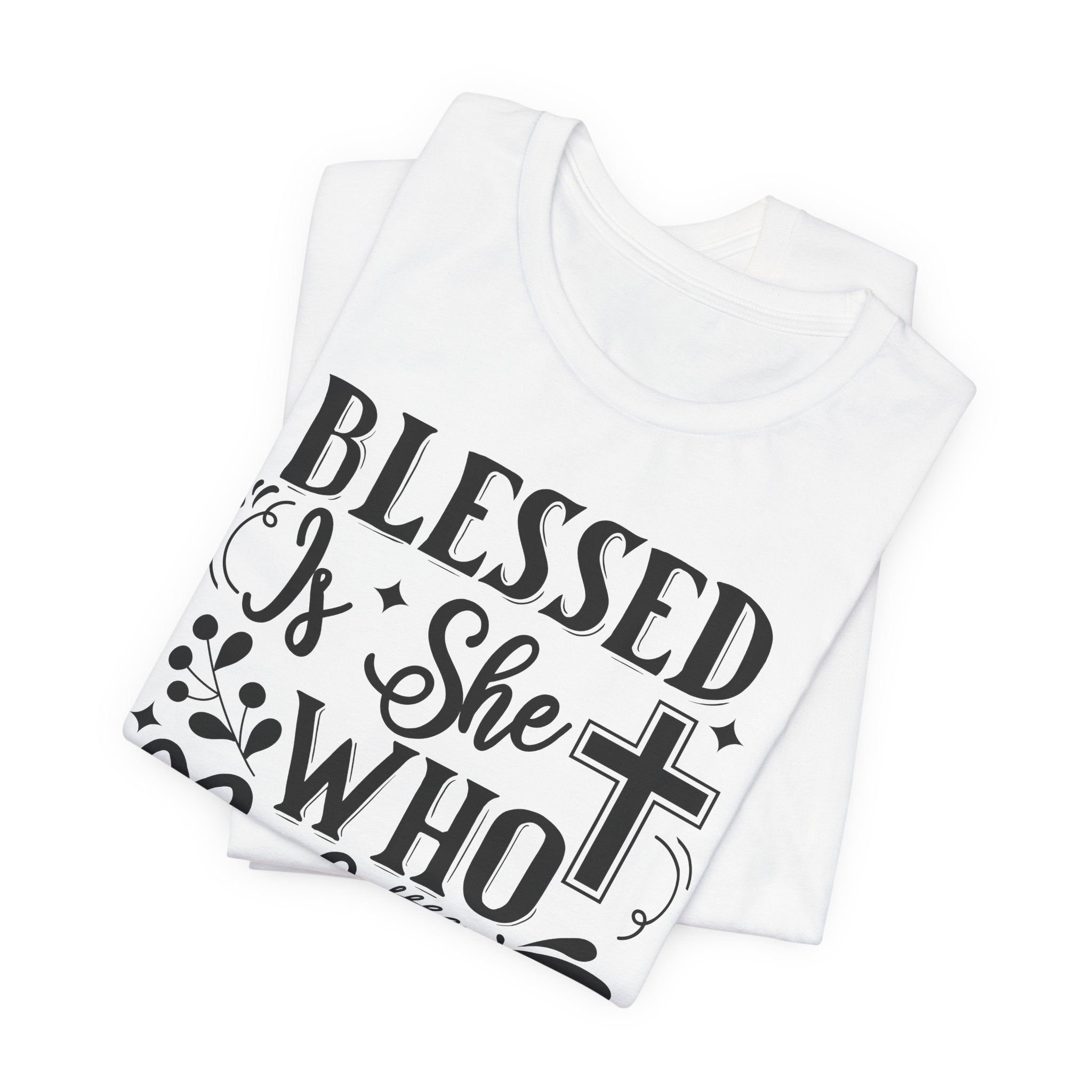 Blessed Is She Who Believes tee • a graceful and uplifting Christian T-shirt celebrating women of faith who trust God’s promises with unwavering belief.