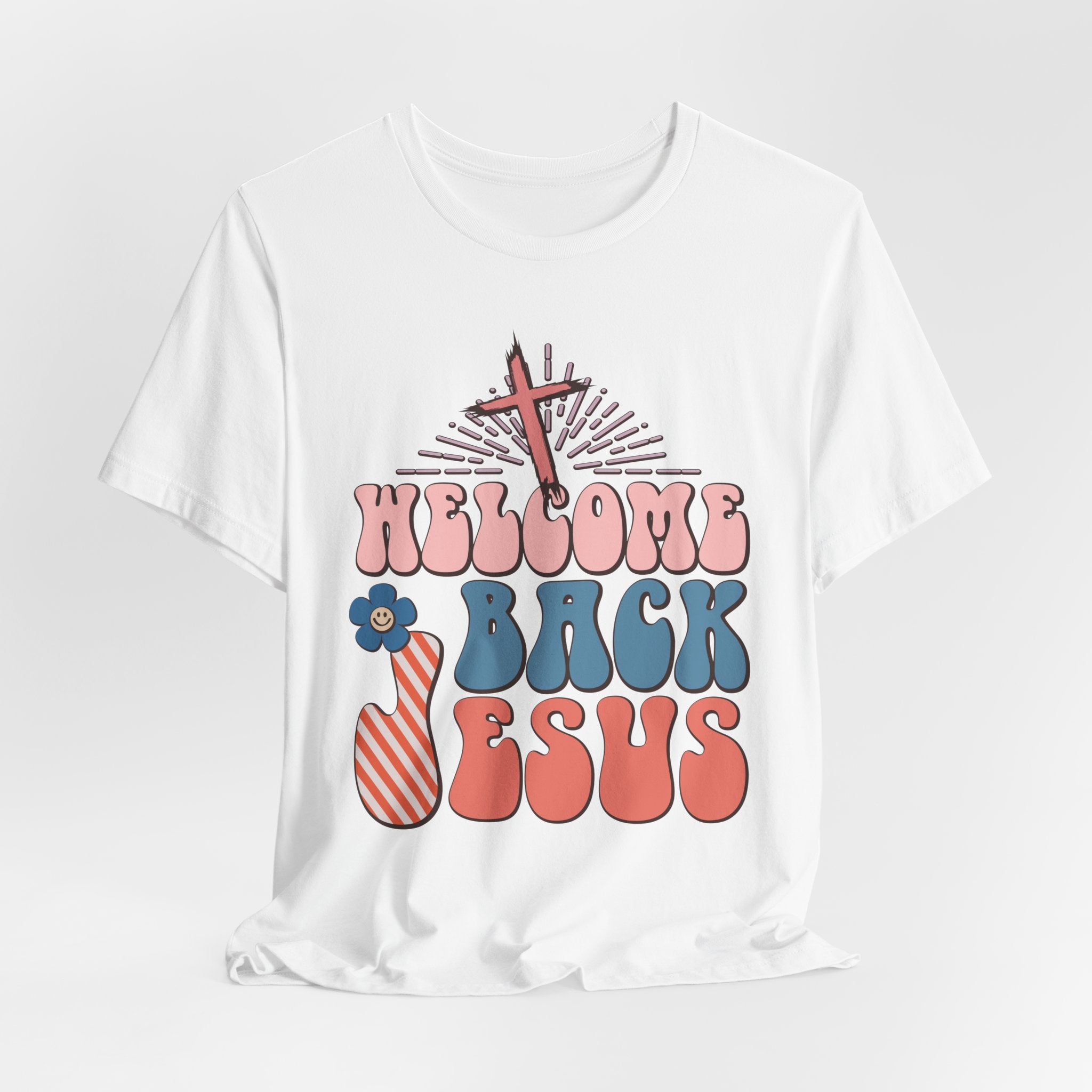 Welcome Back Jesus tee — a joyful, retro-style Christian T-shirt celebrating the hope and praise of His return.