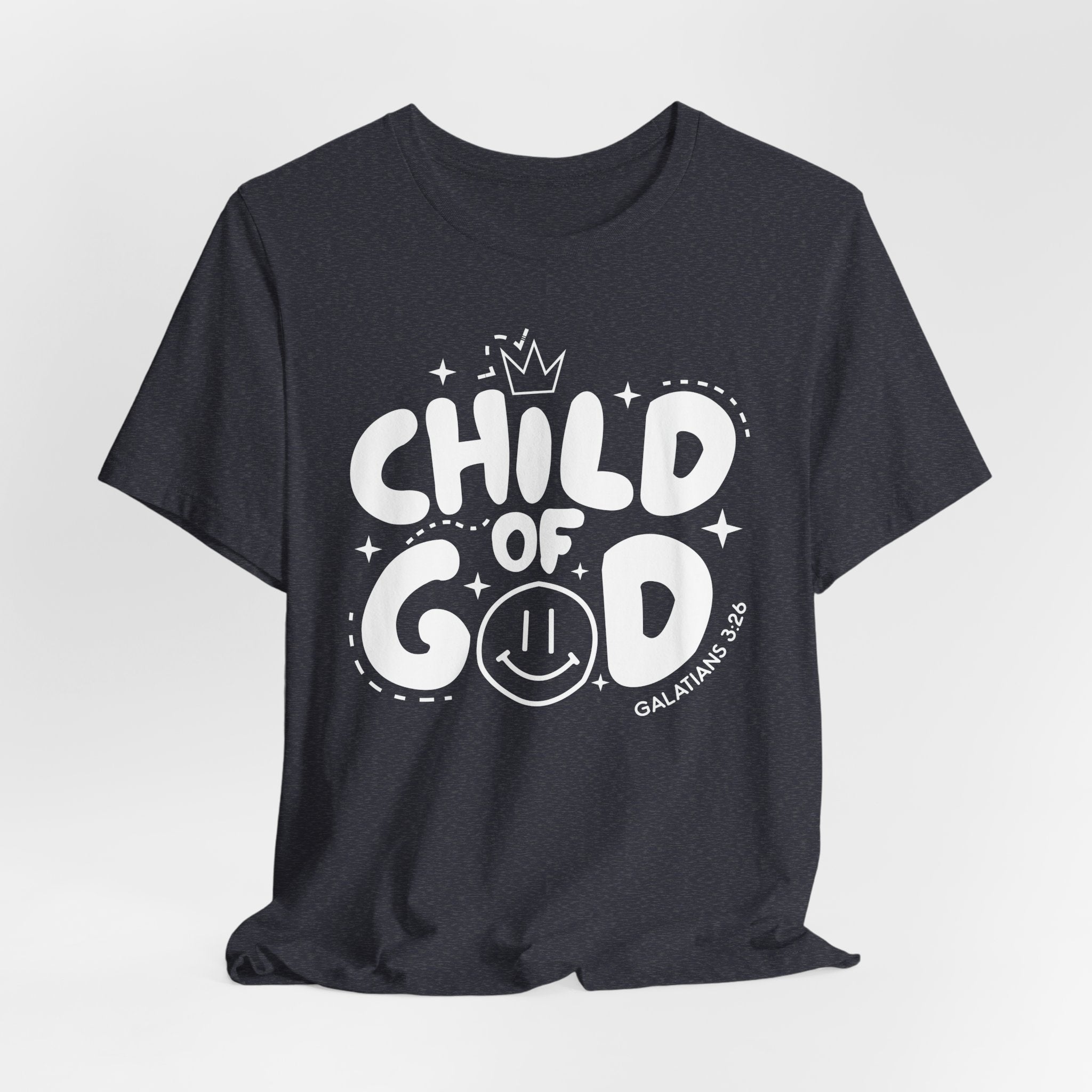 Child of God tee — a joyful, playful Christian T-shirt celebrating your identity in Christ, inspired by Galatians 3:26.