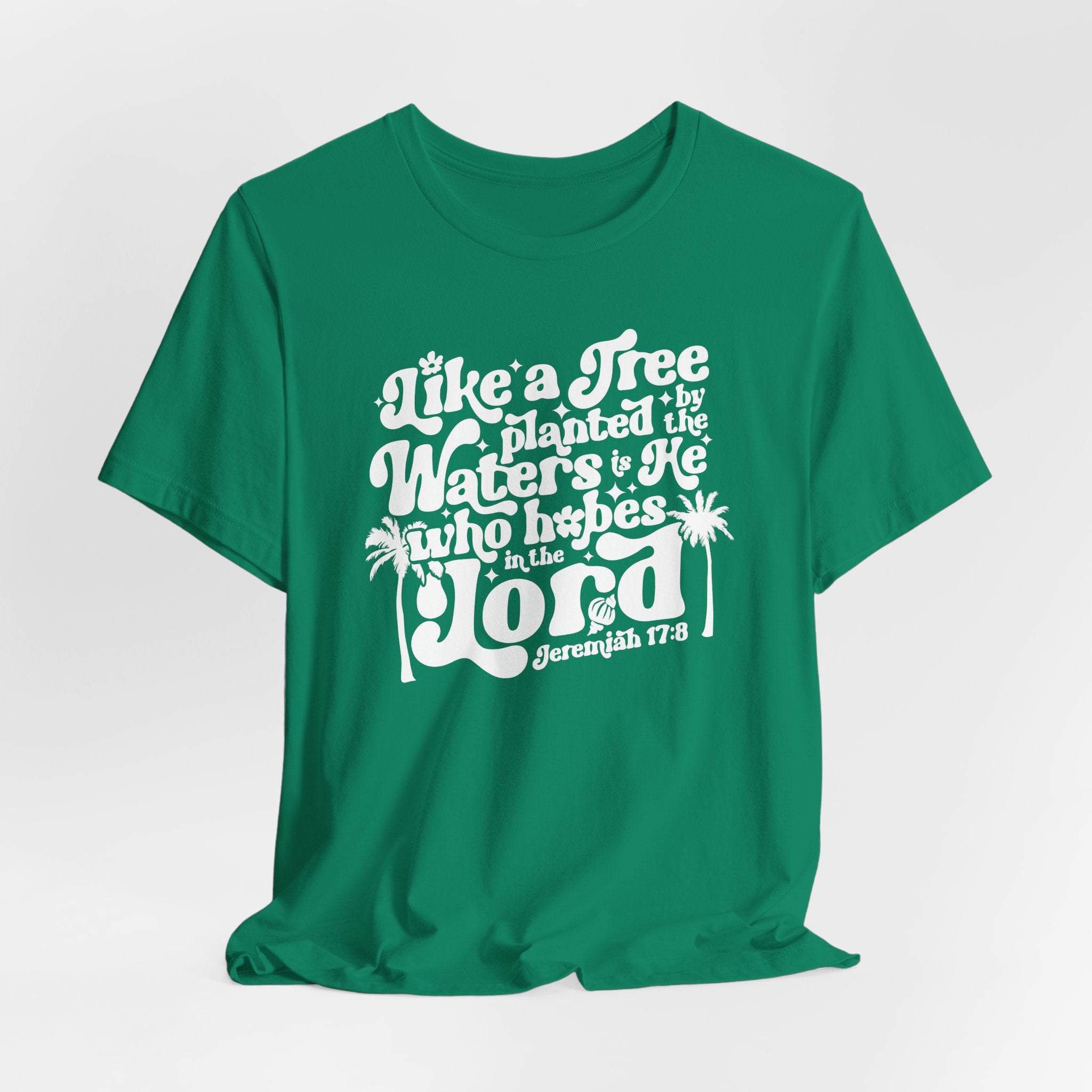 Like a Tree Planted tee — a groovy, retro Christian T-shirt celebrating the blessed hope of Jeremiah 17:8.