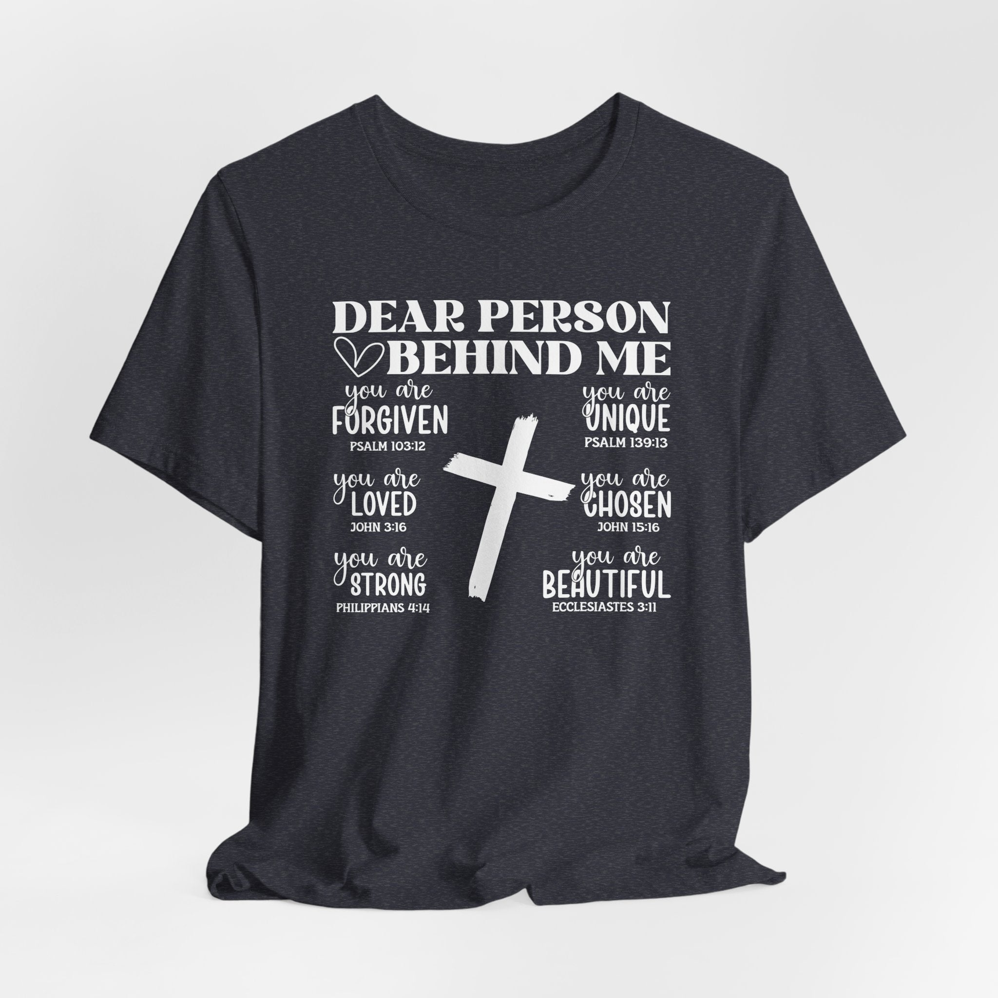 Dear Person Behind Me tee • an uplifting, faith-filled Christian T-shirt reminding others they are loved, forgiven, chosen, and strong in Christ.
