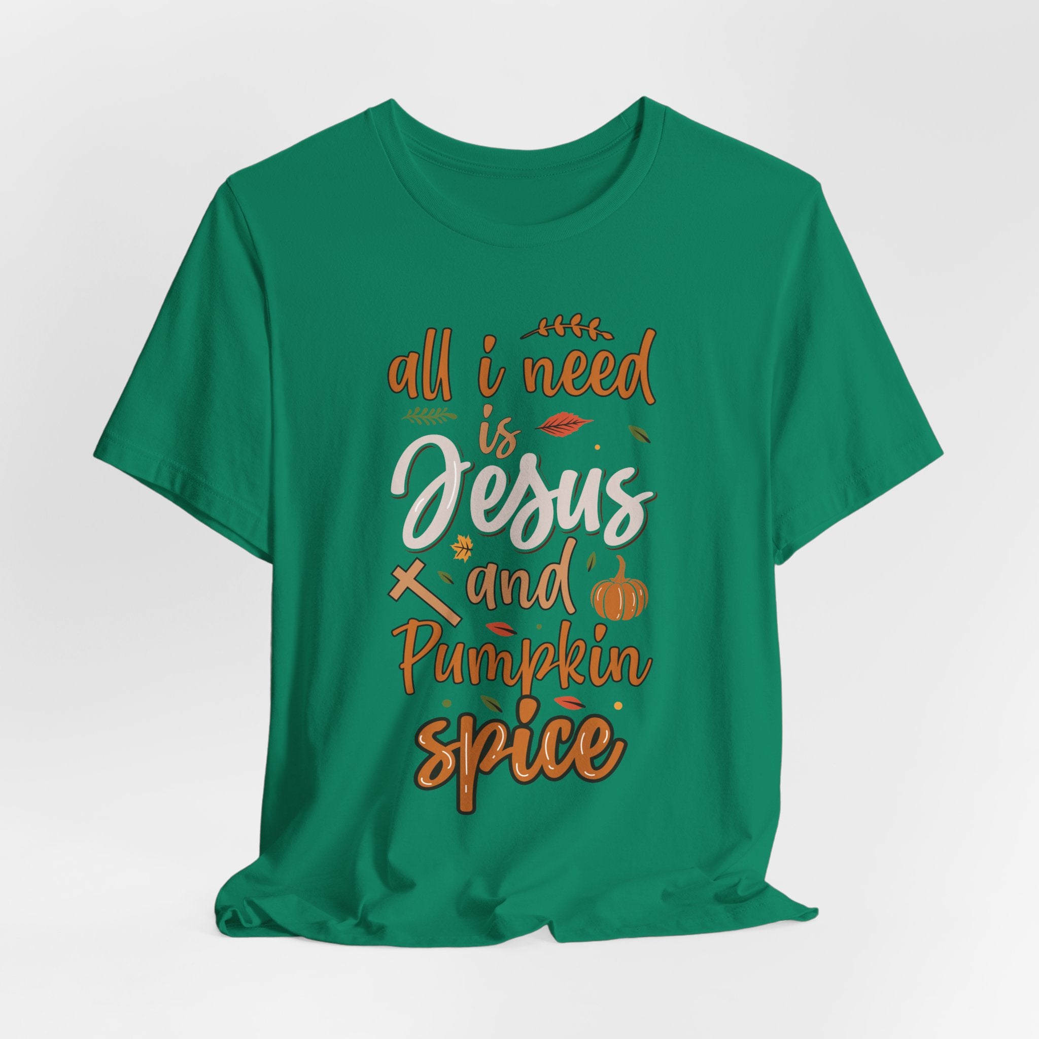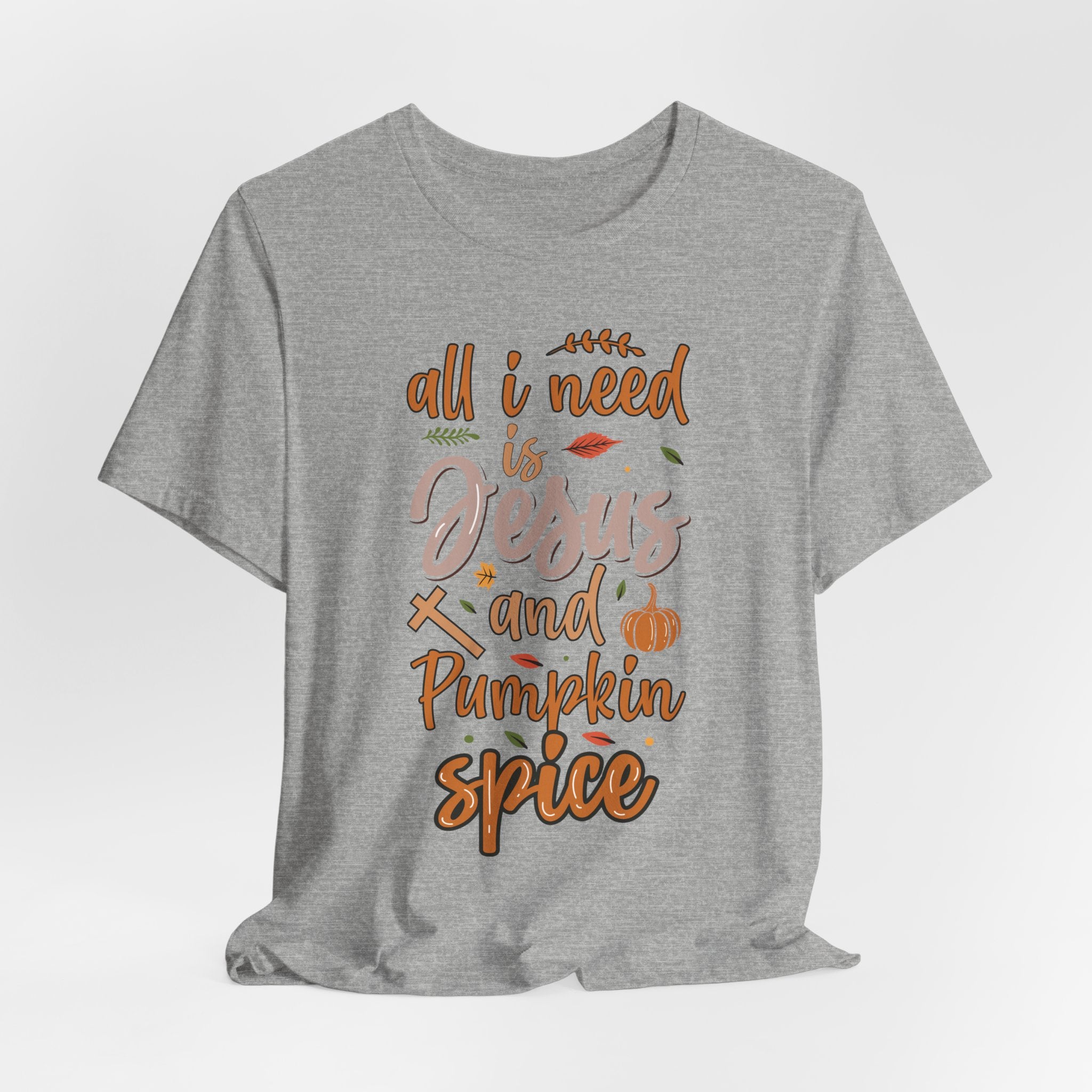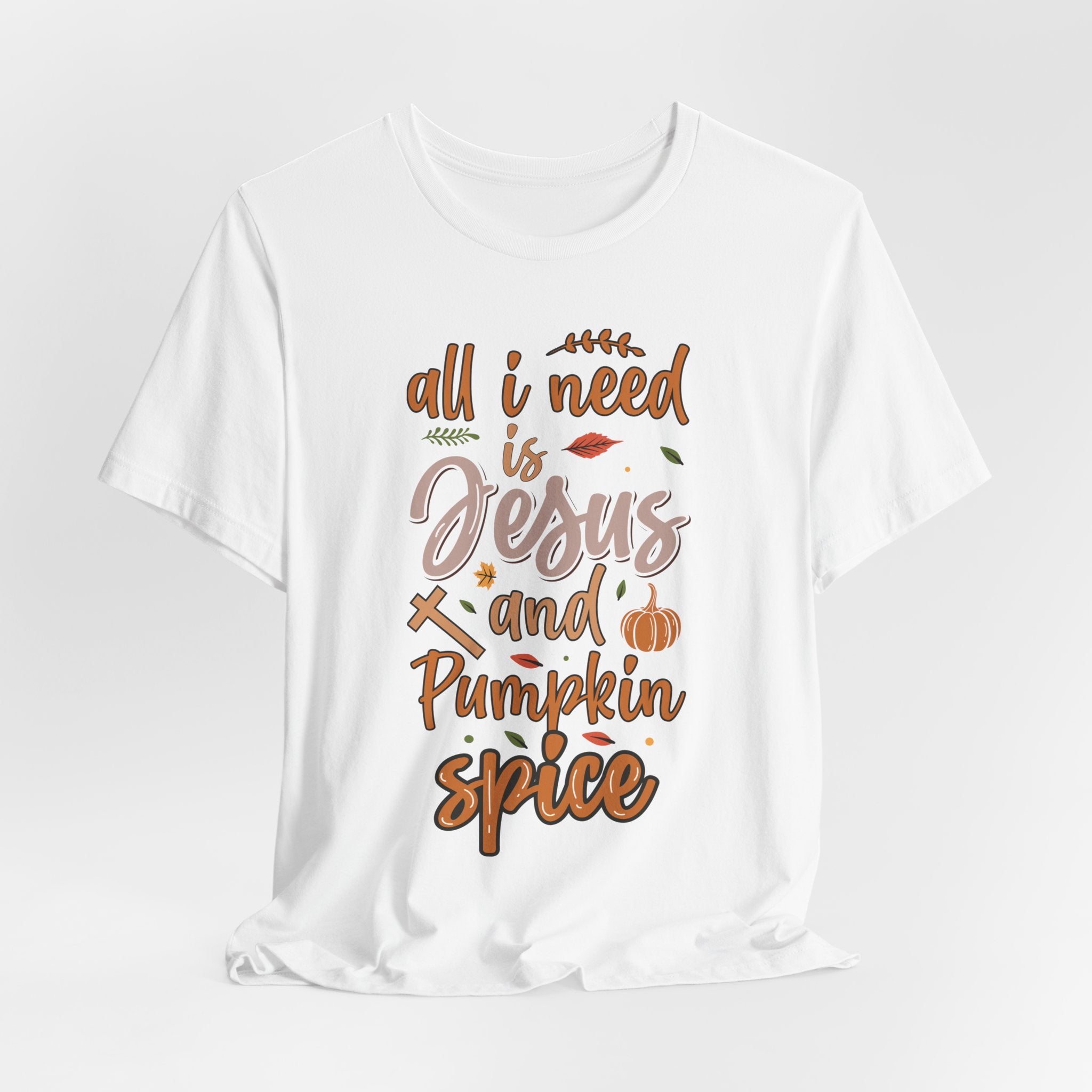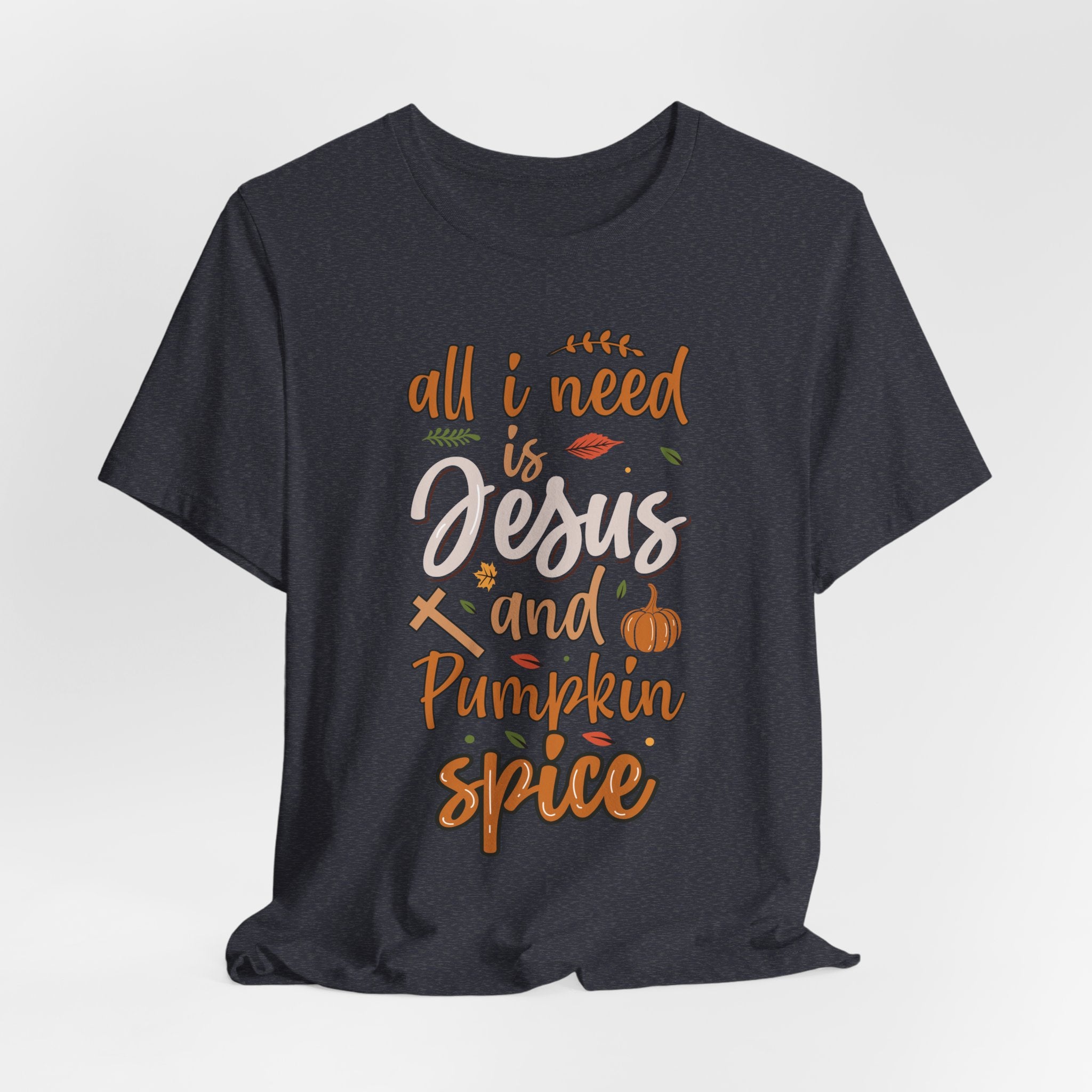 All I Need Is Jesus and Pumpkin Spice tee • a cozy, faith-inspired Christian T-shirt that blends autumn charm with gratitude for God’s blessings — perfect for fall days and coffee lovers alike.