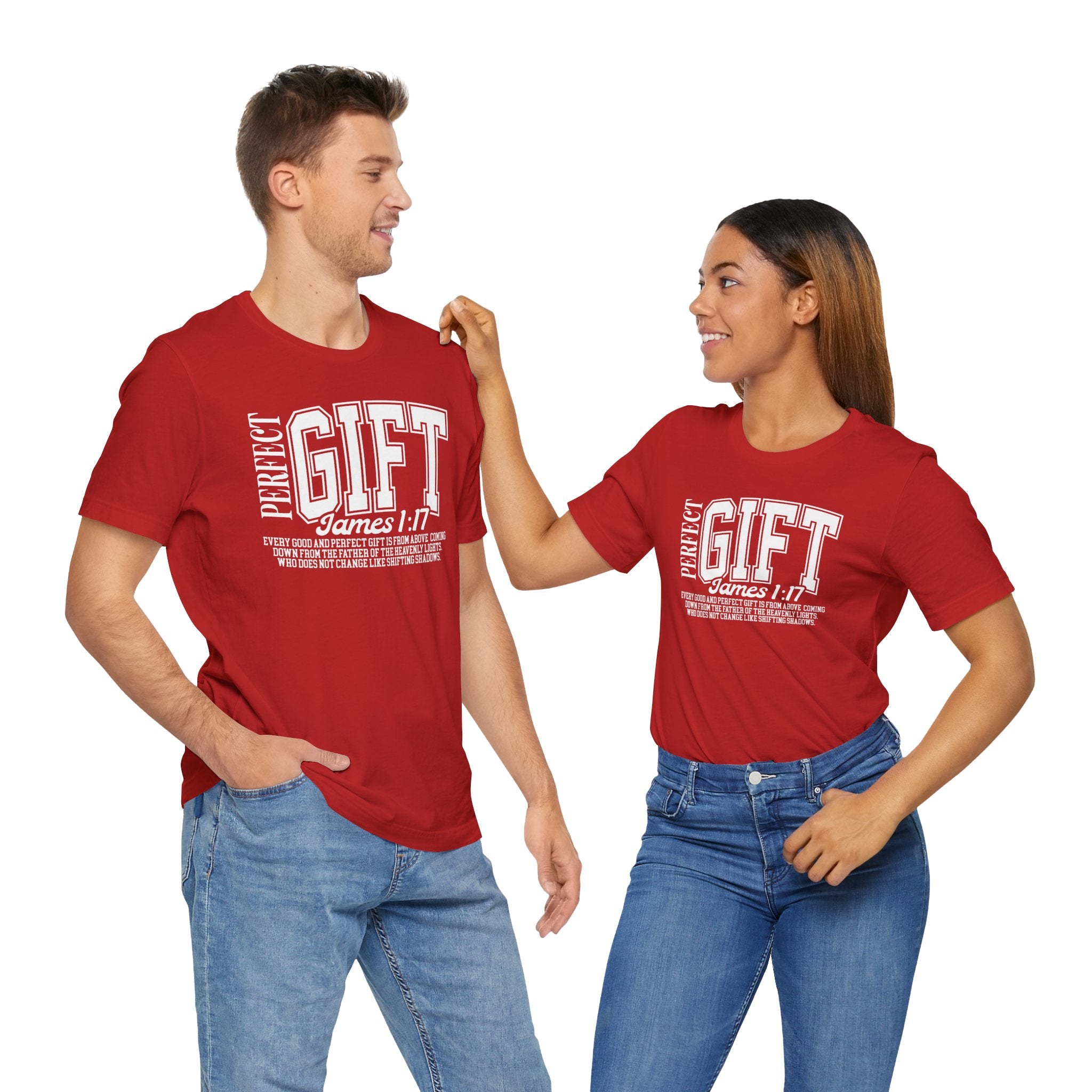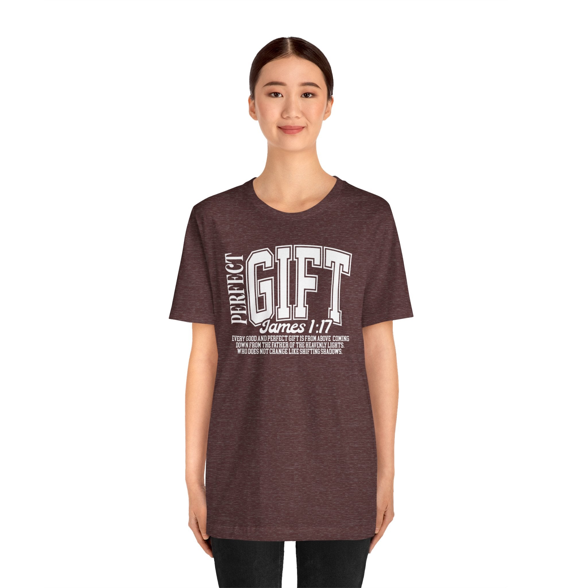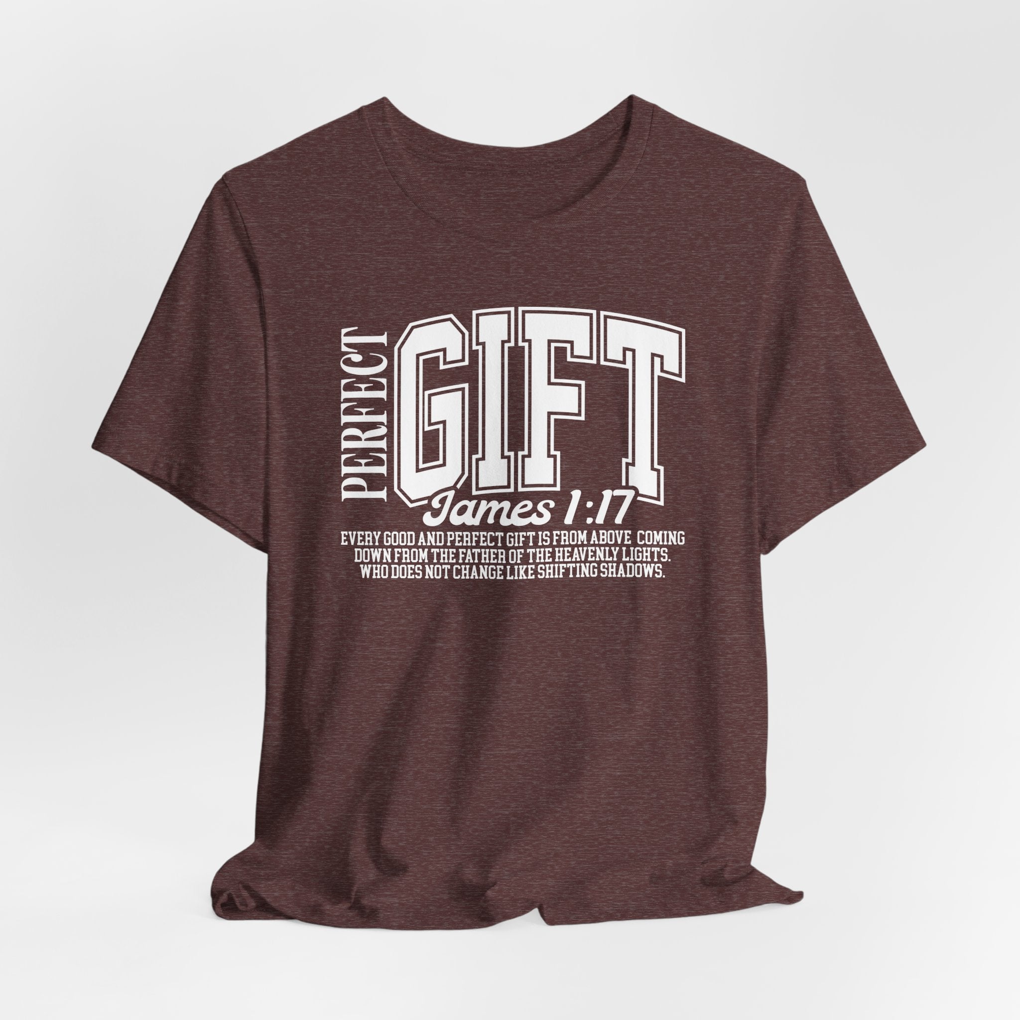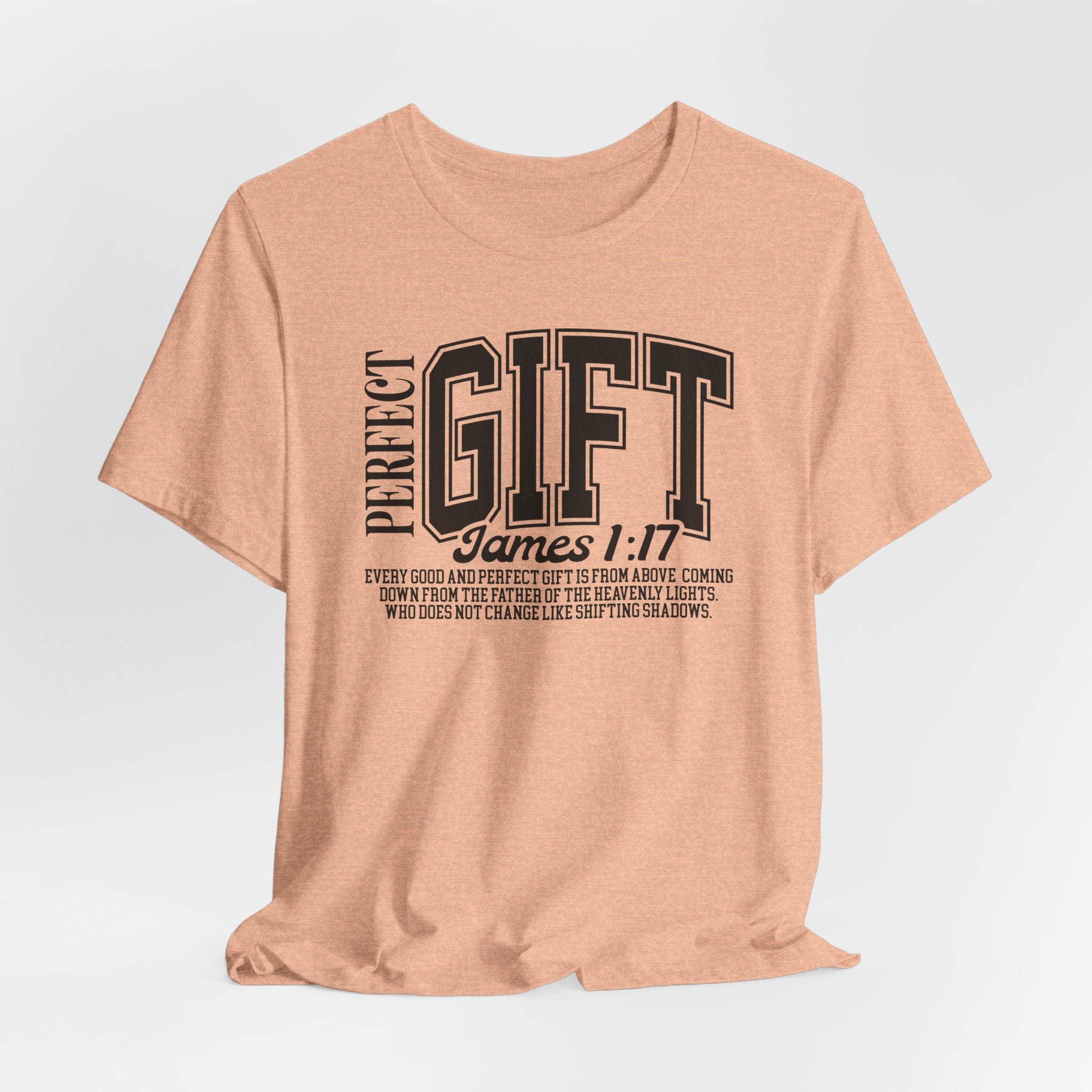 Scriptural Truth — this “Perfect Gift” T-shirt displays James 1:17, proclaiming that every blessing and perfect gift is from our unchanging Father above.