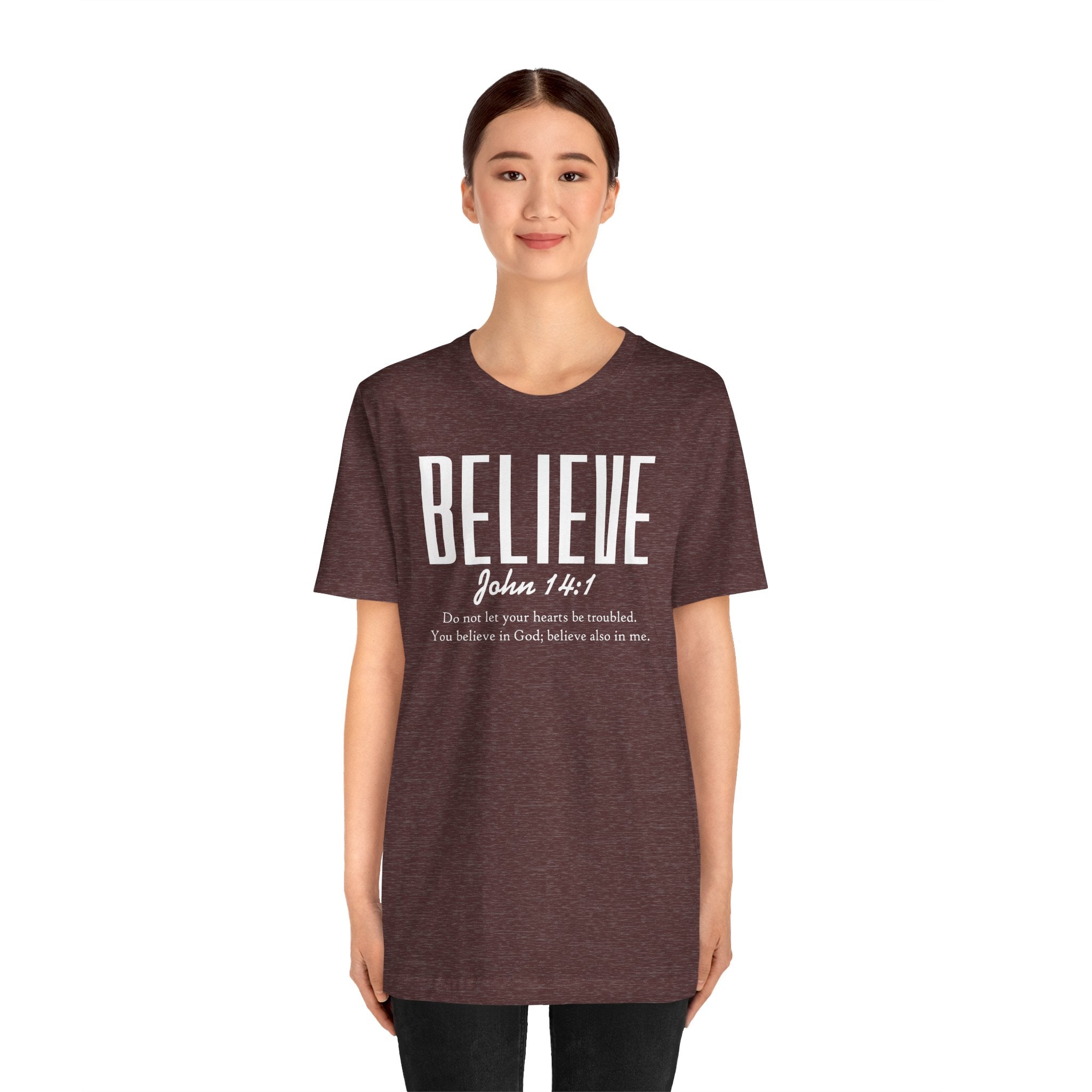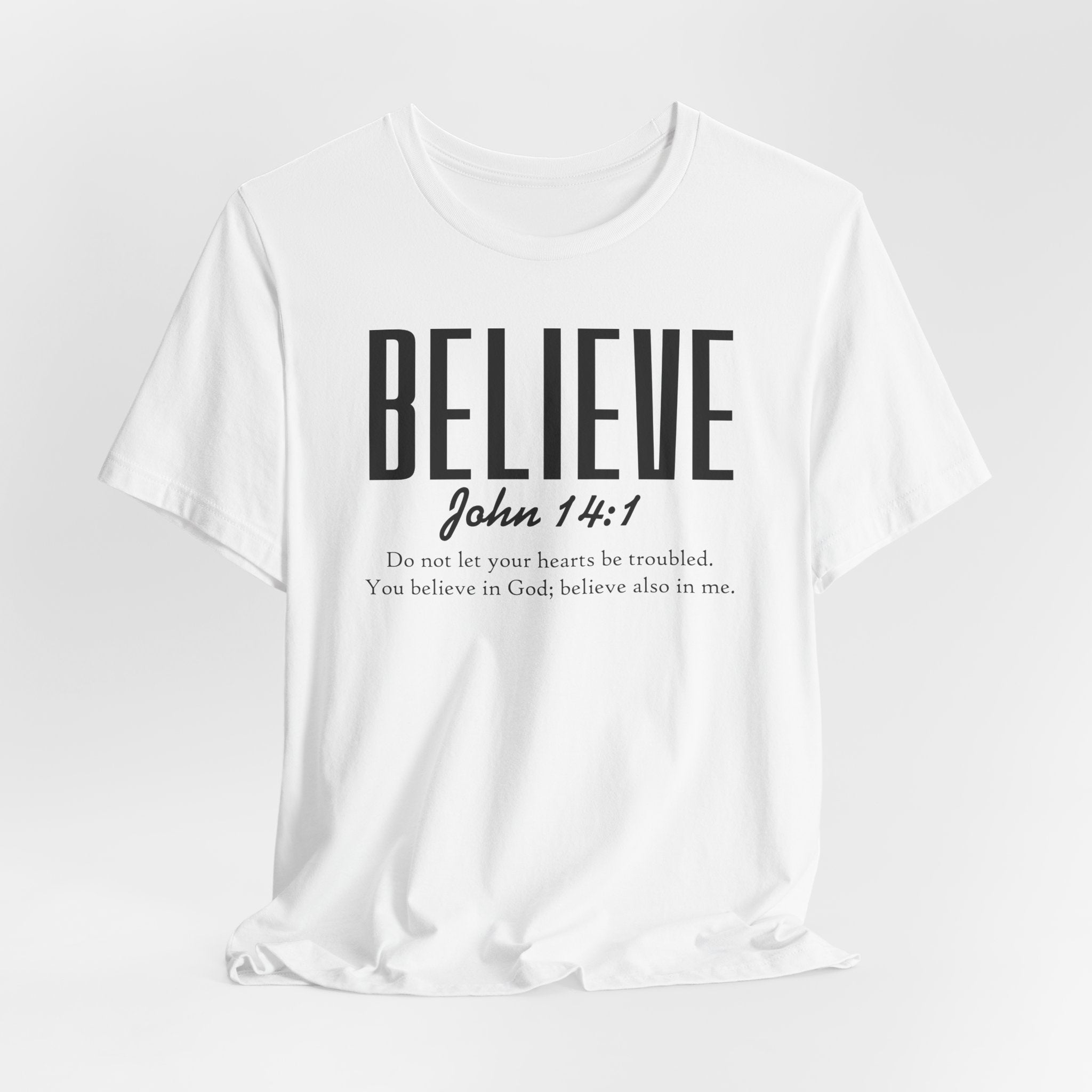 Believe John 14:1 tee — a calm, faith-centered Christian T-shirt reminding believers to trust in God’s promises and rest in His peace with unwavering belief.