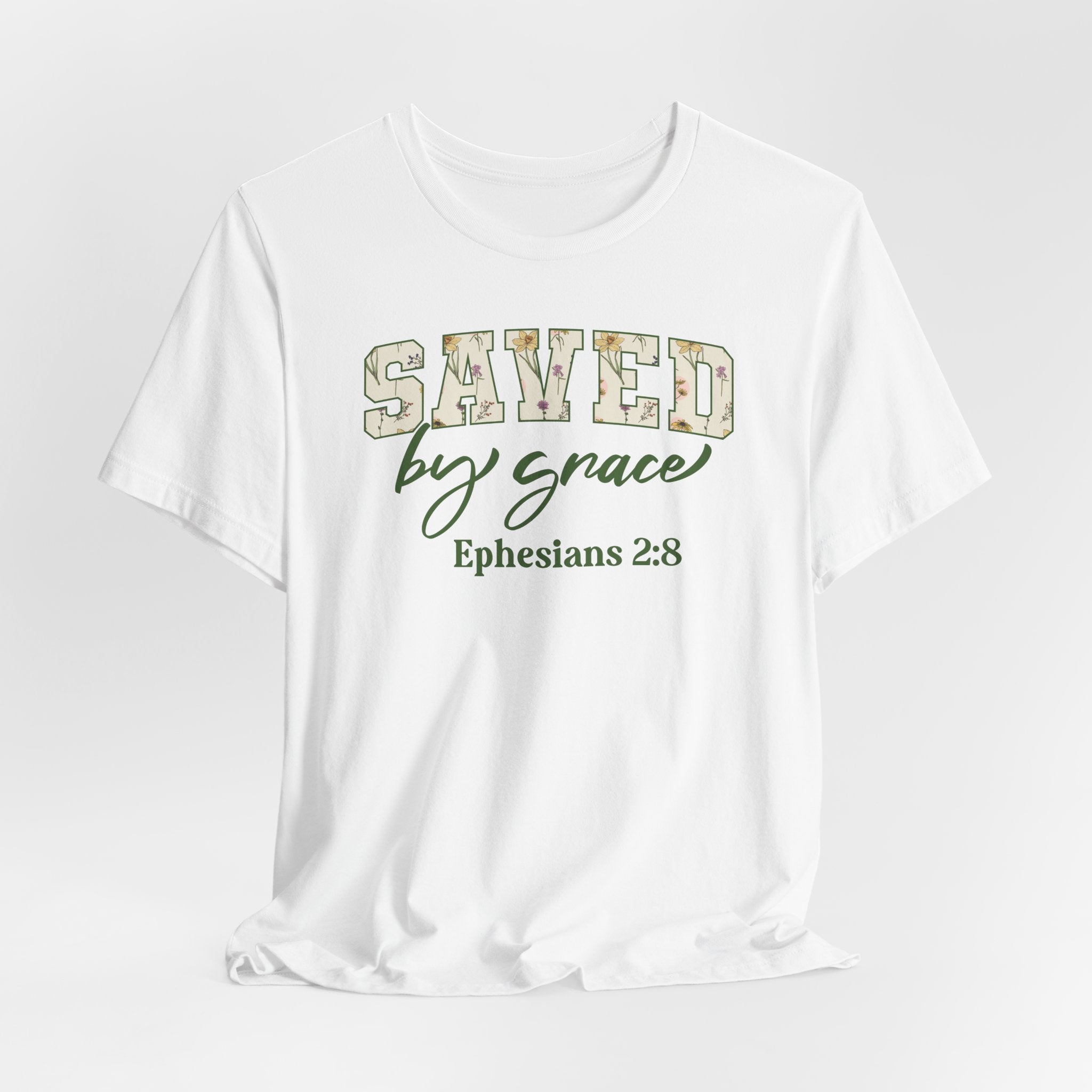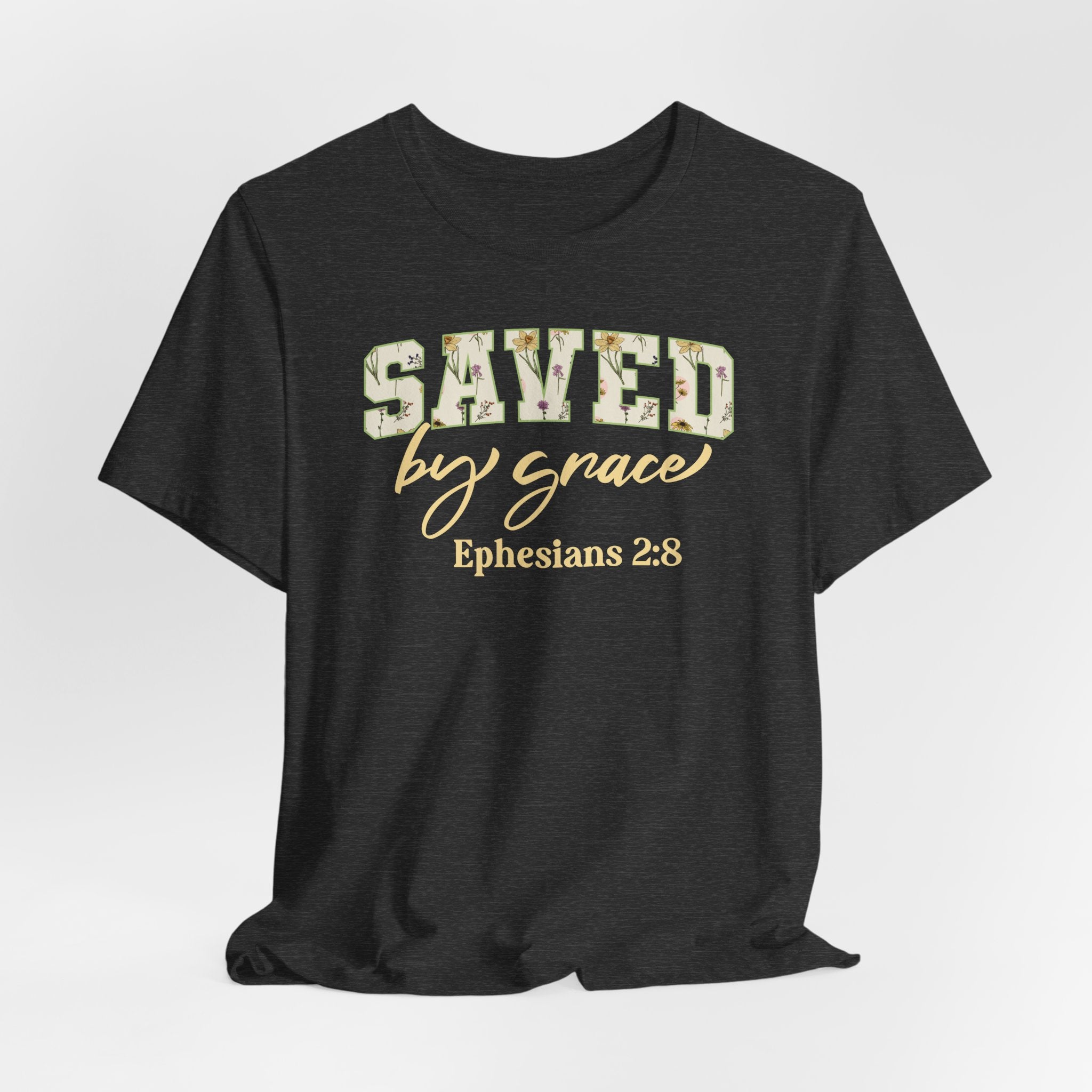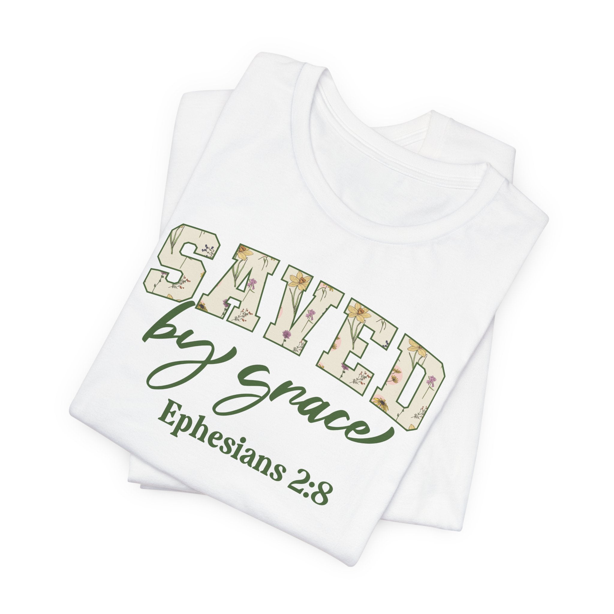 Saved by Grace tee — a soft and floral Christian T-shirt inspired by Ephesians 2:8, celebrating the beauty of God’s gift of salvation through faith alone.