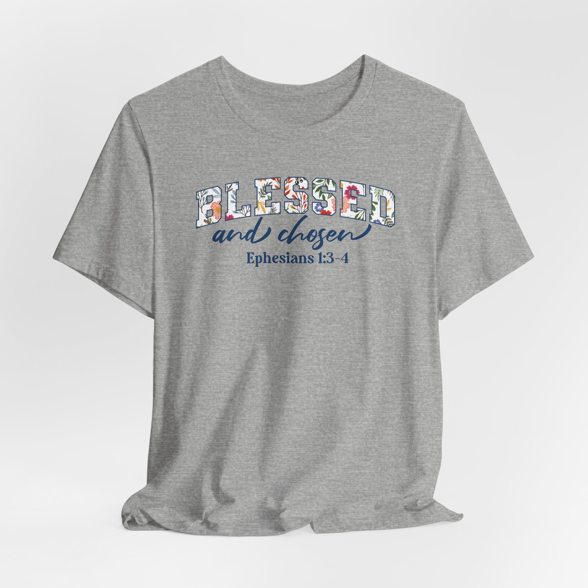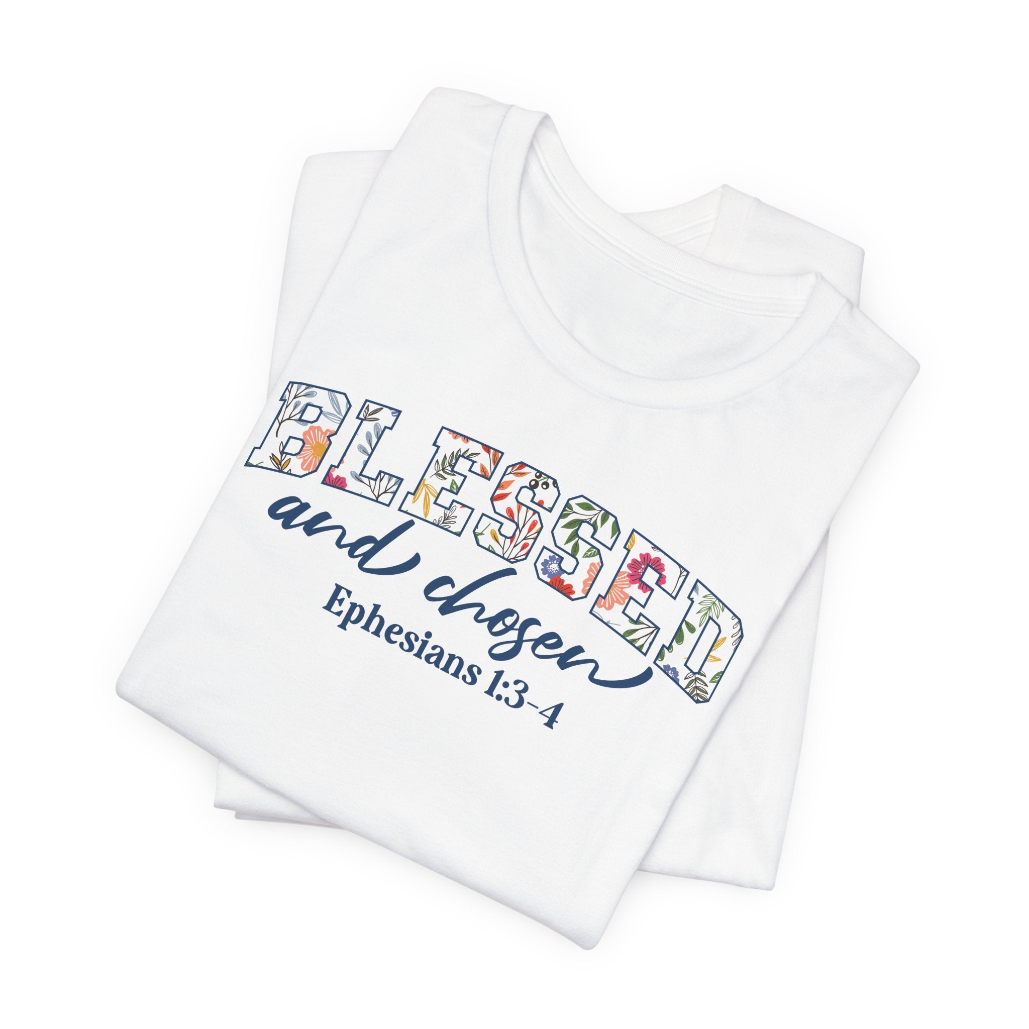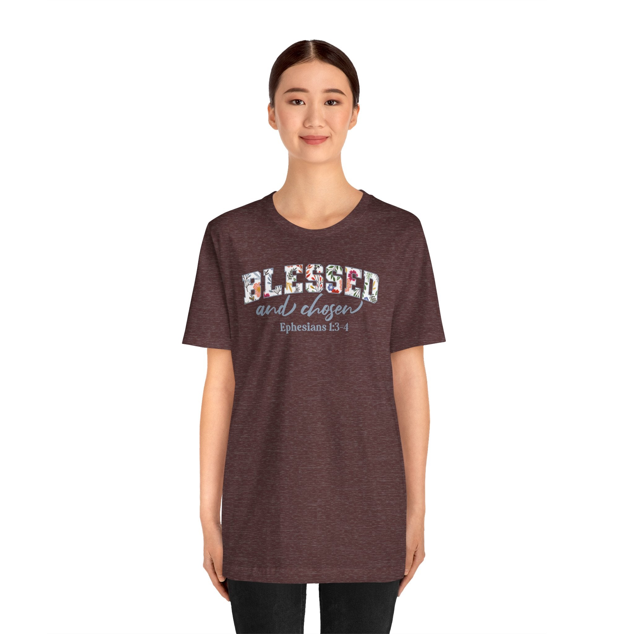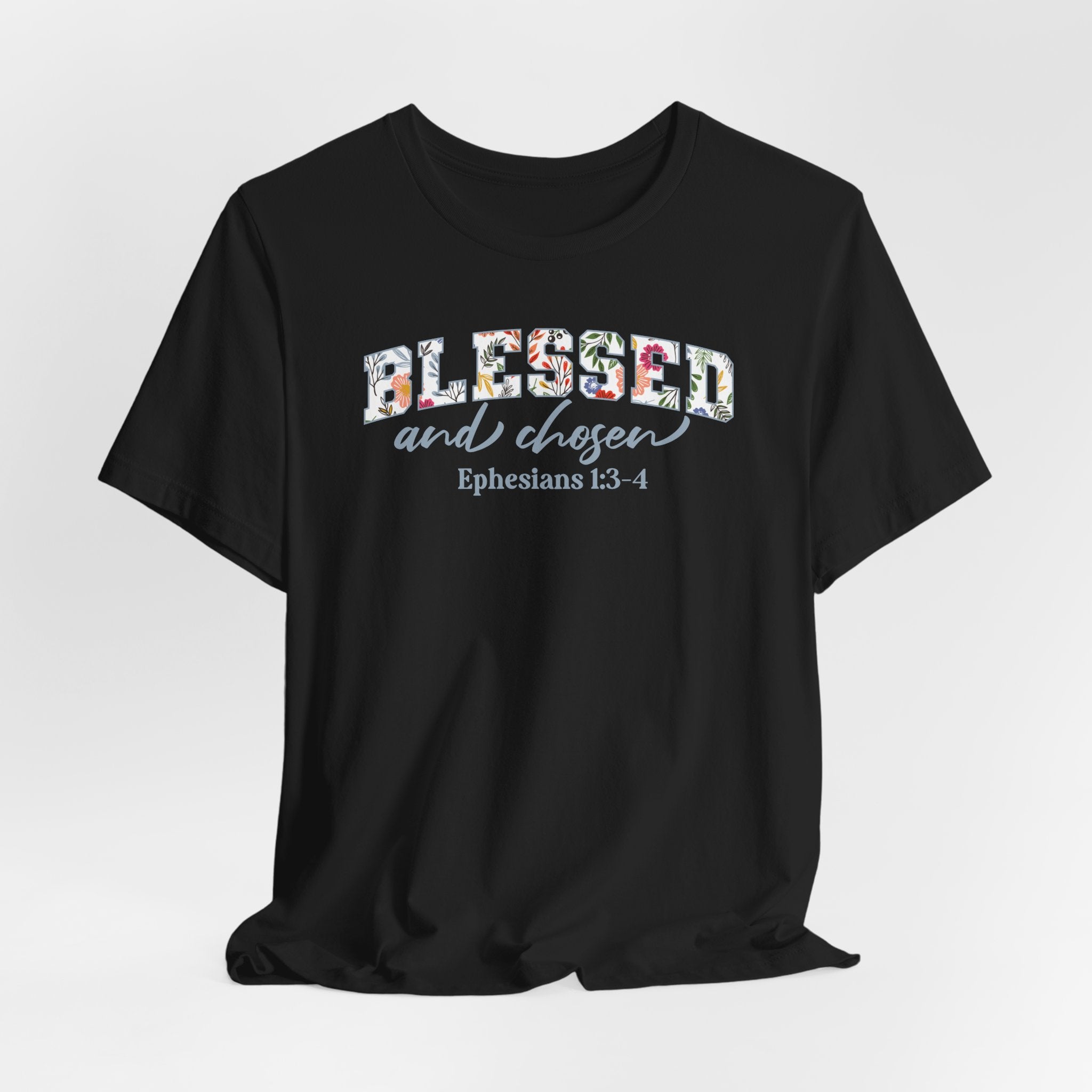 Blessed and Chosen tee • a floral Christian T-shirt inspired by Ephesians 1, celebrating your identity in Christ — chosen, loved, and blessed with grace.