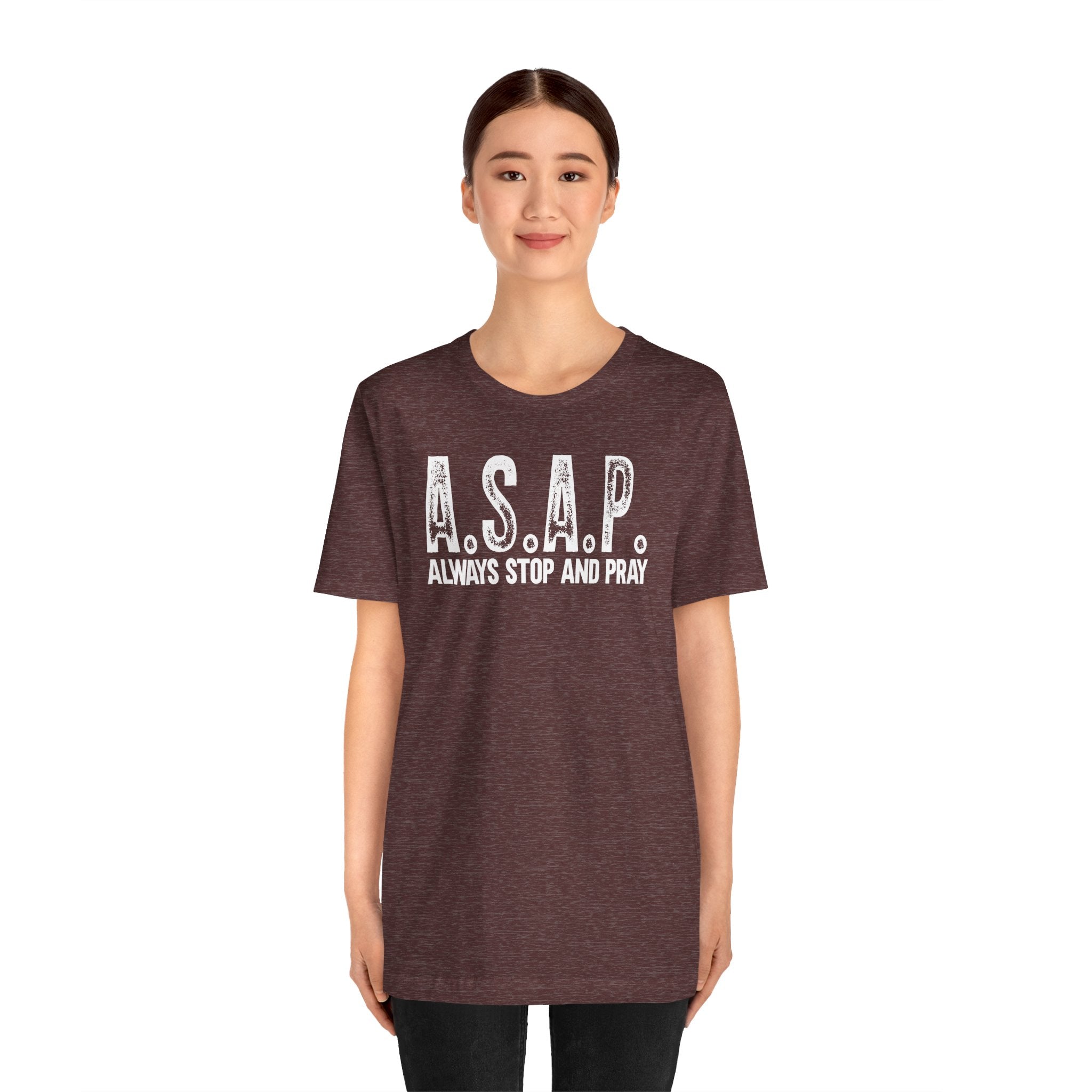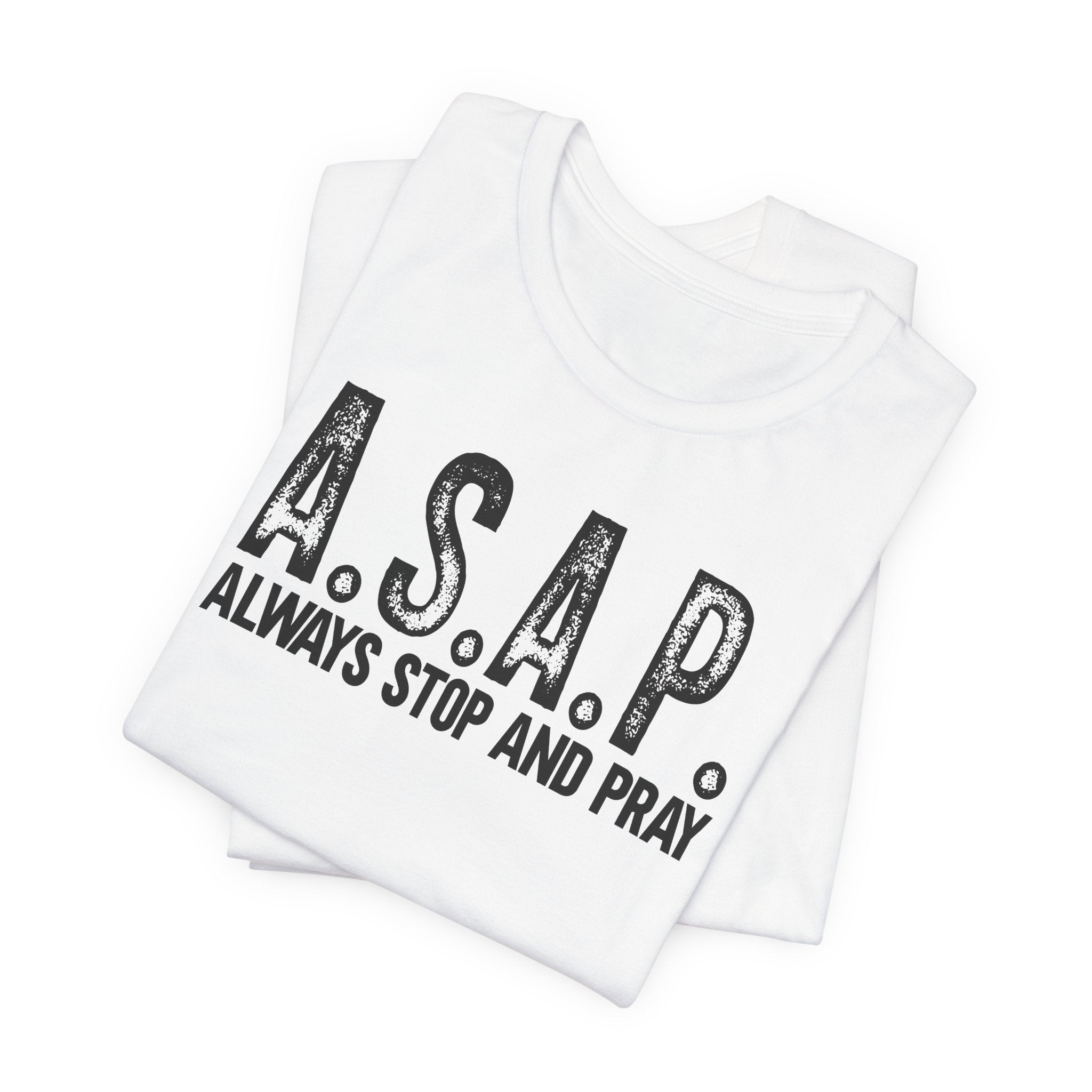 A.S.A.P. tee • a witty and faith-filled Christian T-shirt reminding believers to “Always Stop and Pray” — bold, fun, and full of purpose.