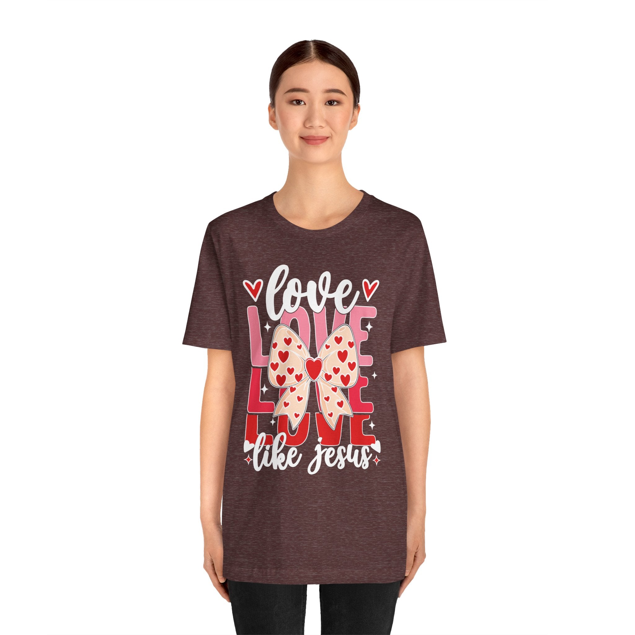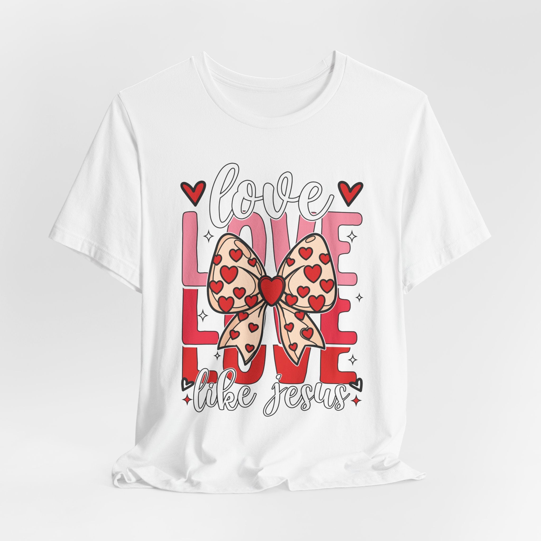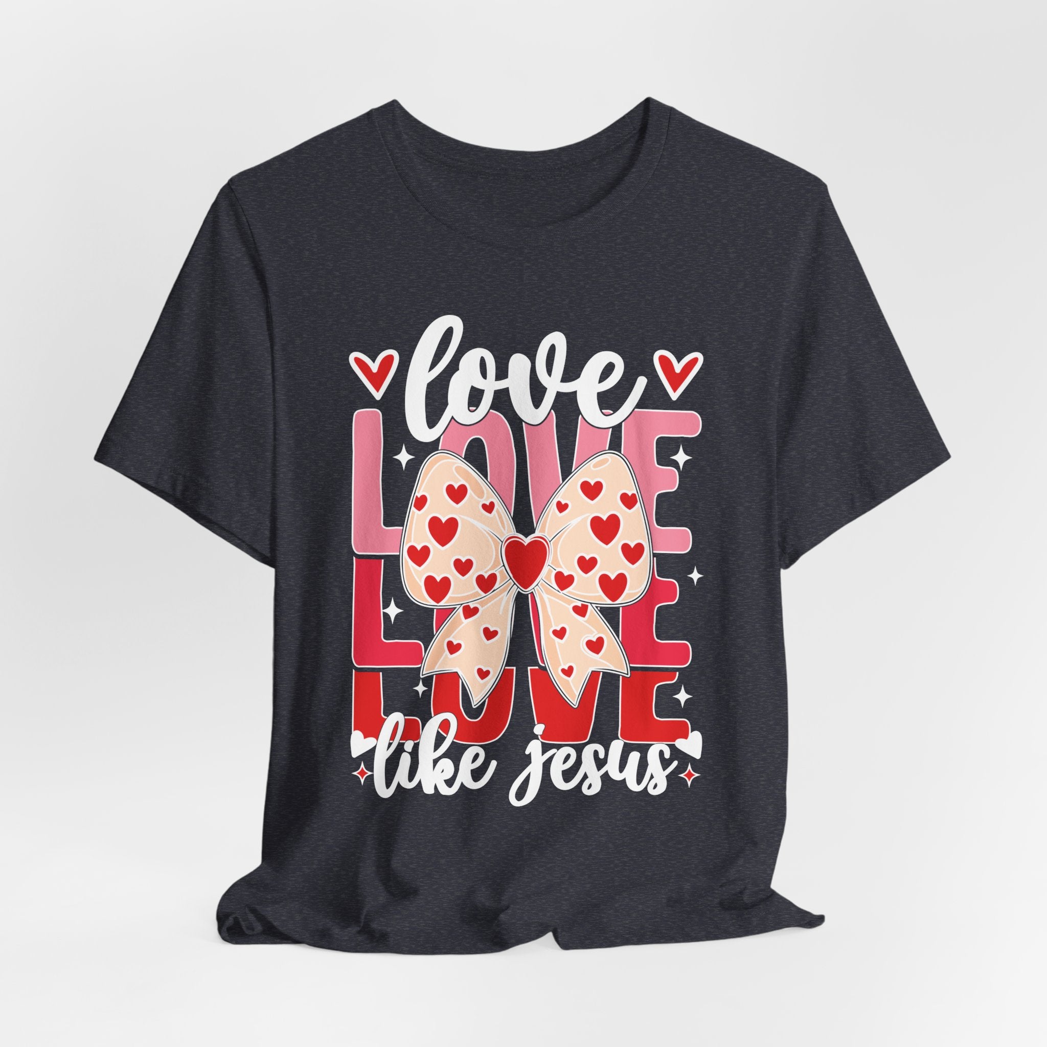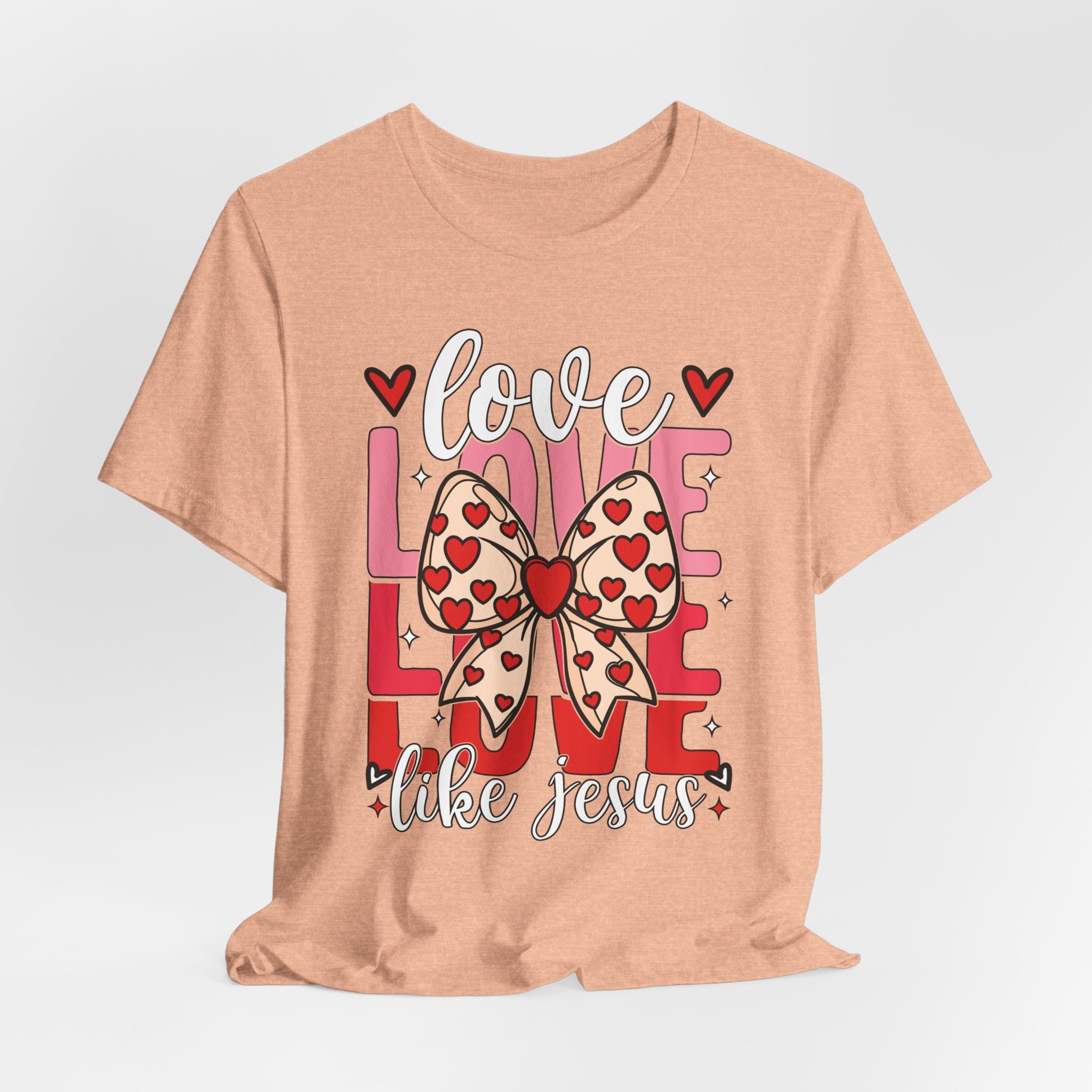 Love Like Jesus tee • a cute, heart-filled Christian T-shirt with a bow design that spreads kindness and joy — perfect for women of faith and Valentine’s season.