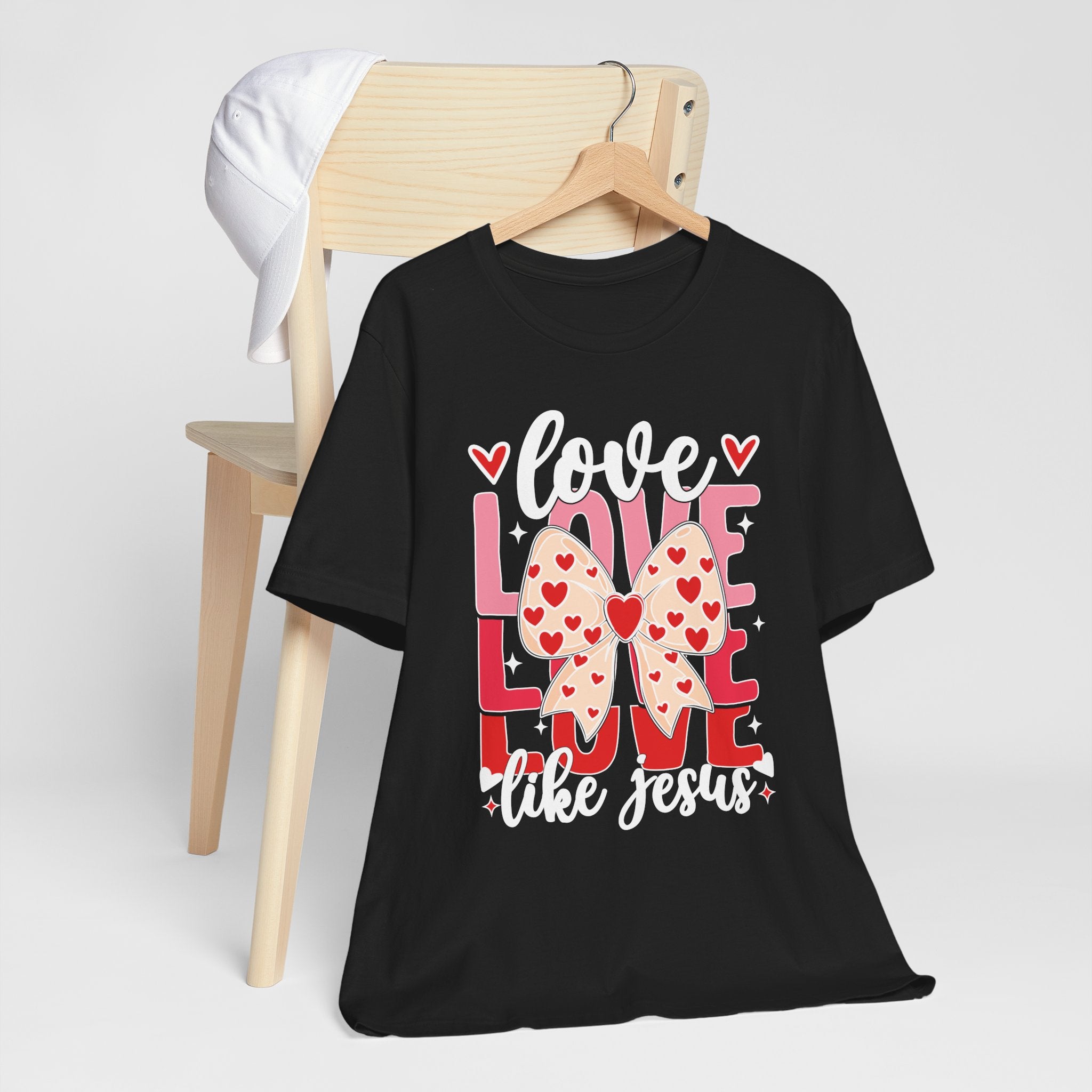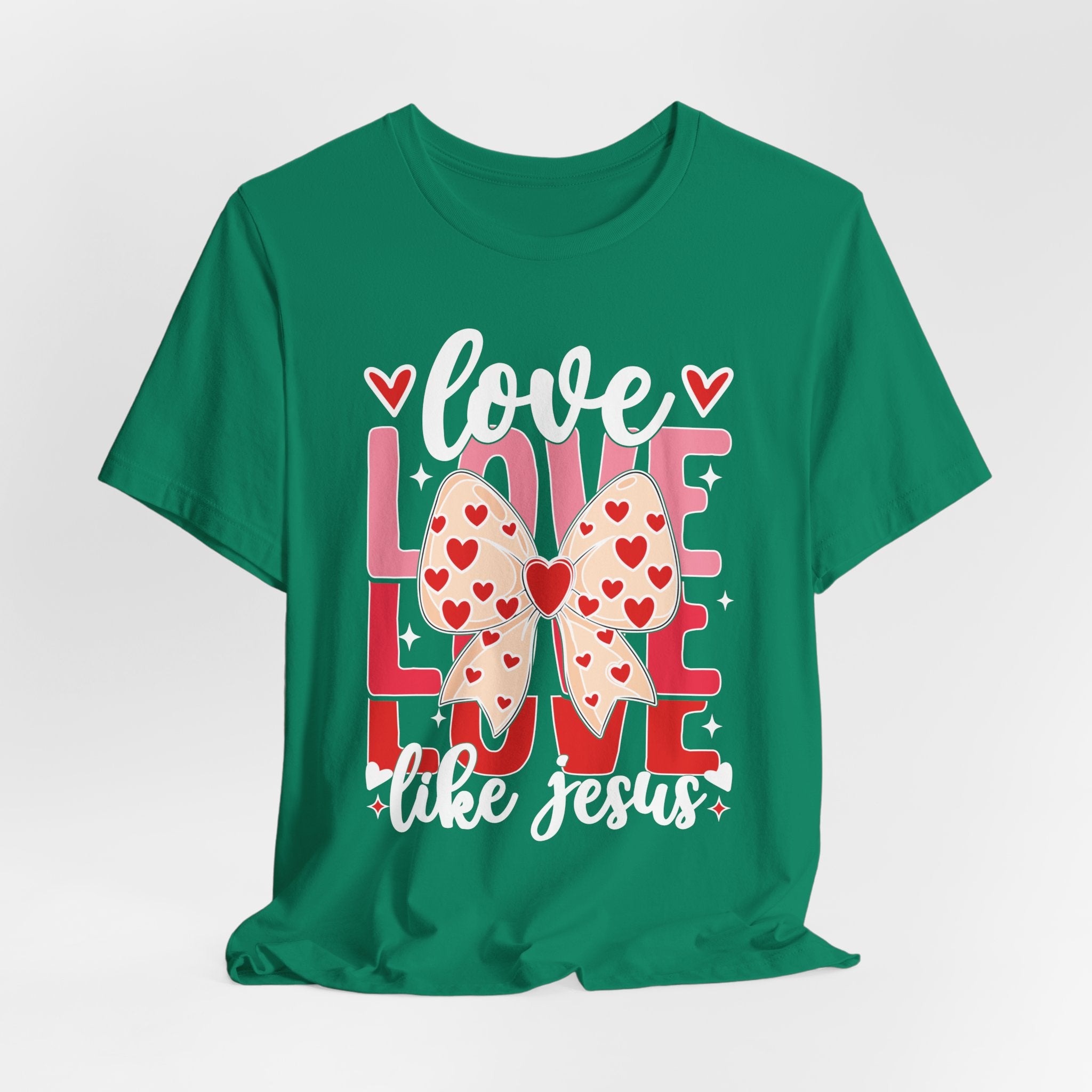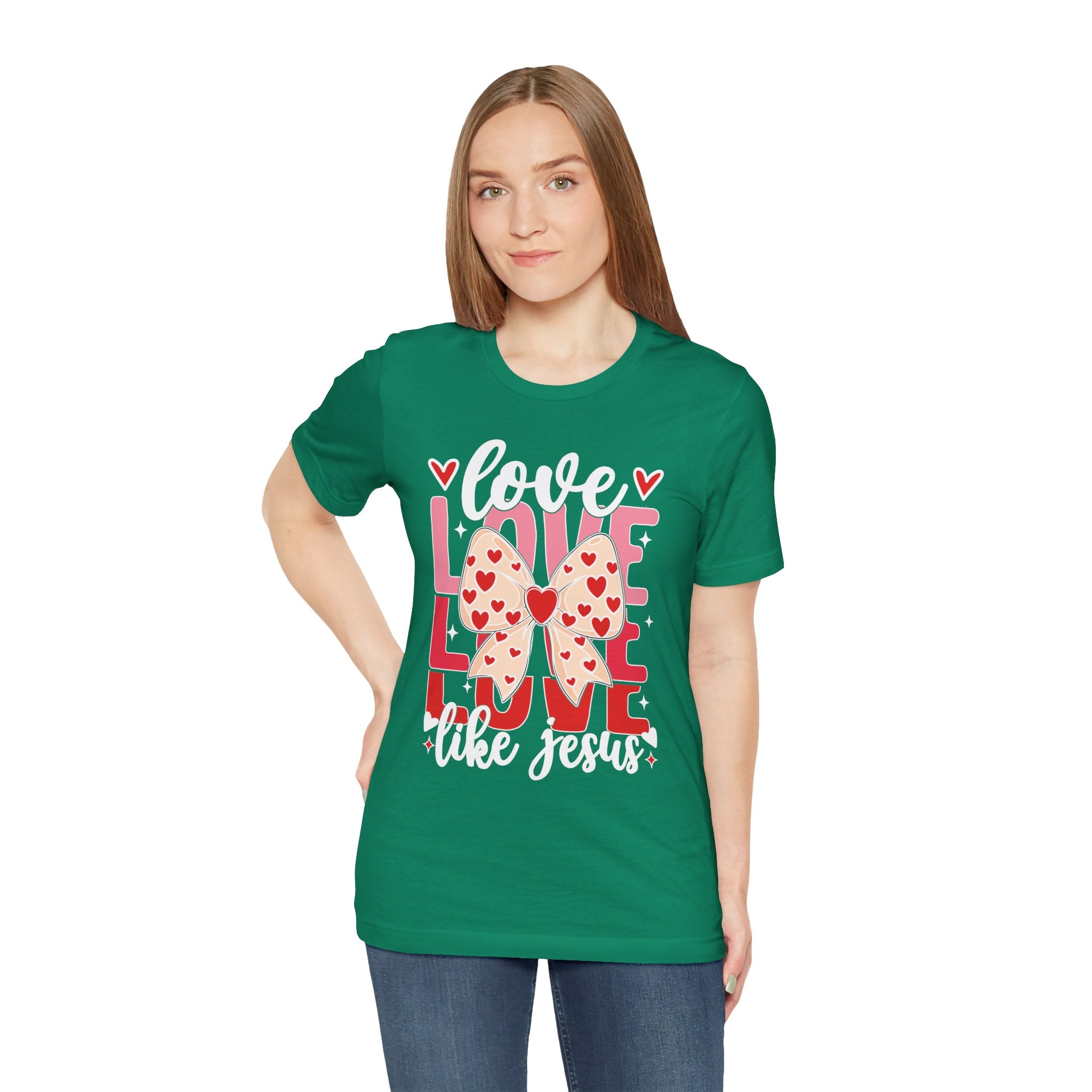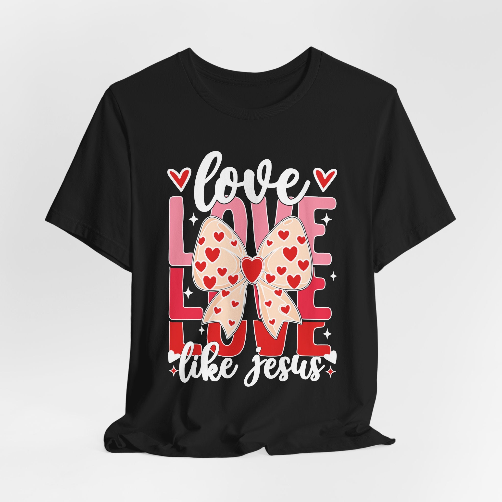 Love Like Jesus tee • a cute, heart-filled Christian T-shirt with a bow design that spreads kindness and joy — perfect for women of faith and Valentine’s season.