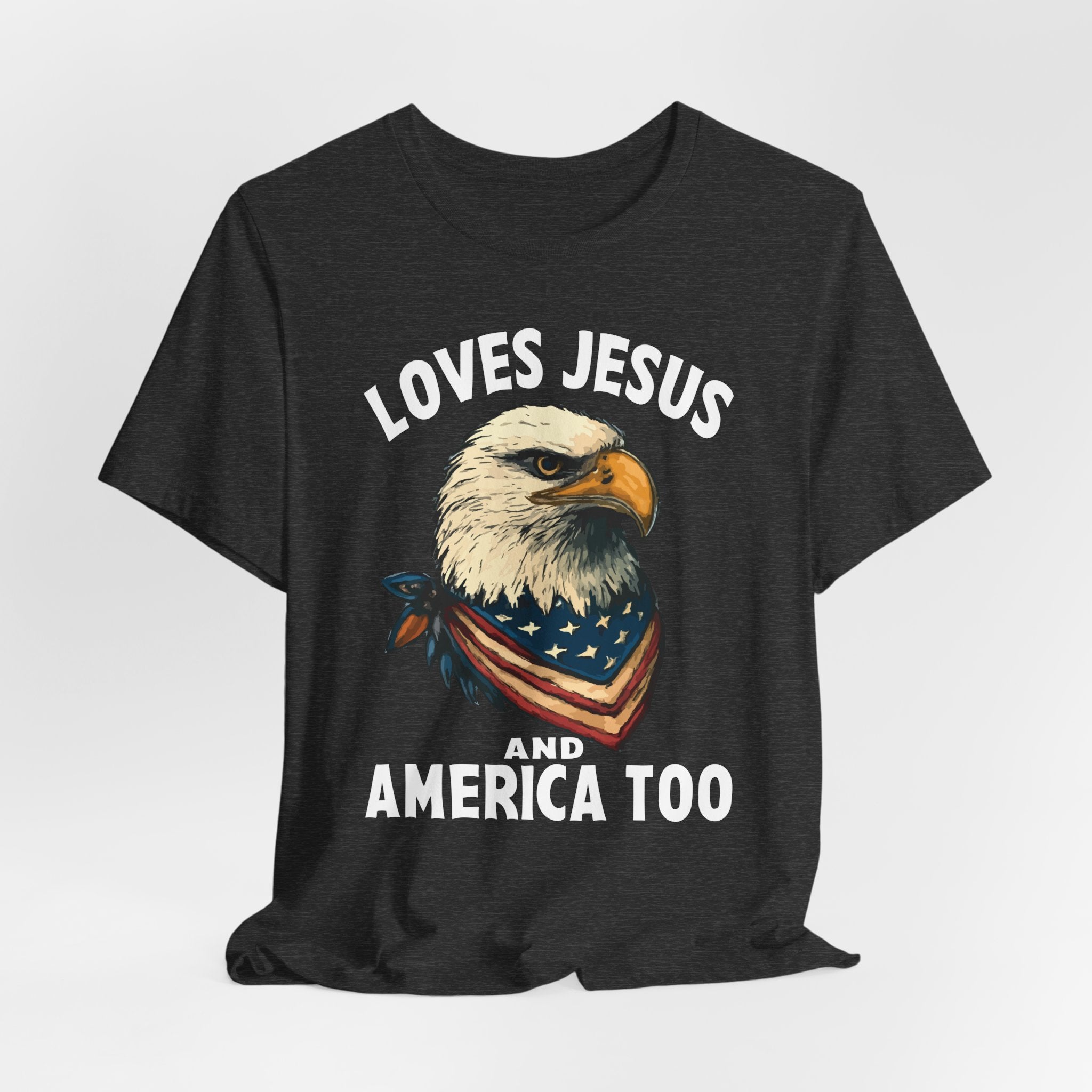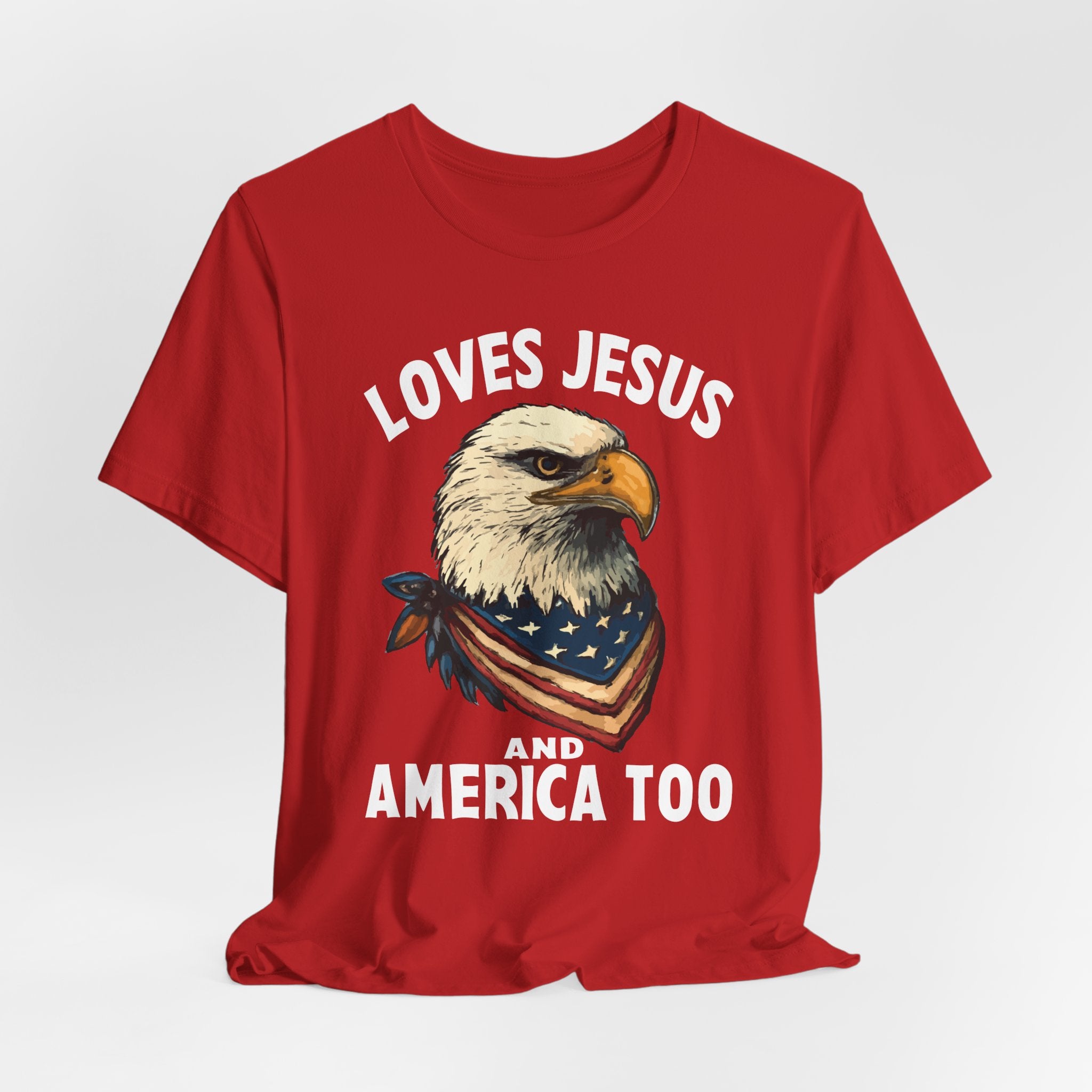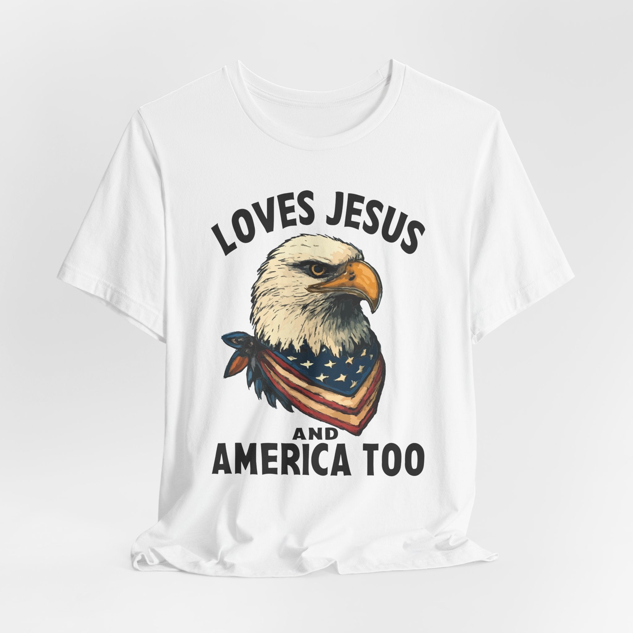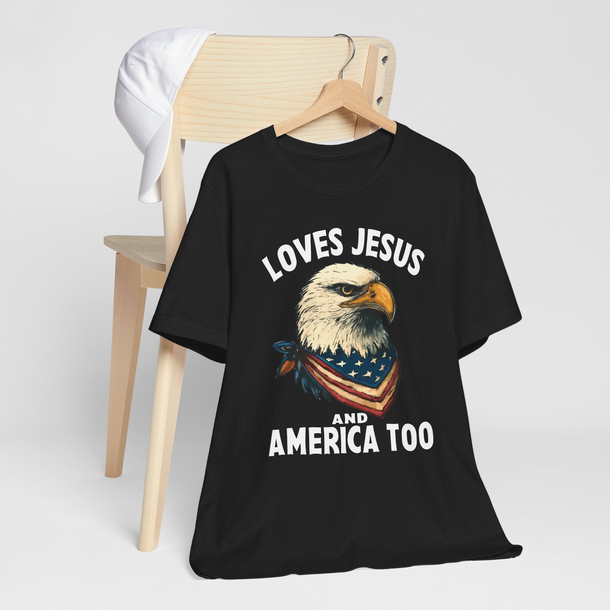 Loves Jesus & America Too tee • a bold patriotic Christian T-shirt showing faith in God and pride in country — perfect for believers with American spirit.