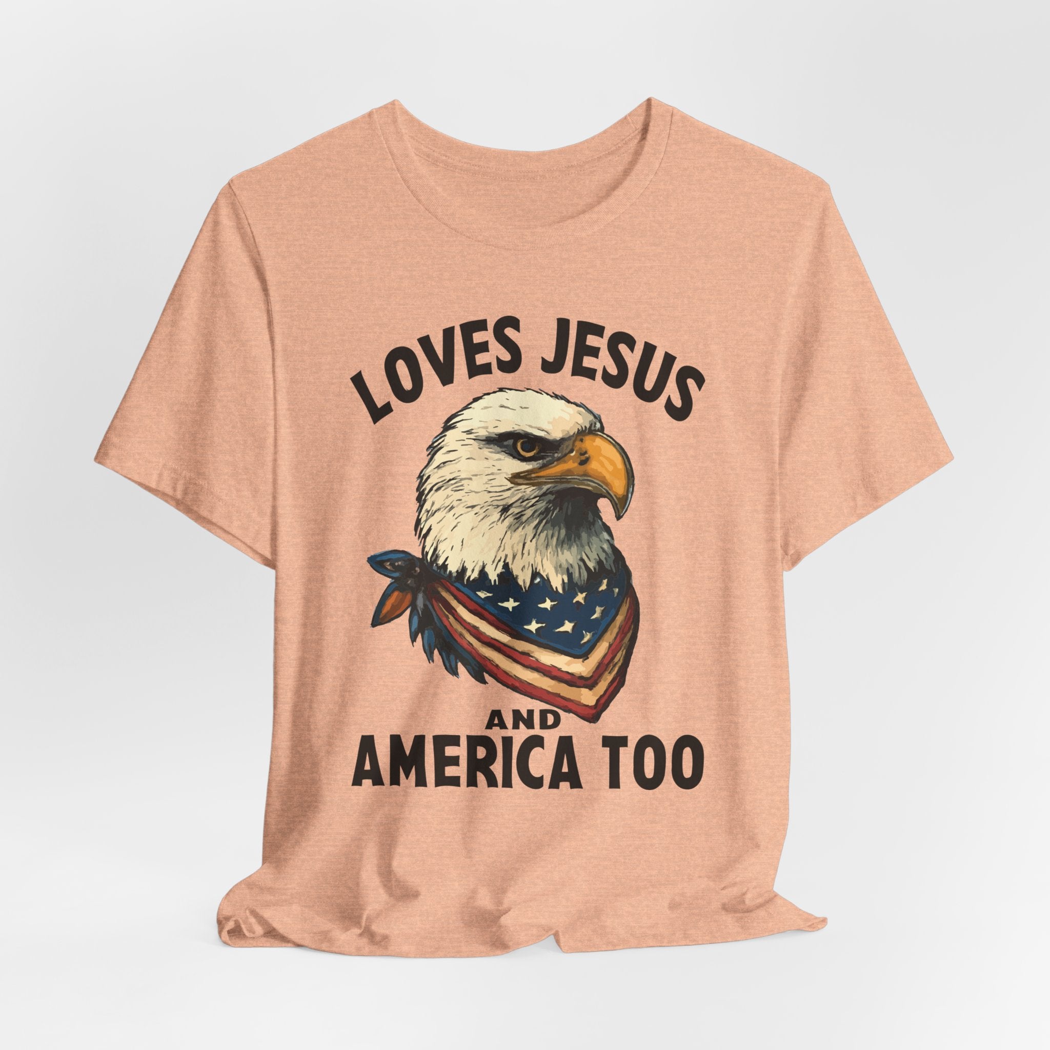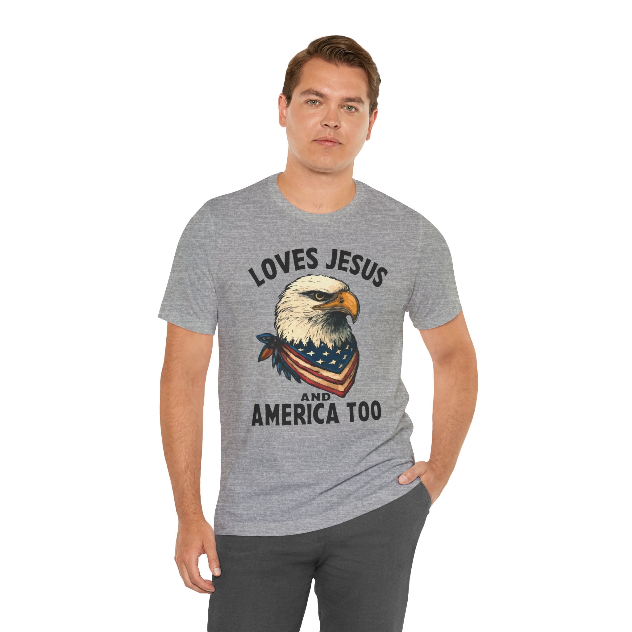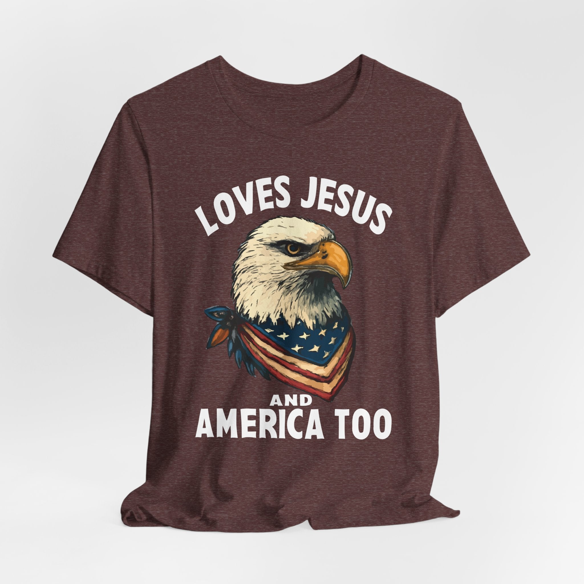 Loves Jesus & America Too tee • a bold patriotic Christian T-shirt showing faith in God and pride in country — perfect for believers with American spirit.