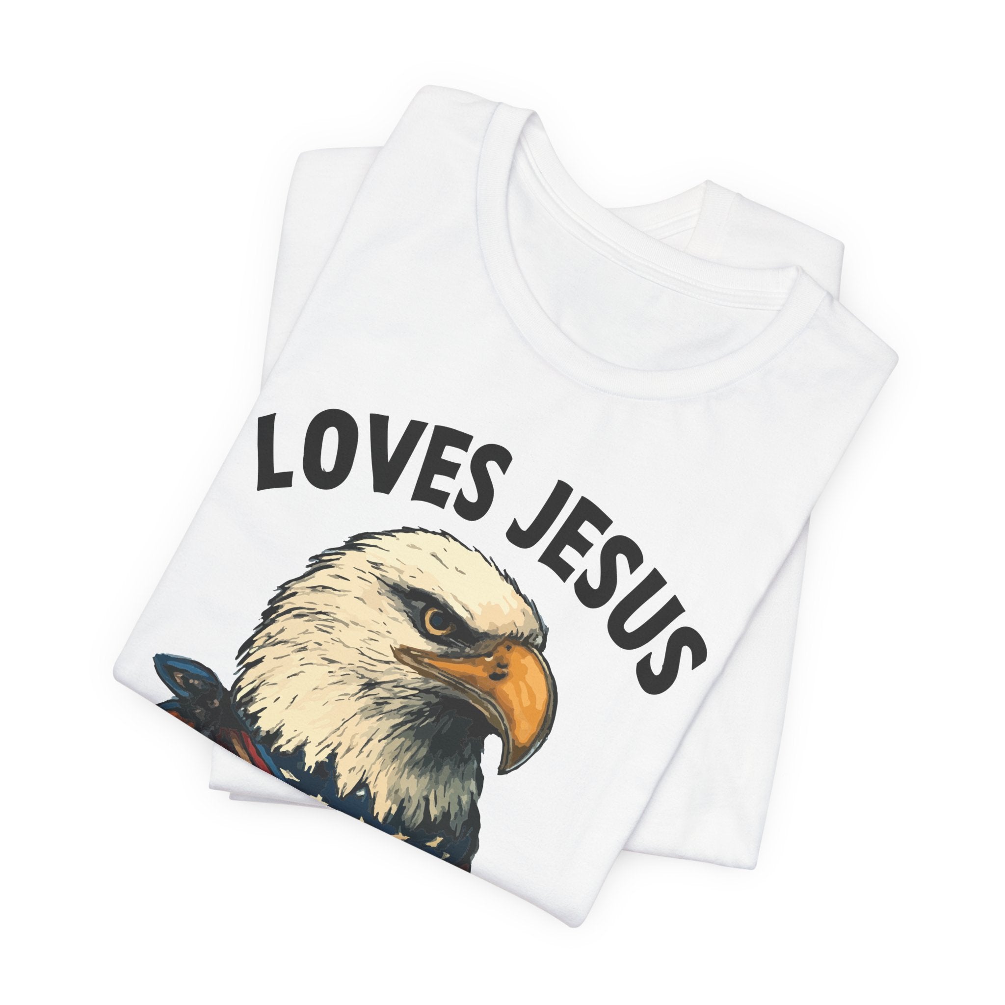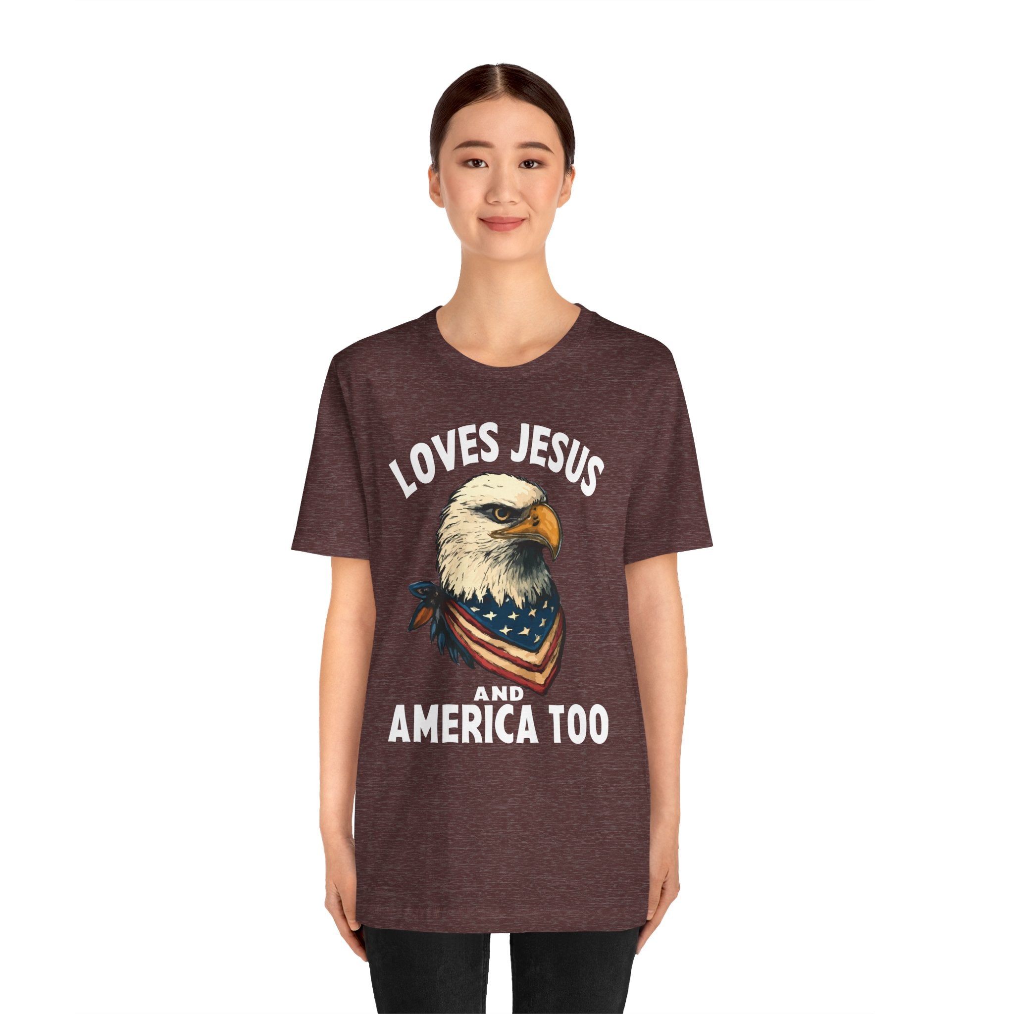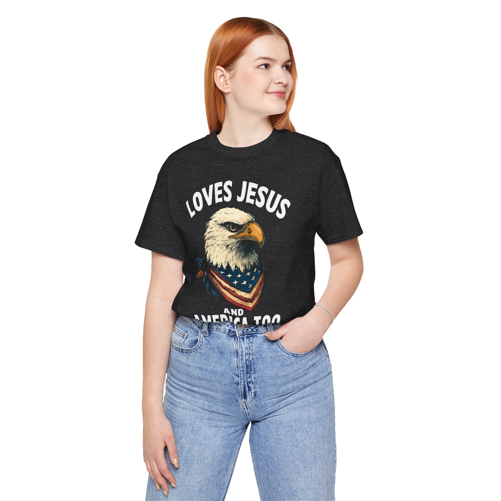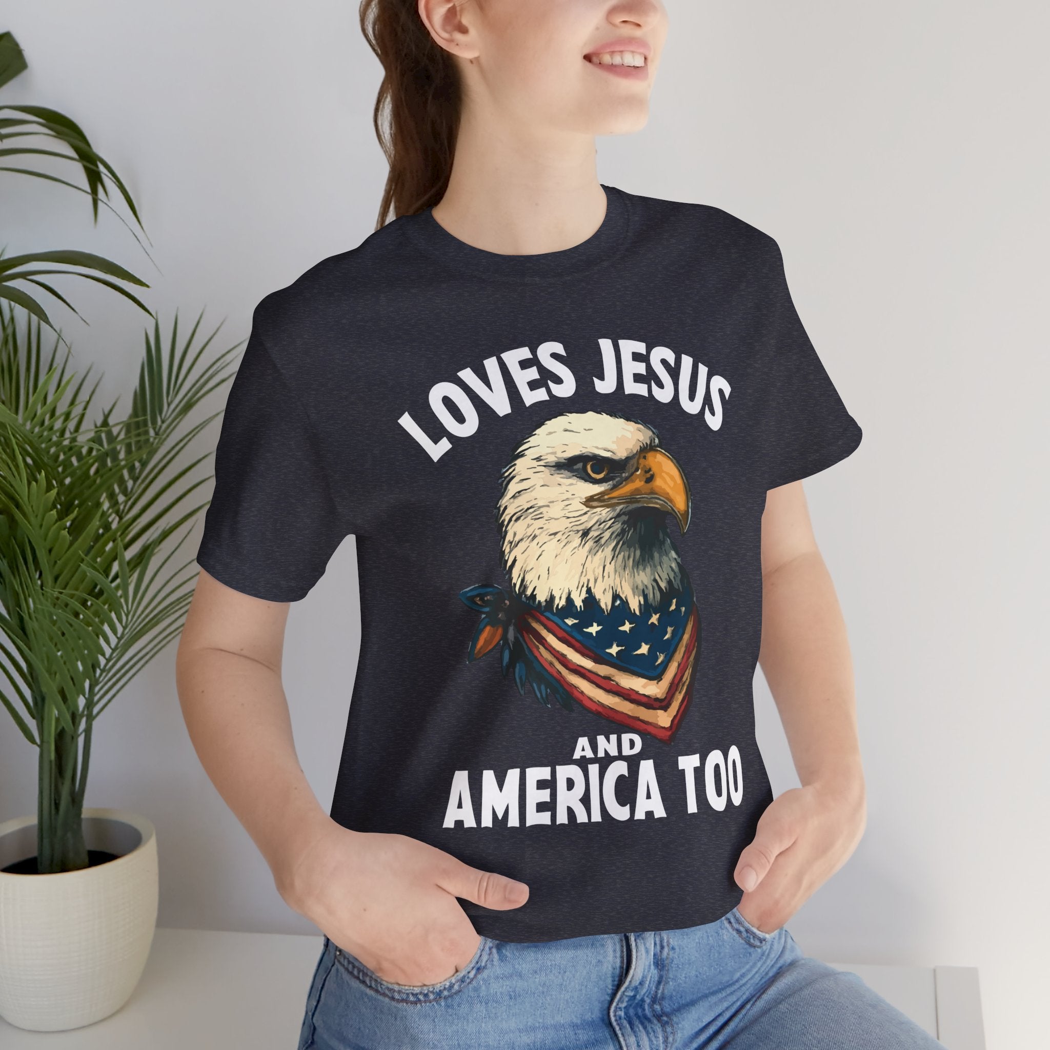 Loves Jesus & America Too tee • a bold patriotic Christian T-shirt showing faith in God and pride in country — perfect for believers with American spirit.