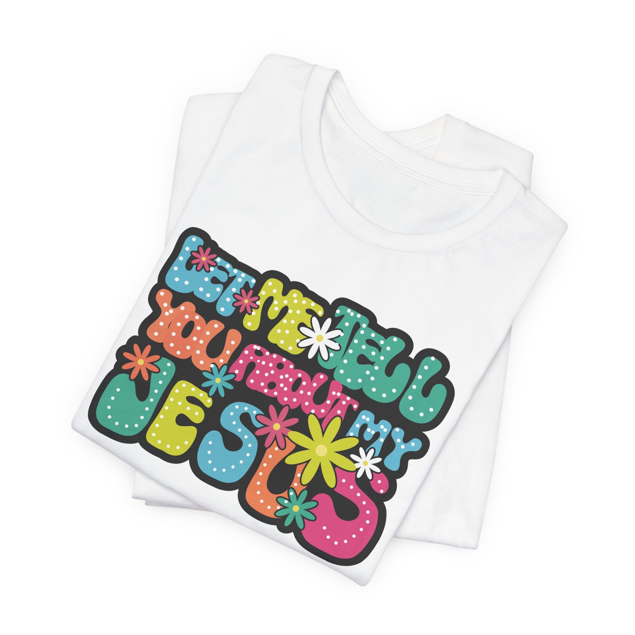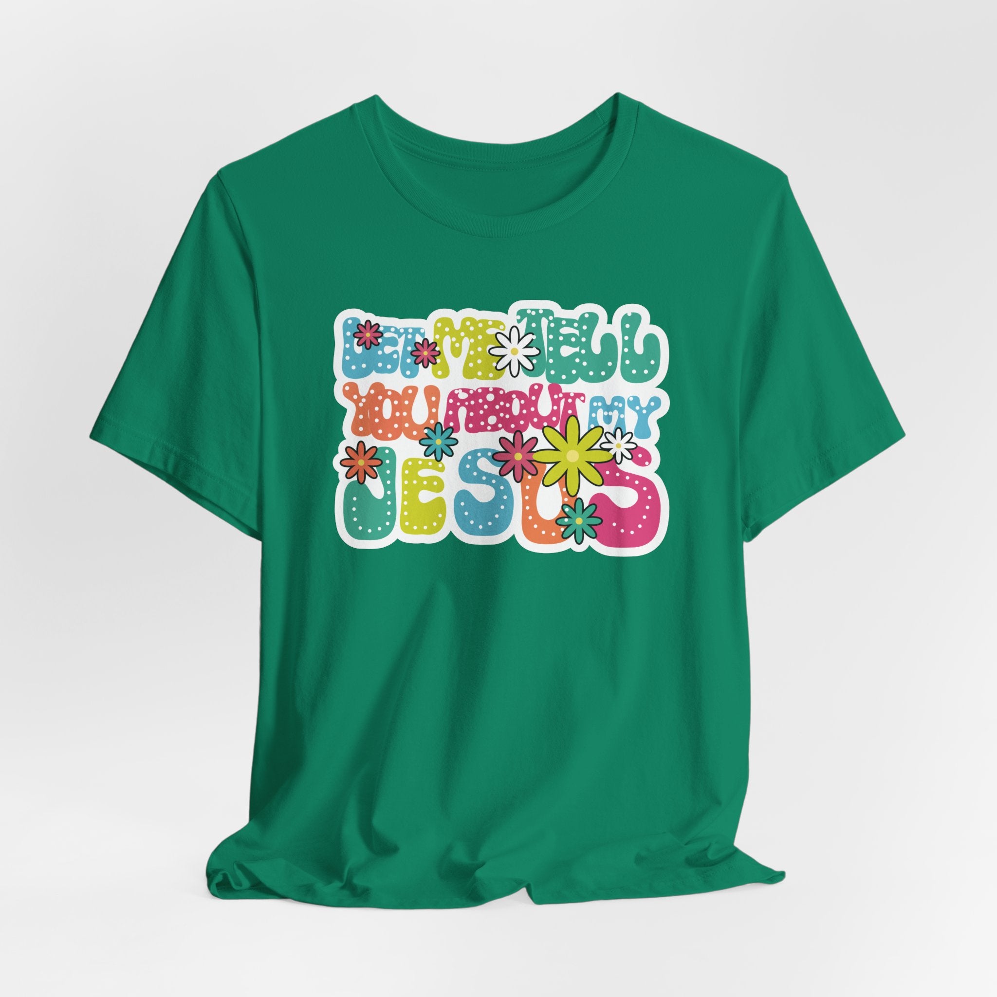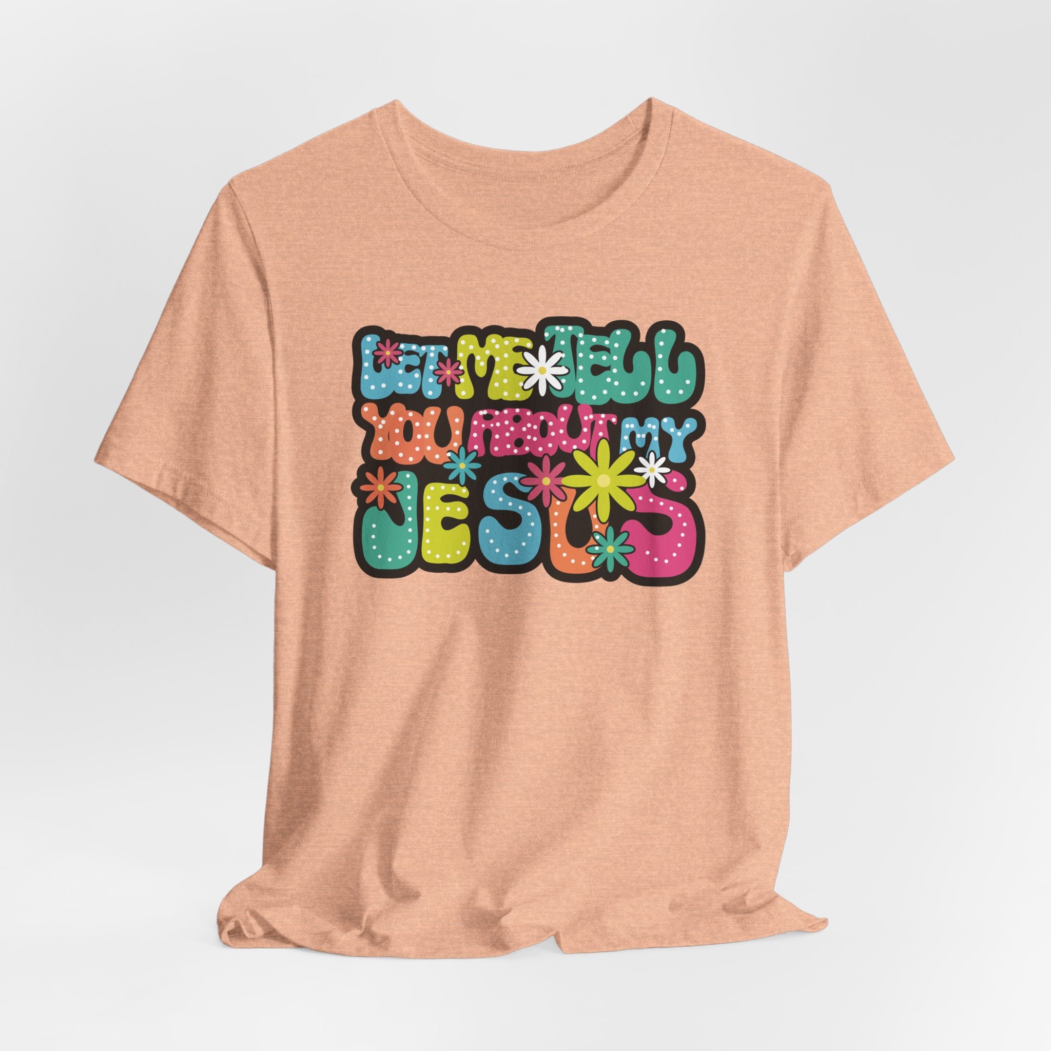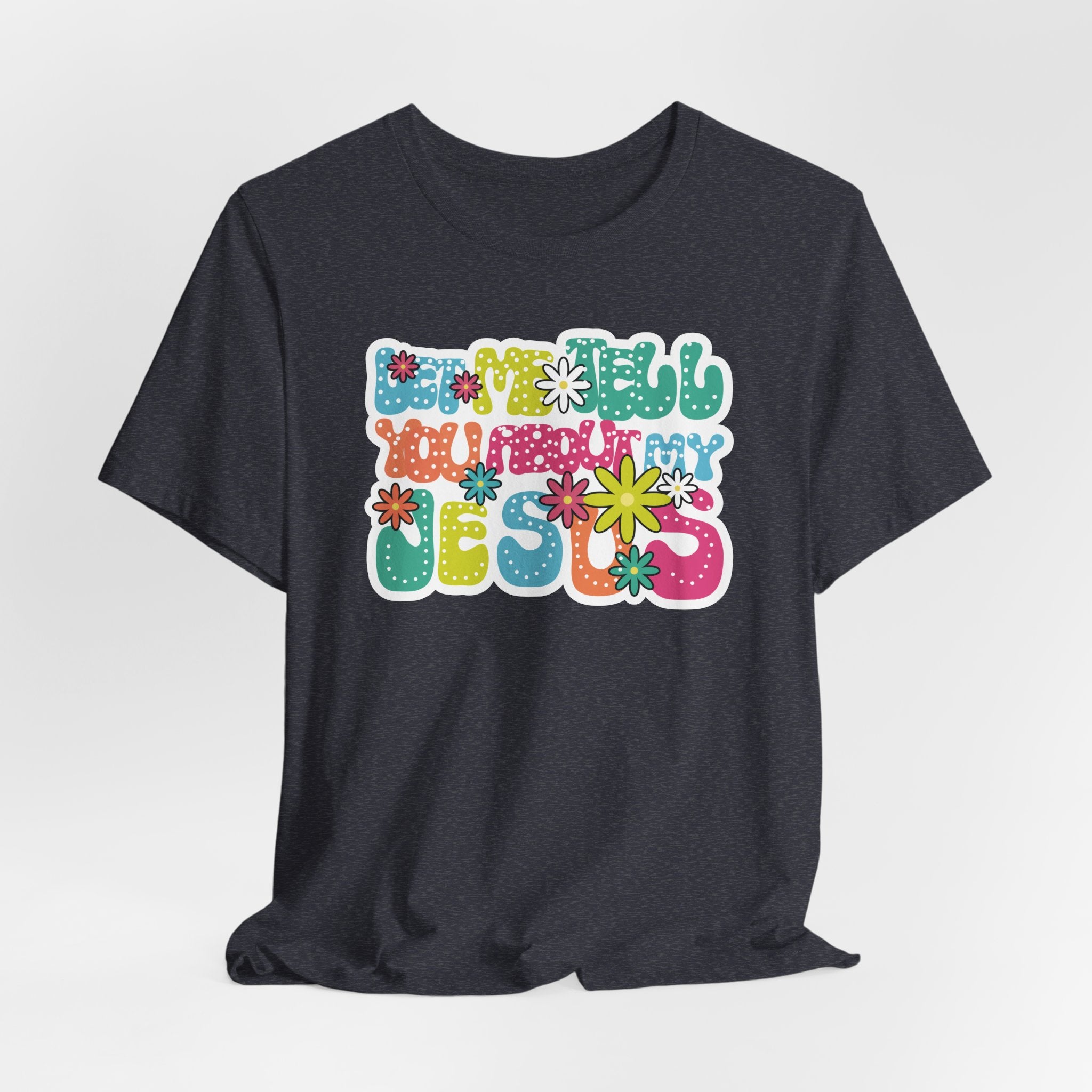Let Me Tell You About My Jesus tee • a bright, retro Christian T-shirt sharing joy, love, and laughter through faith — perfect for cheerful believers.