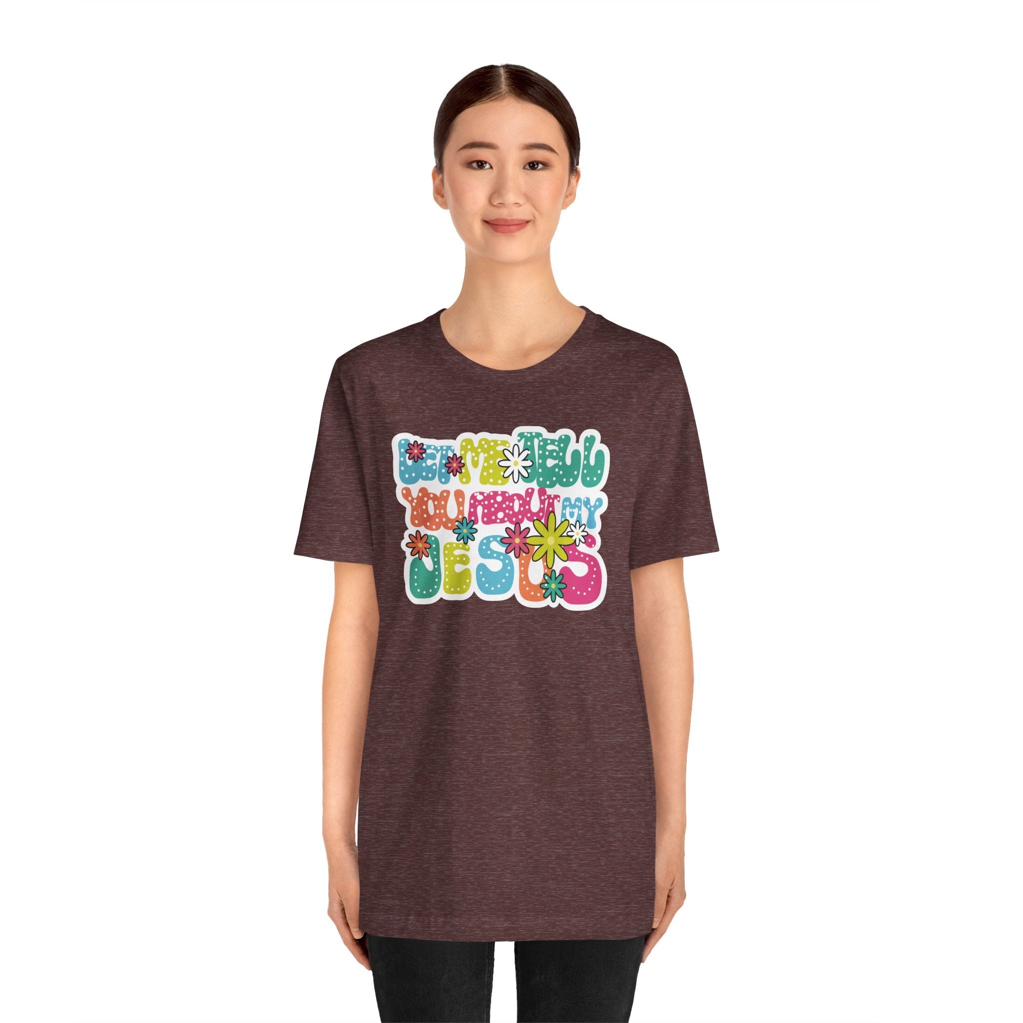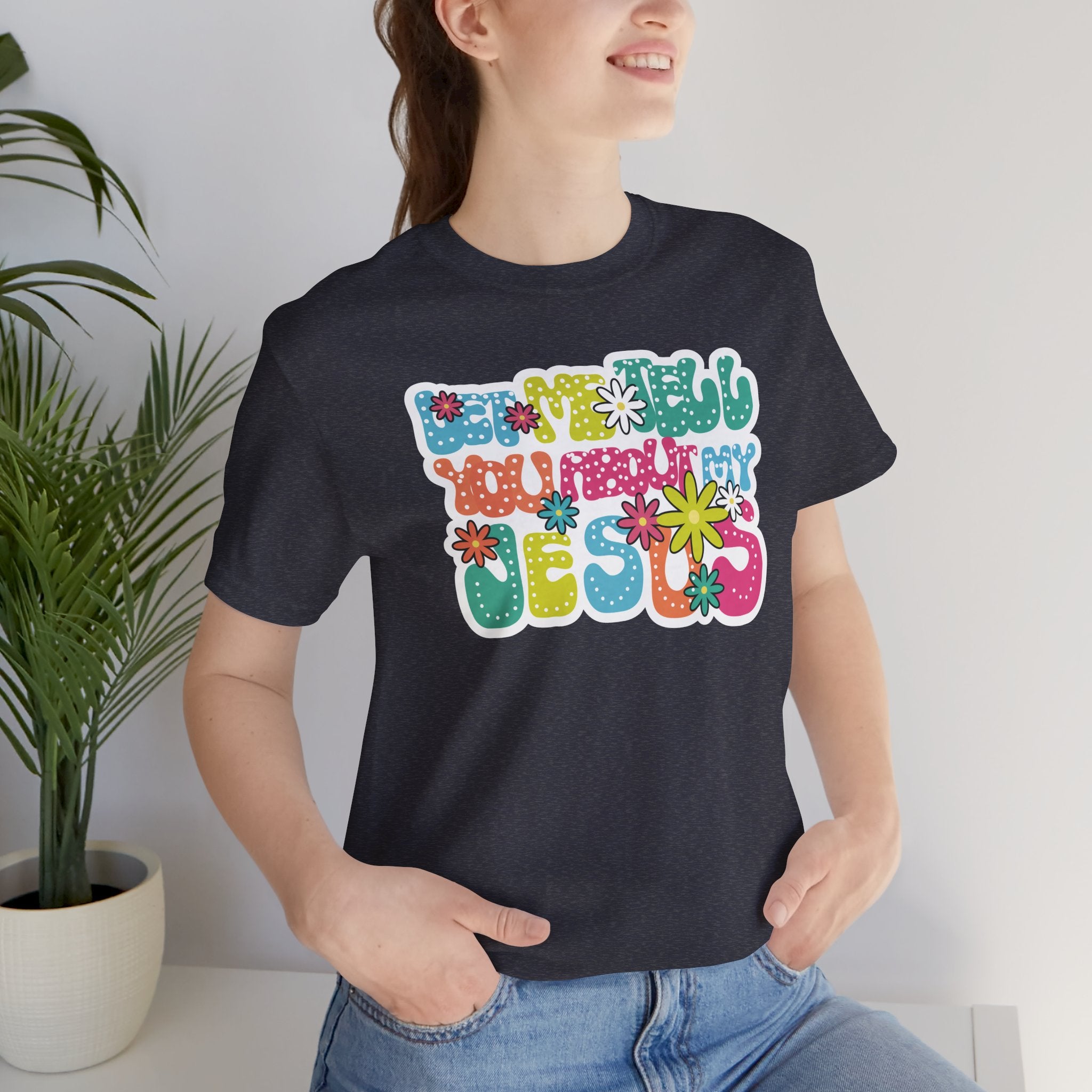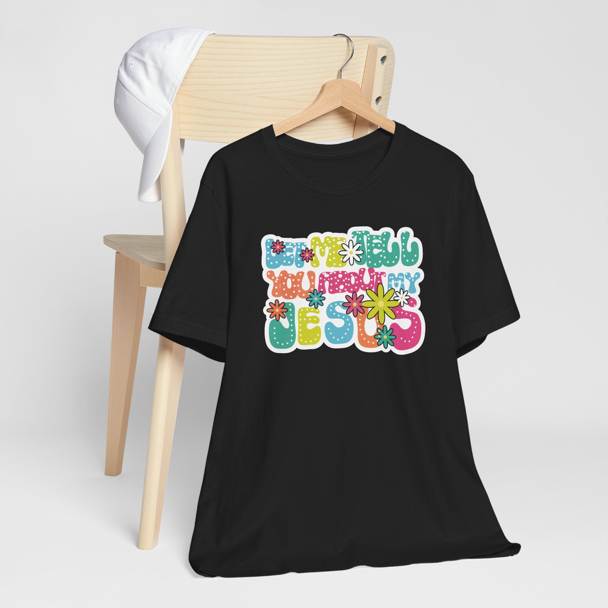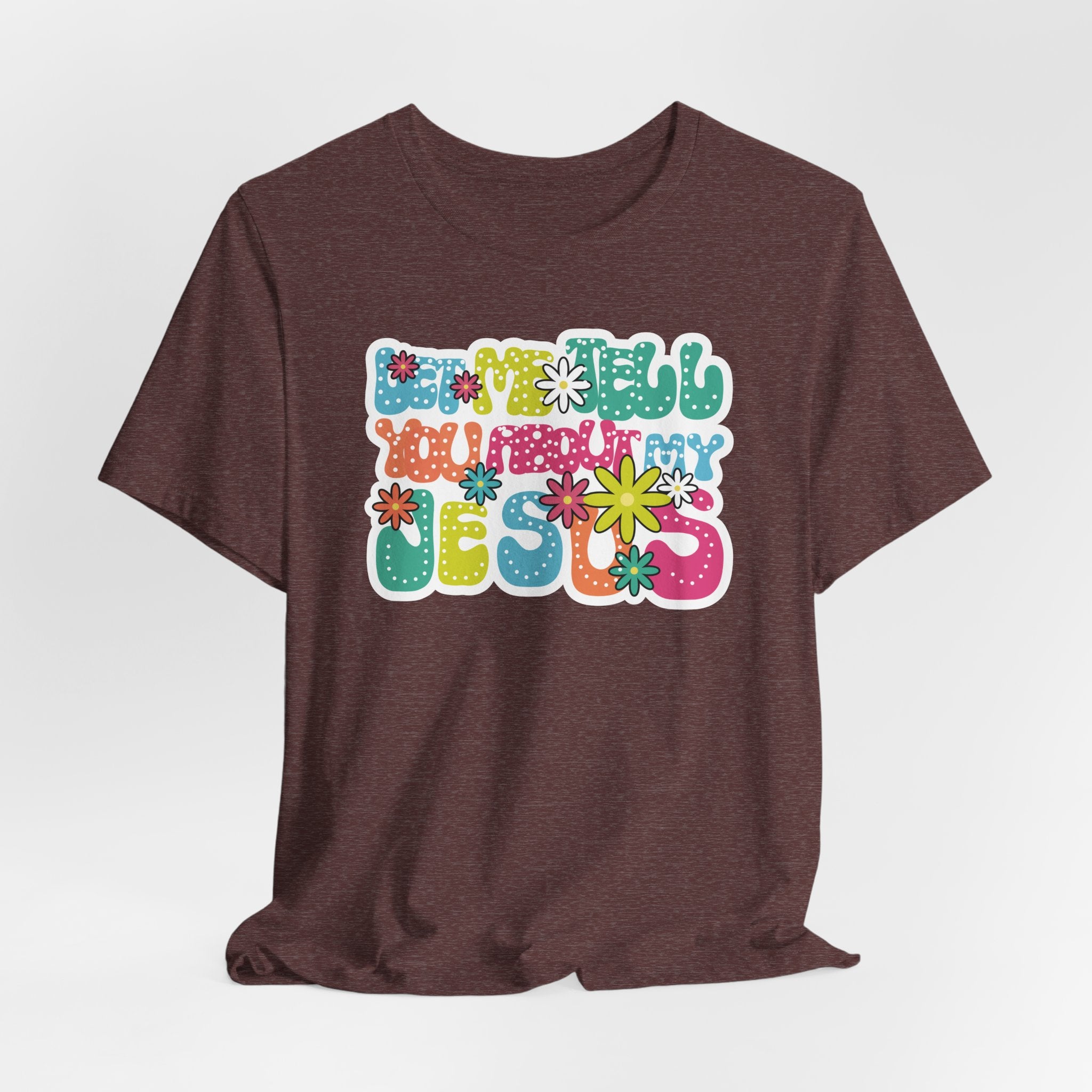 Let Me Tell You About My Jesus tee • a bright, retro Christian T-shirt sharing joy, love, and laughter through faith — perfect for cheerful believers.