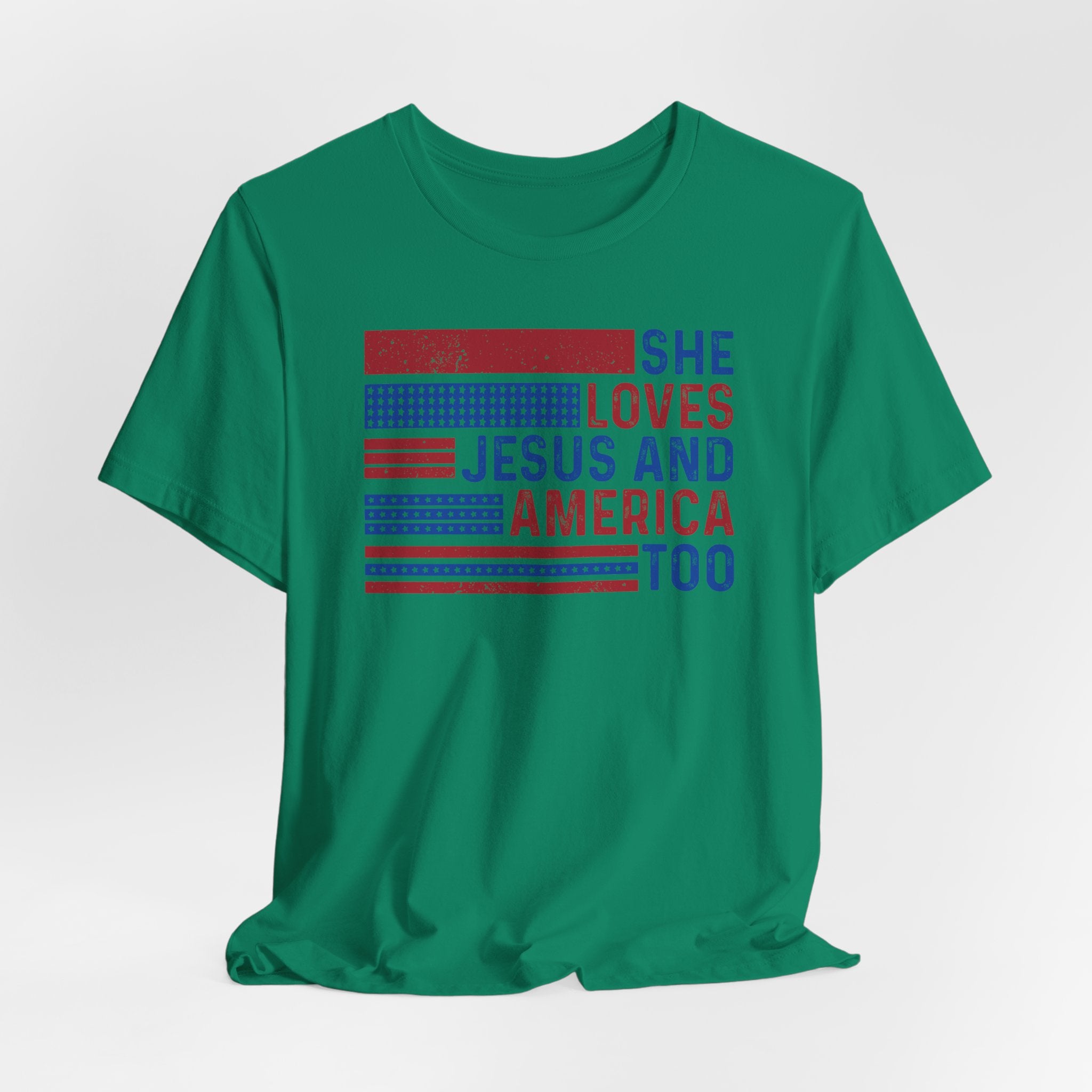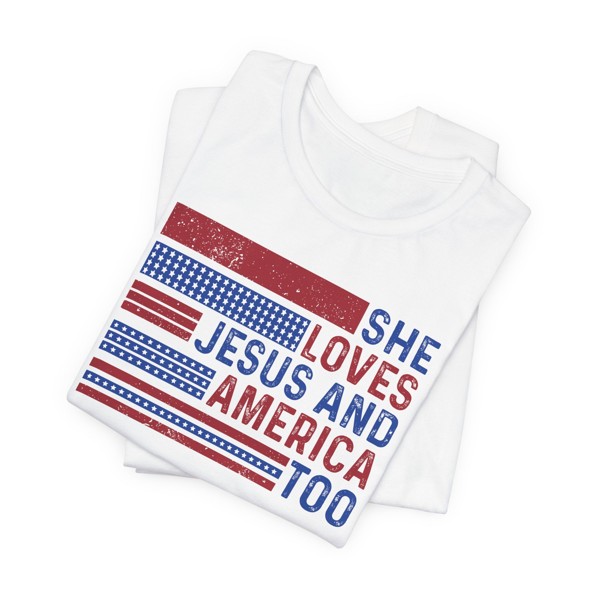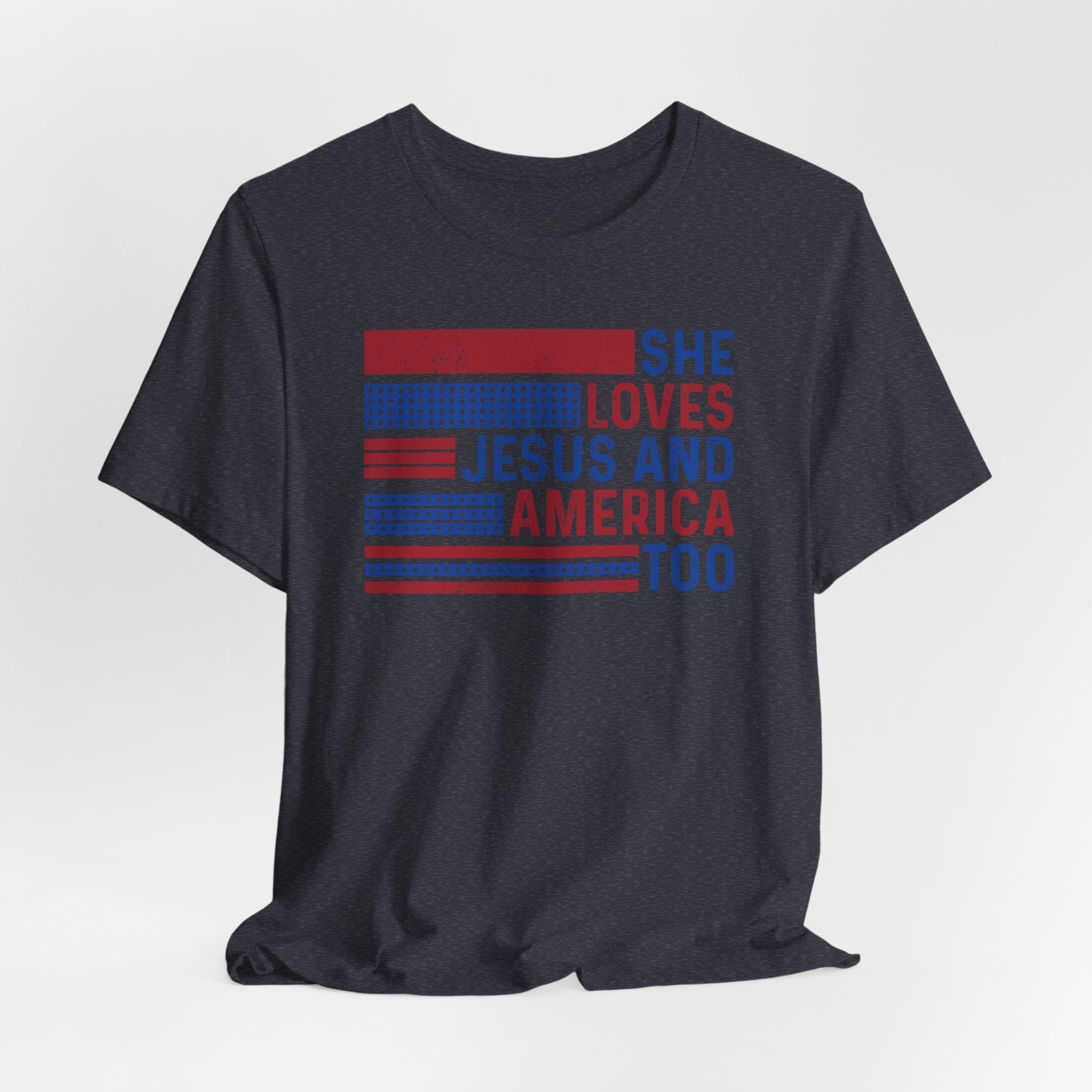 She Loves Jesus and America Too tee • a patriotic Christian T-shirt celebrating faith, freedom, and love for God and country.