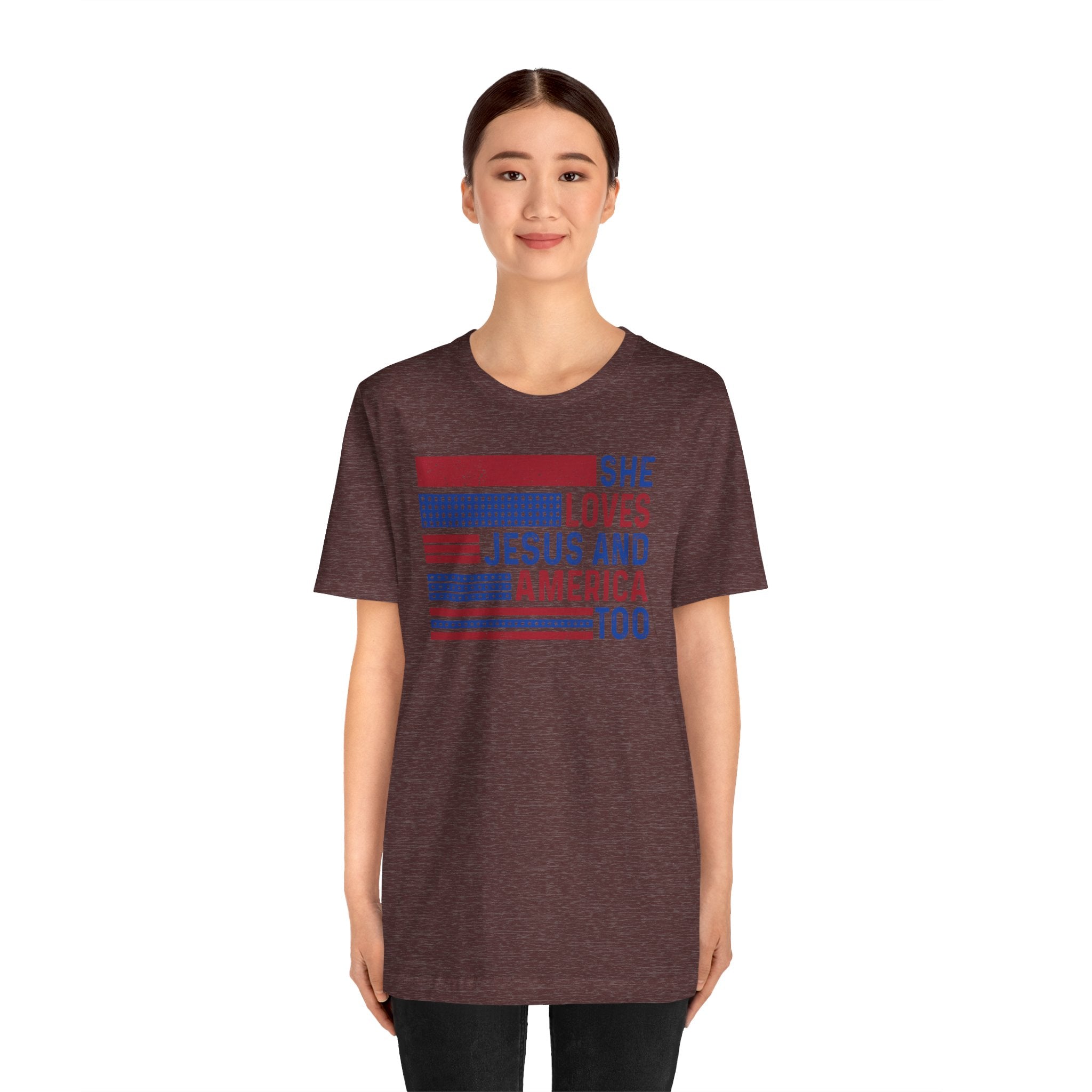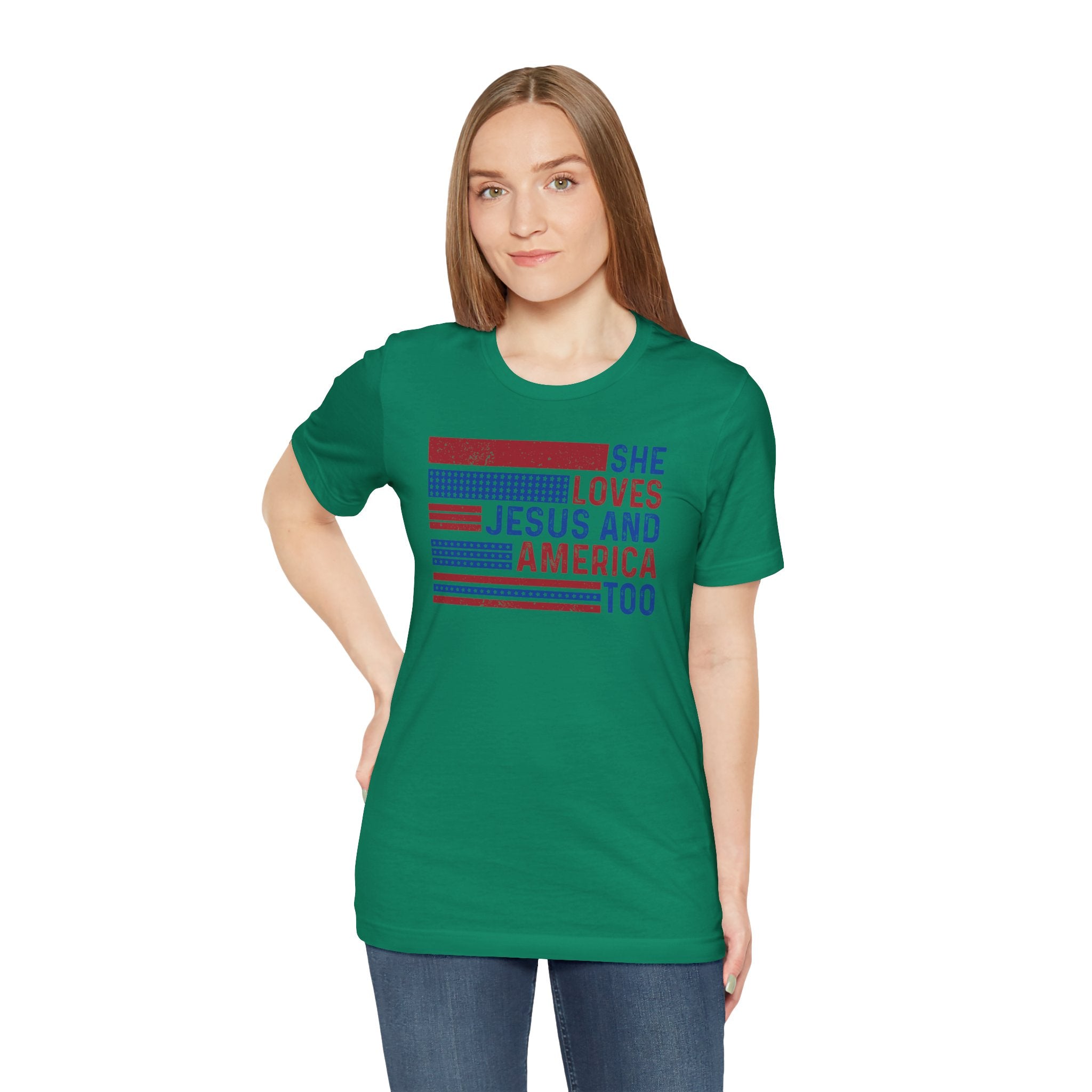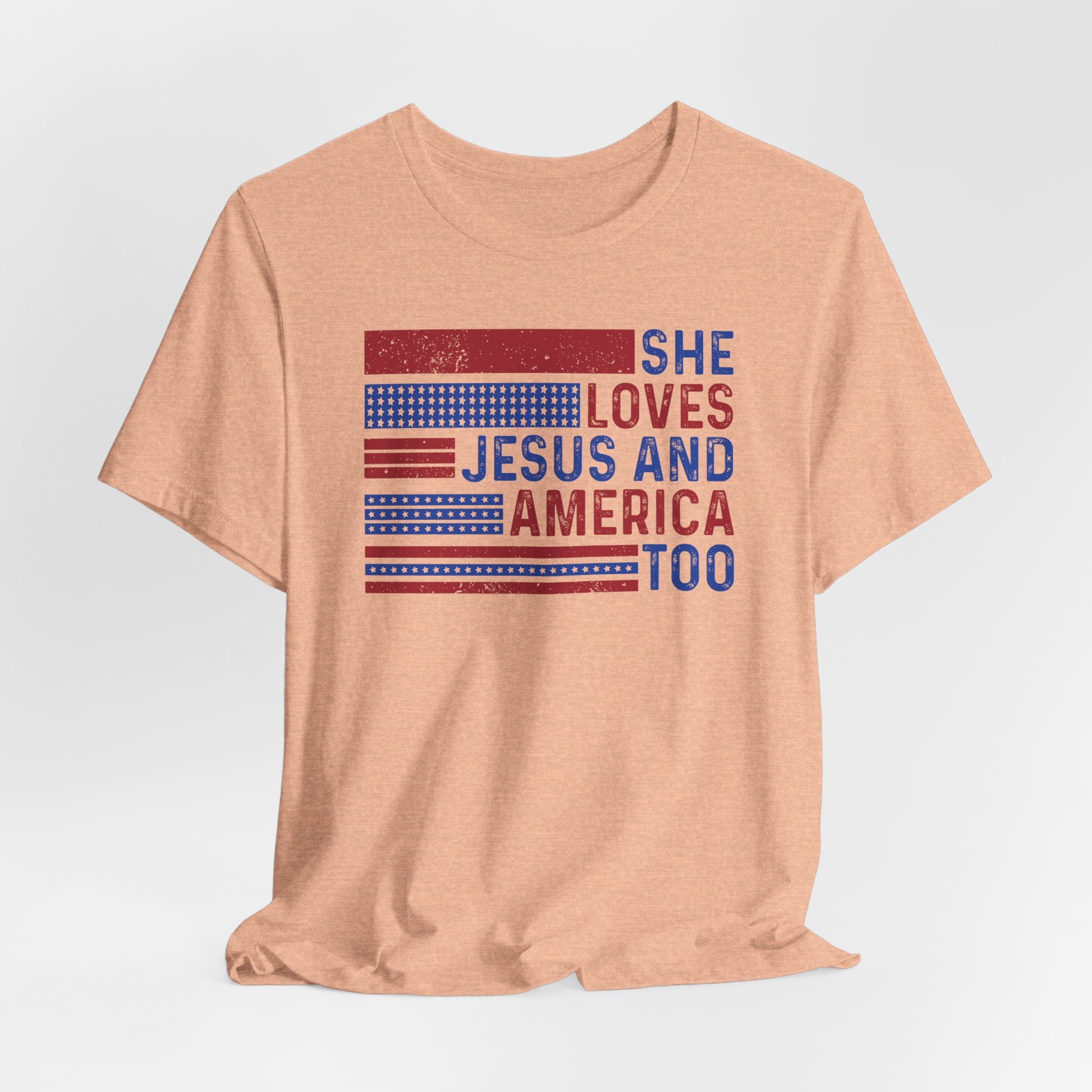 She Loves Jesus and America Too tee • a patriotic Christian T-shirt celebrating faith, freedom, and love for God and country.