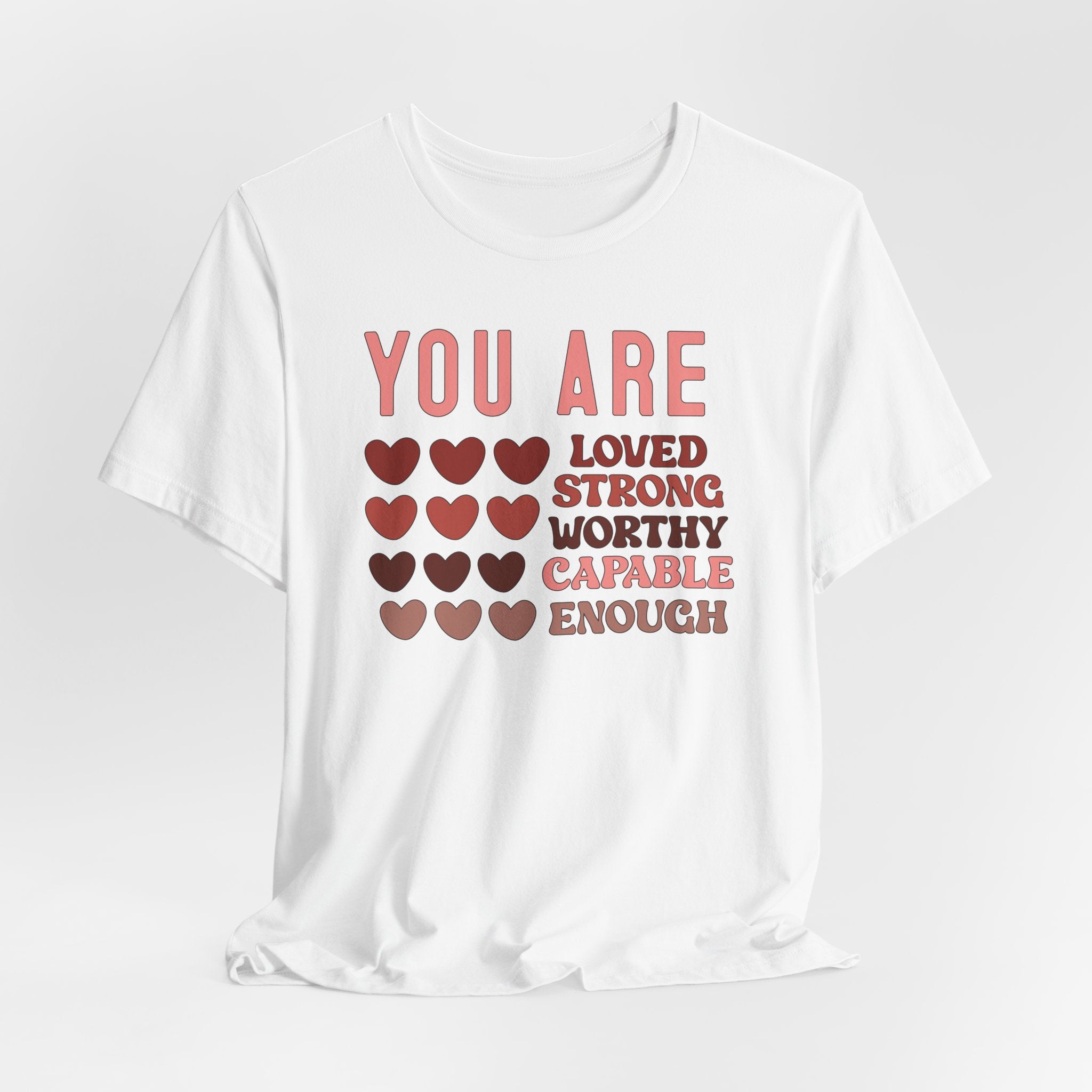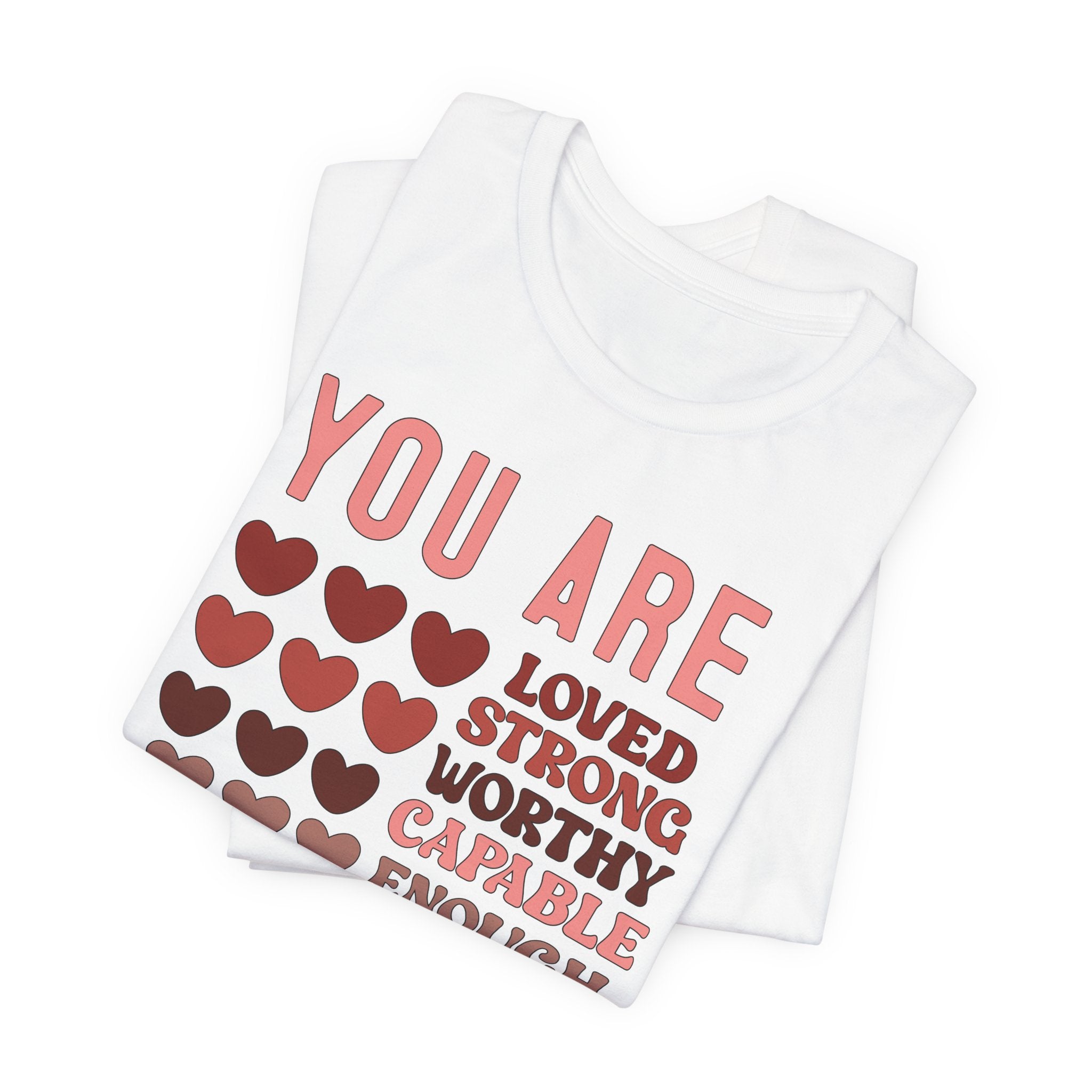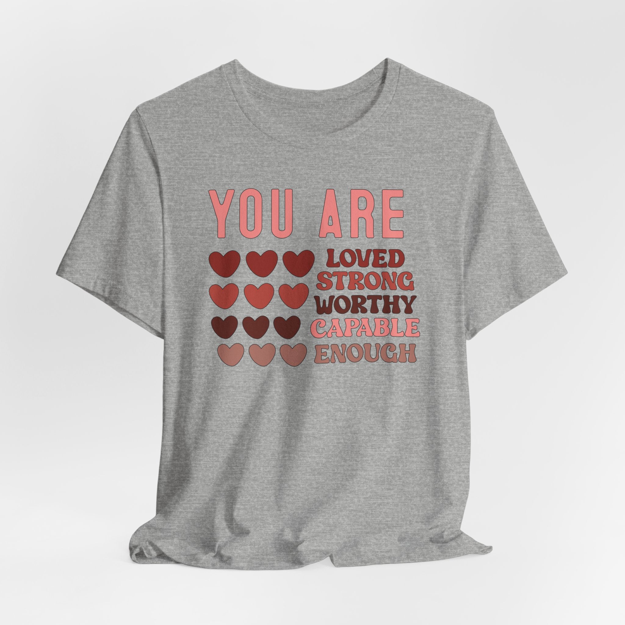 You Are Loved Strong Worthy tee • an encouraging Christian T-shirt reminding believers of their true value and identity in Christ.