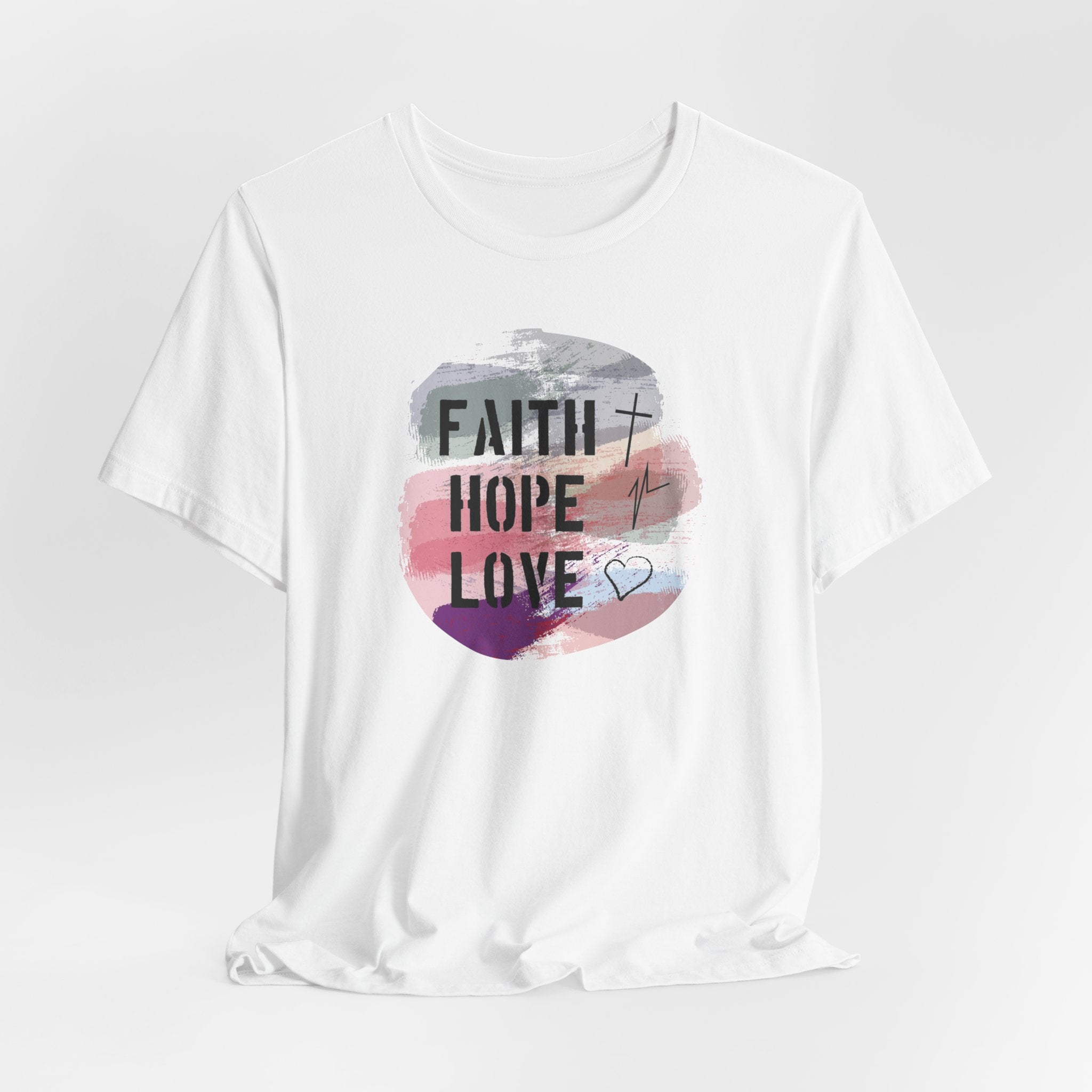 Faith Hope Love tee • an uplifting Christian T-shirt celebrating the core values of living in Jesus with a modern, artistic style.