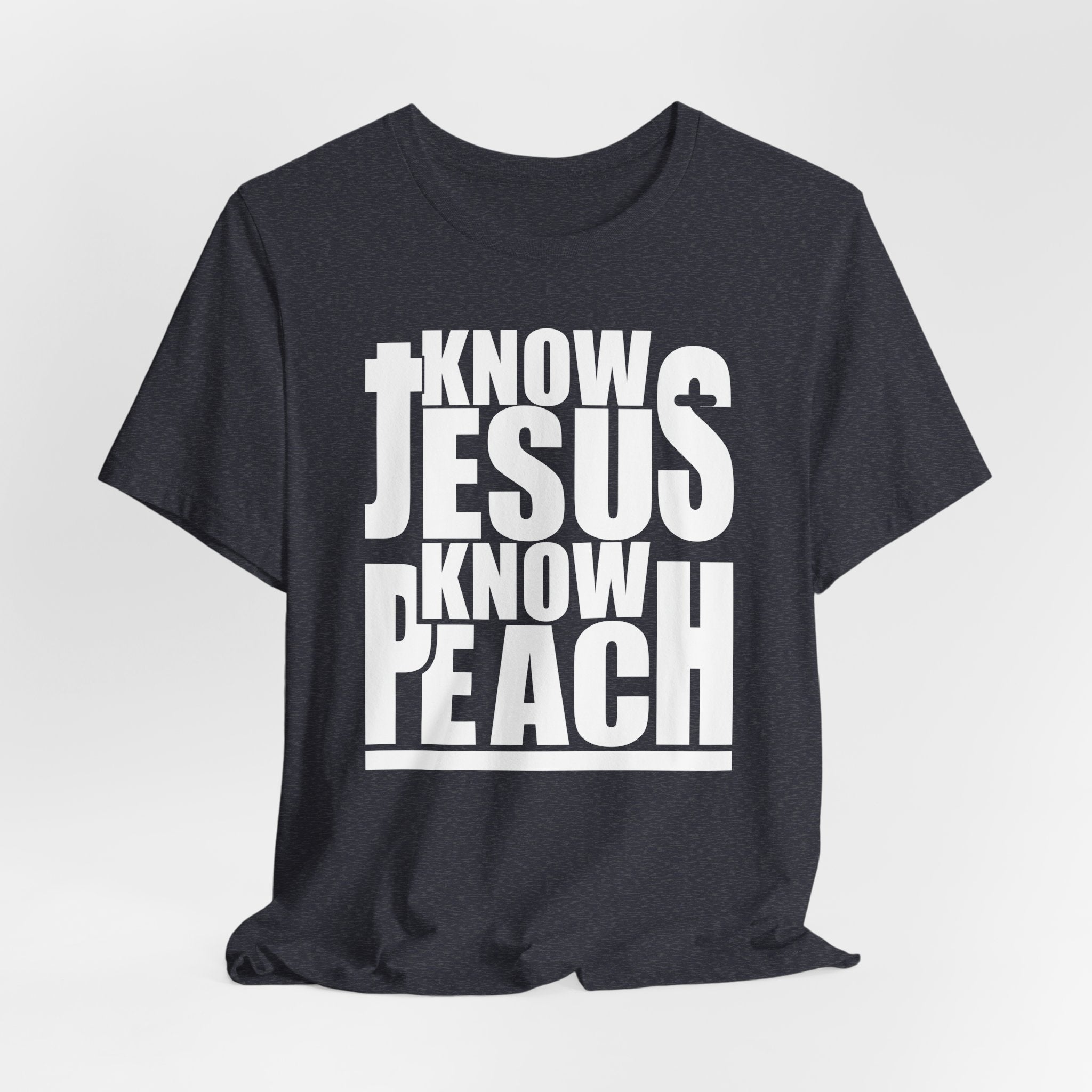Know Jesus Know Peace tee — a bold, minimalist Christian T-shirt celebrating the true peace found in Christ.