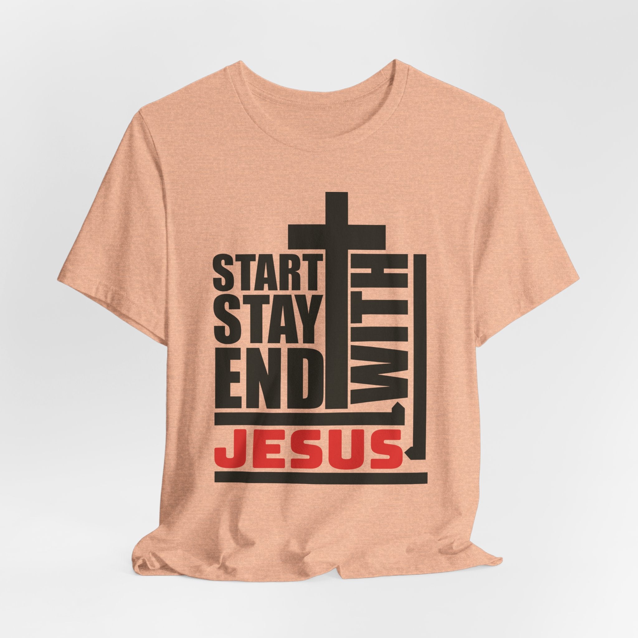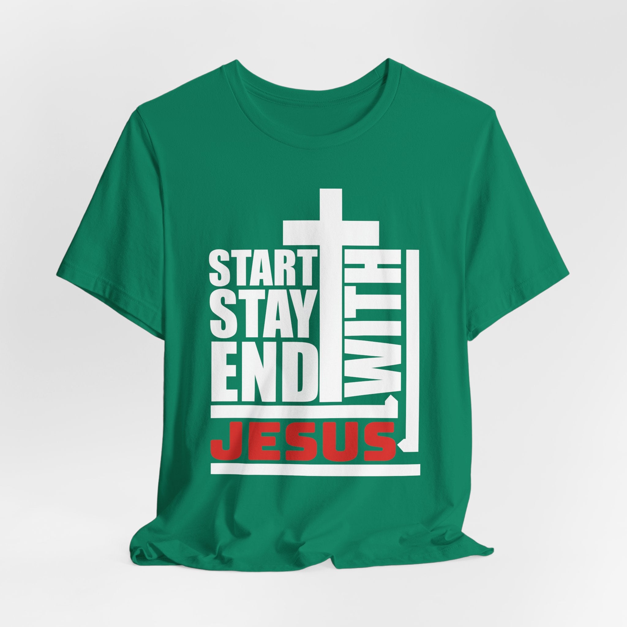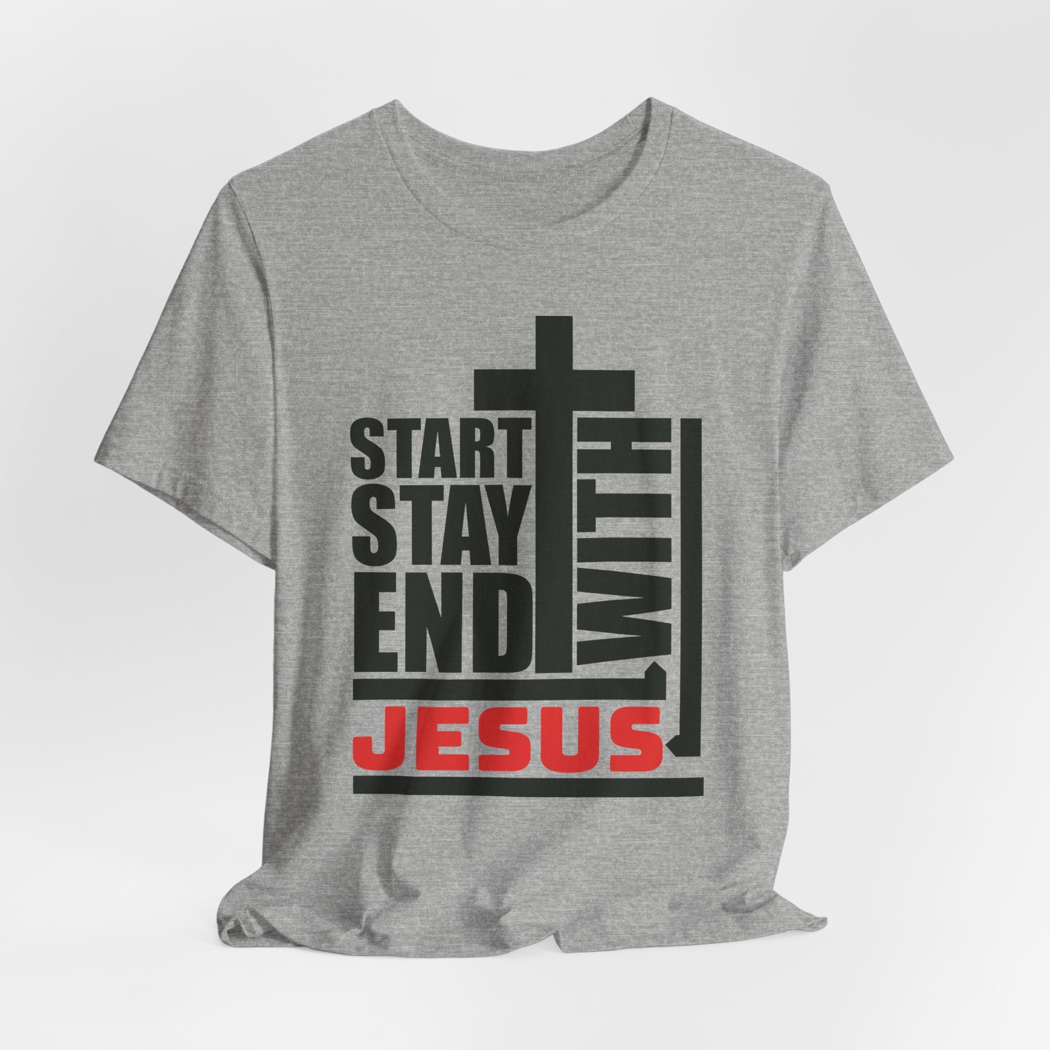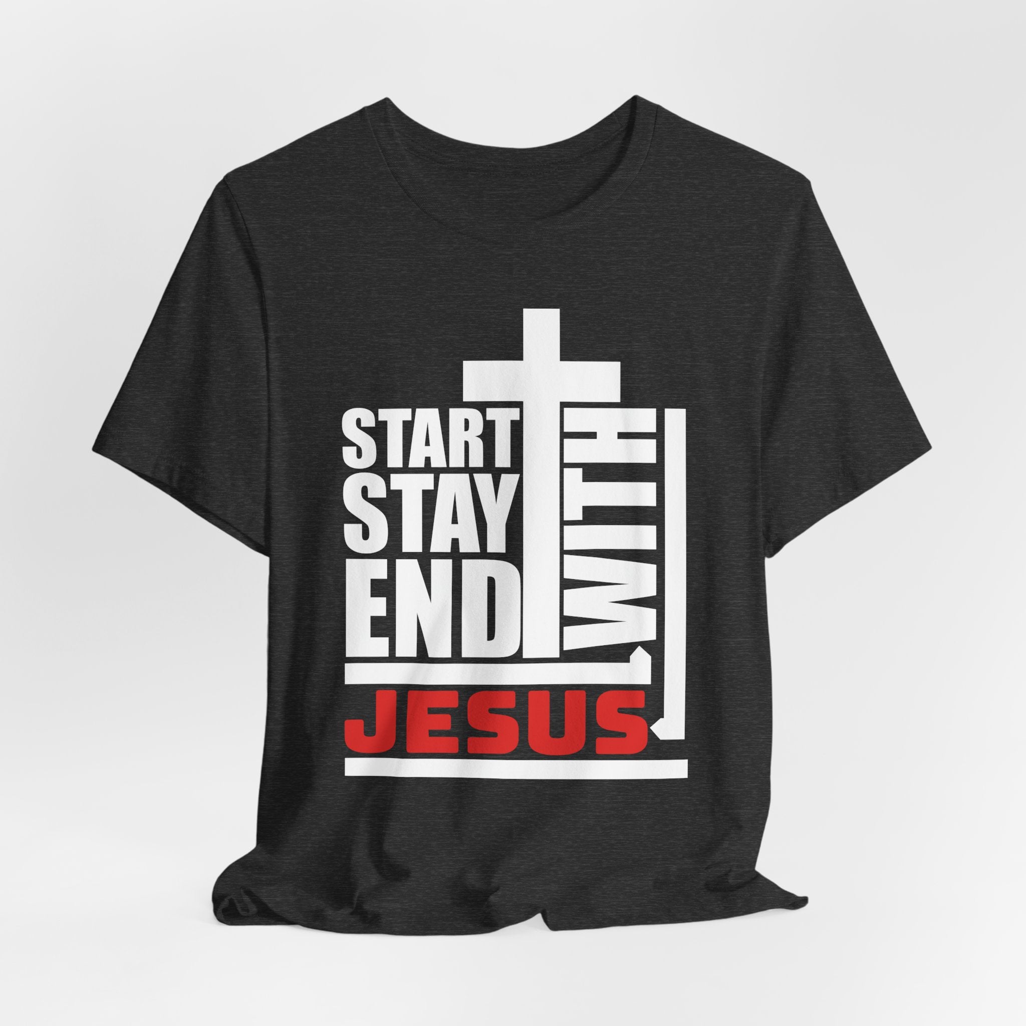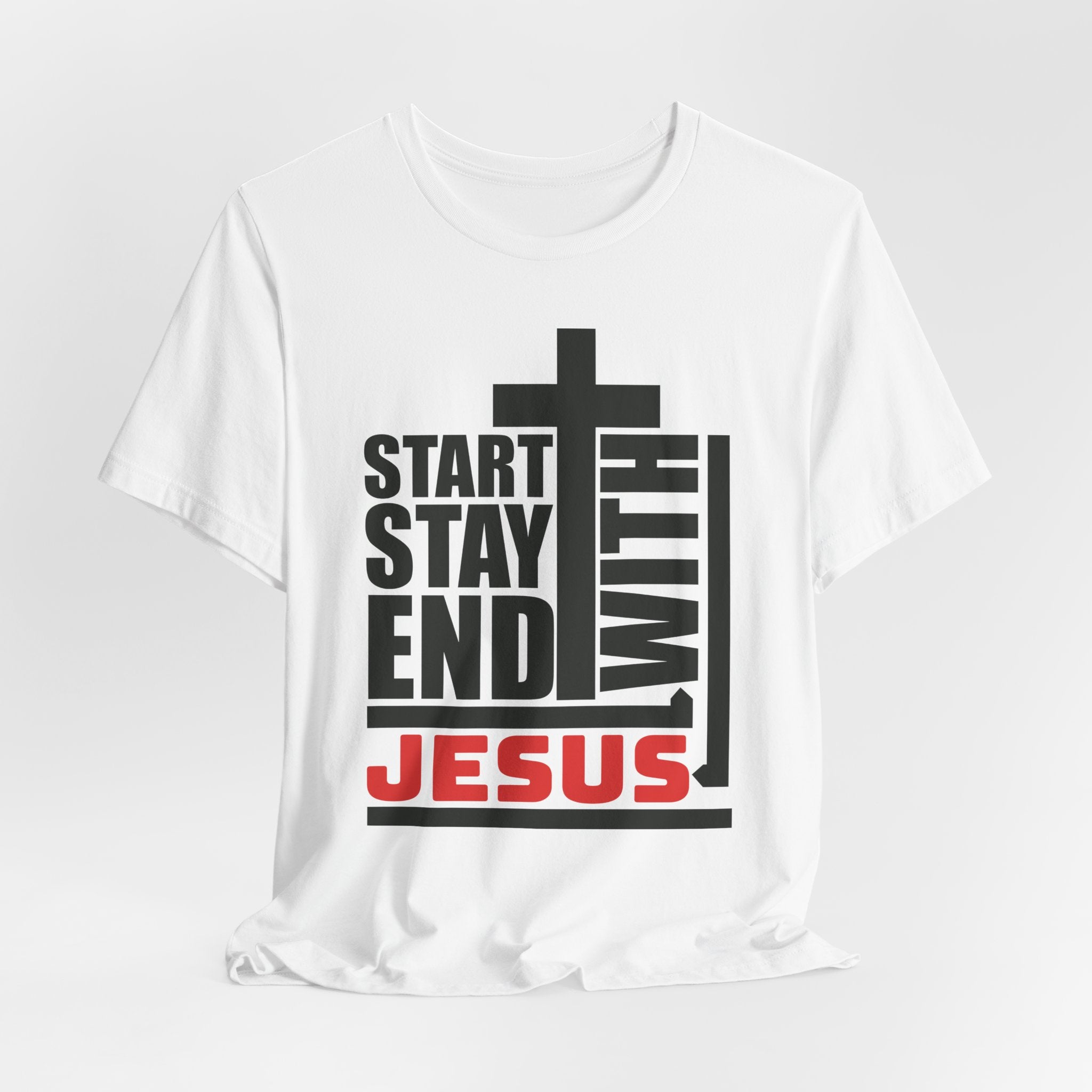 Start Stay End With Jesus tee — a bold, modern Christian T-shirt proclaiming that Jesus is the center of your entire faith journey.