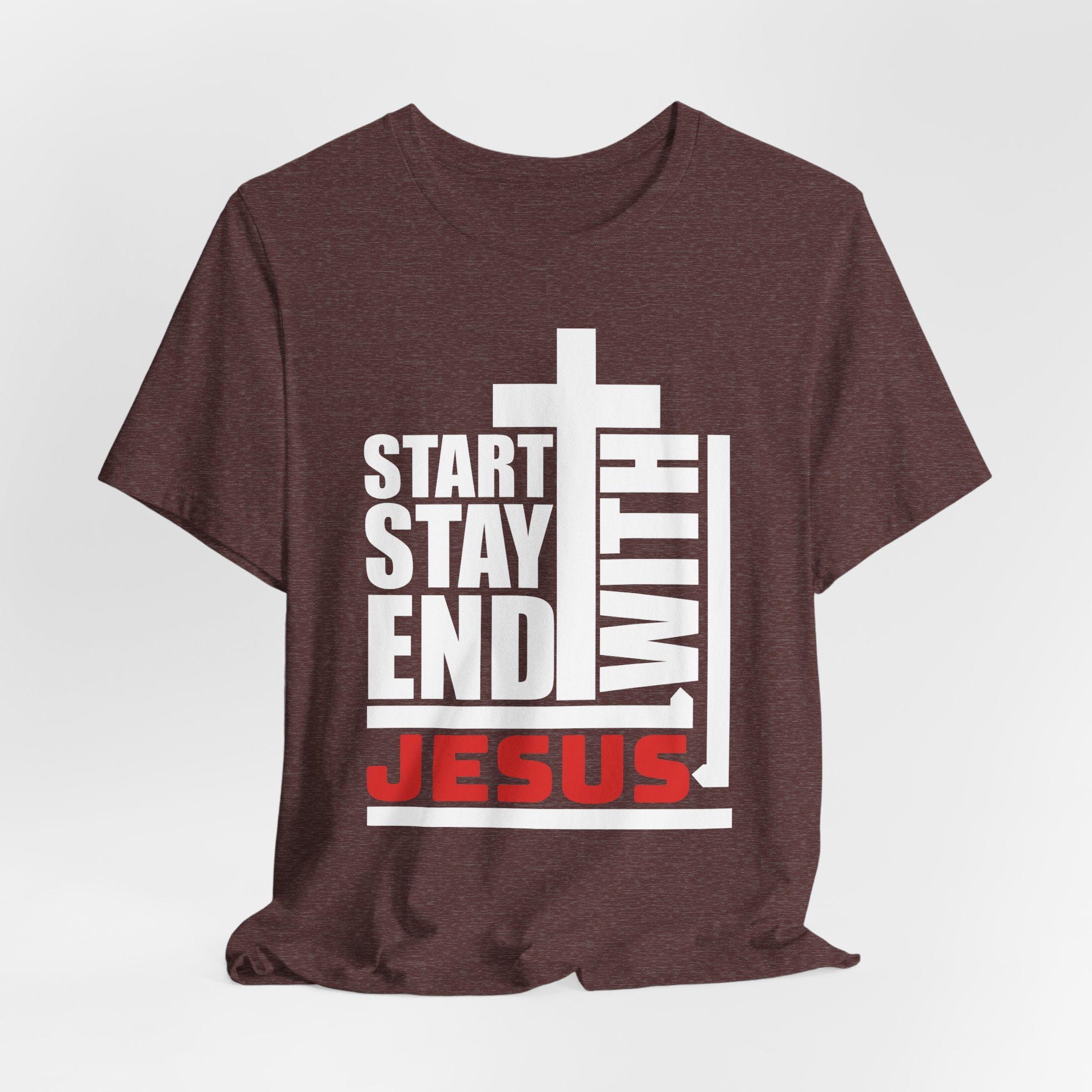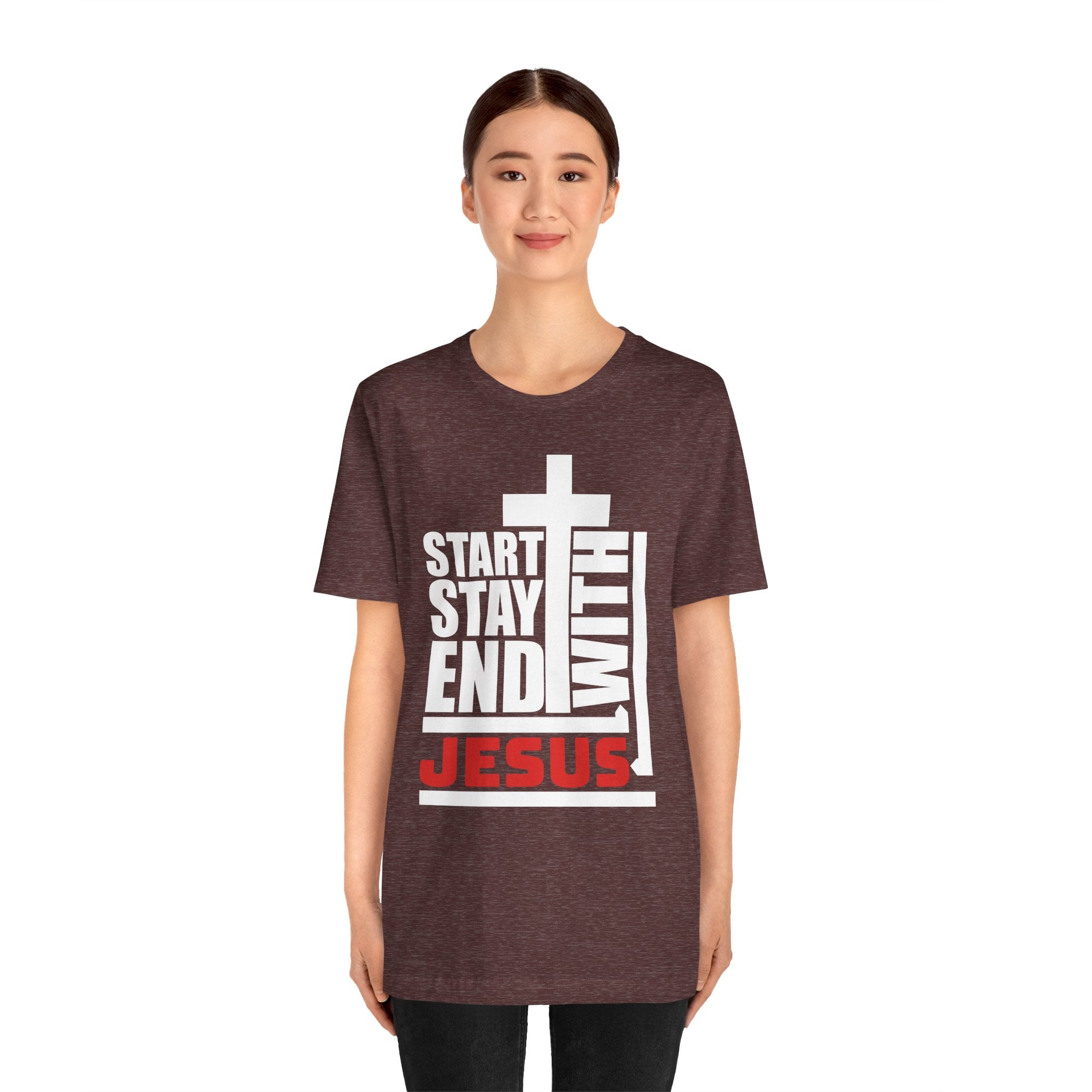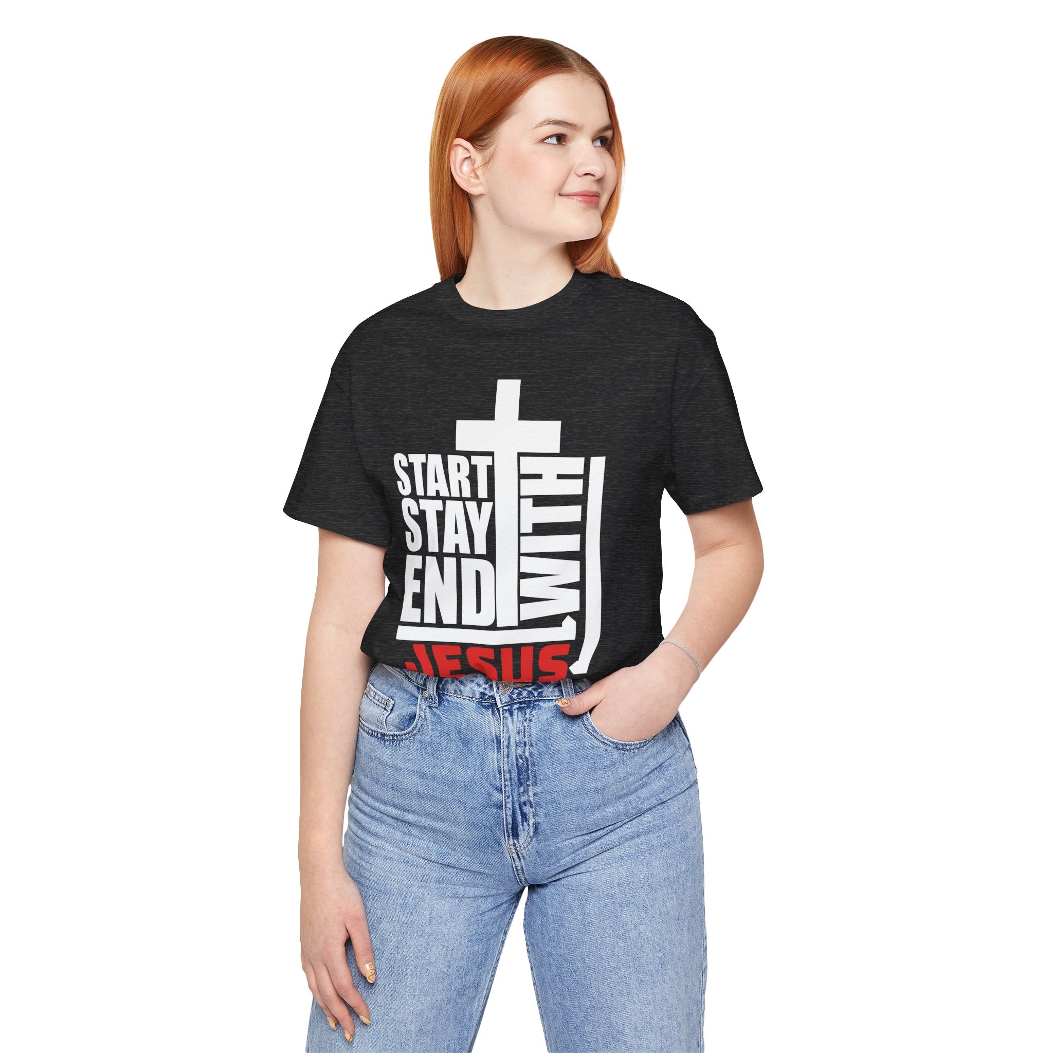 A Bold Proclamation: This powerful Christian T-shirt makes a bold, modern statement: "Start, Stay, End With Jesus." It's a complete declaration of a life centered on Christ.