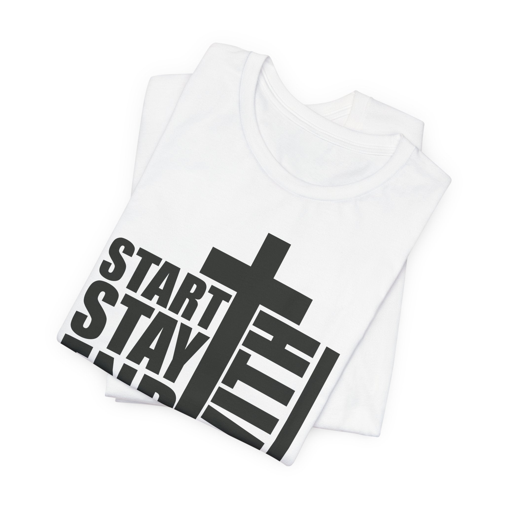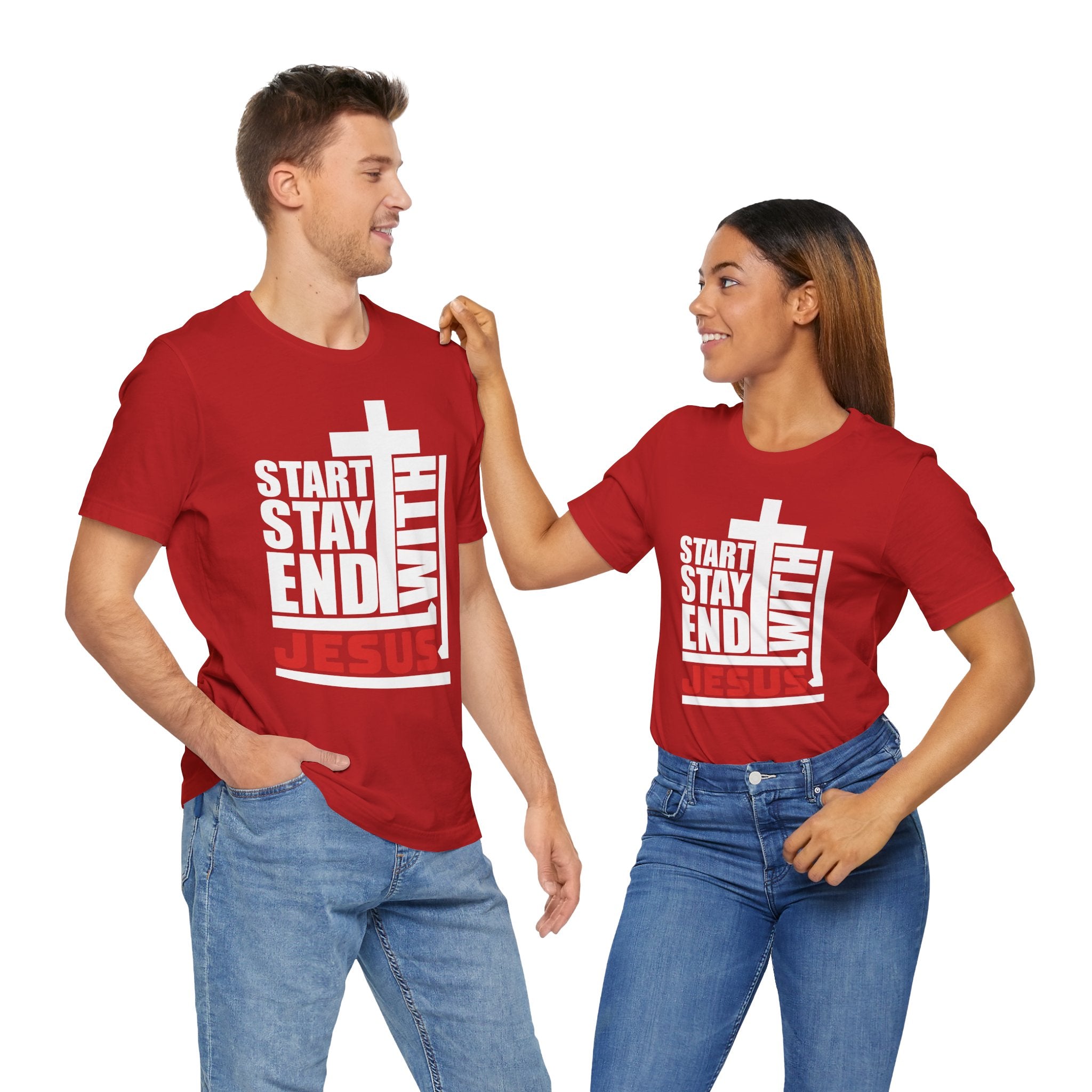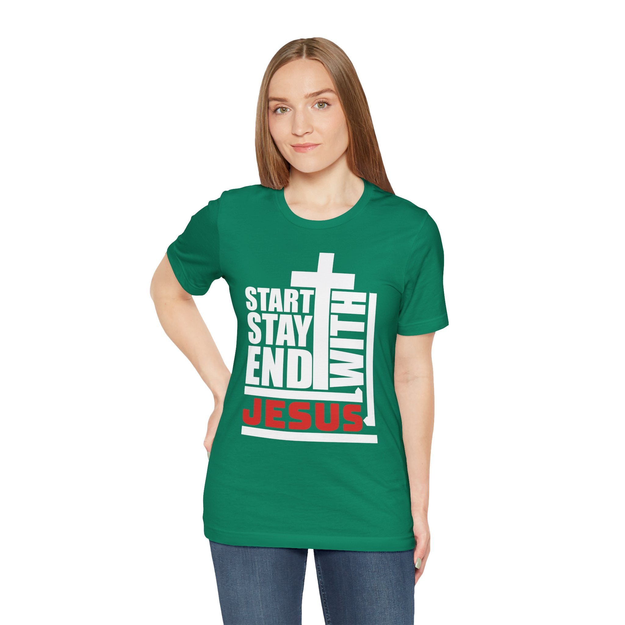 A Bold Proclamation: This powerful Christian T-shirt makes a bold, modern statement: "Start, Stay, End With Jesus." It's a complete declaration of a life centered on Christ.