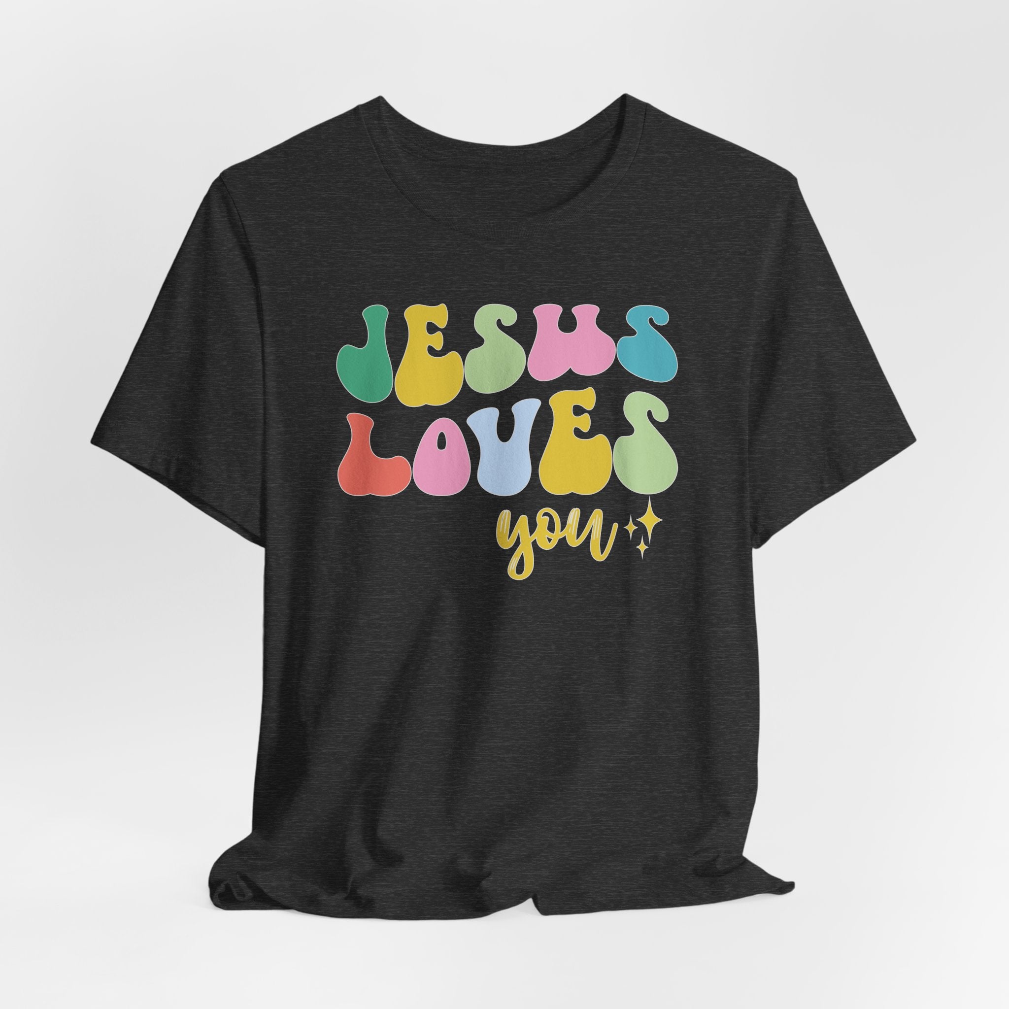 Jesus Loves You tee — a groovy, retro Christian T-shirt spreading the most important message of all.