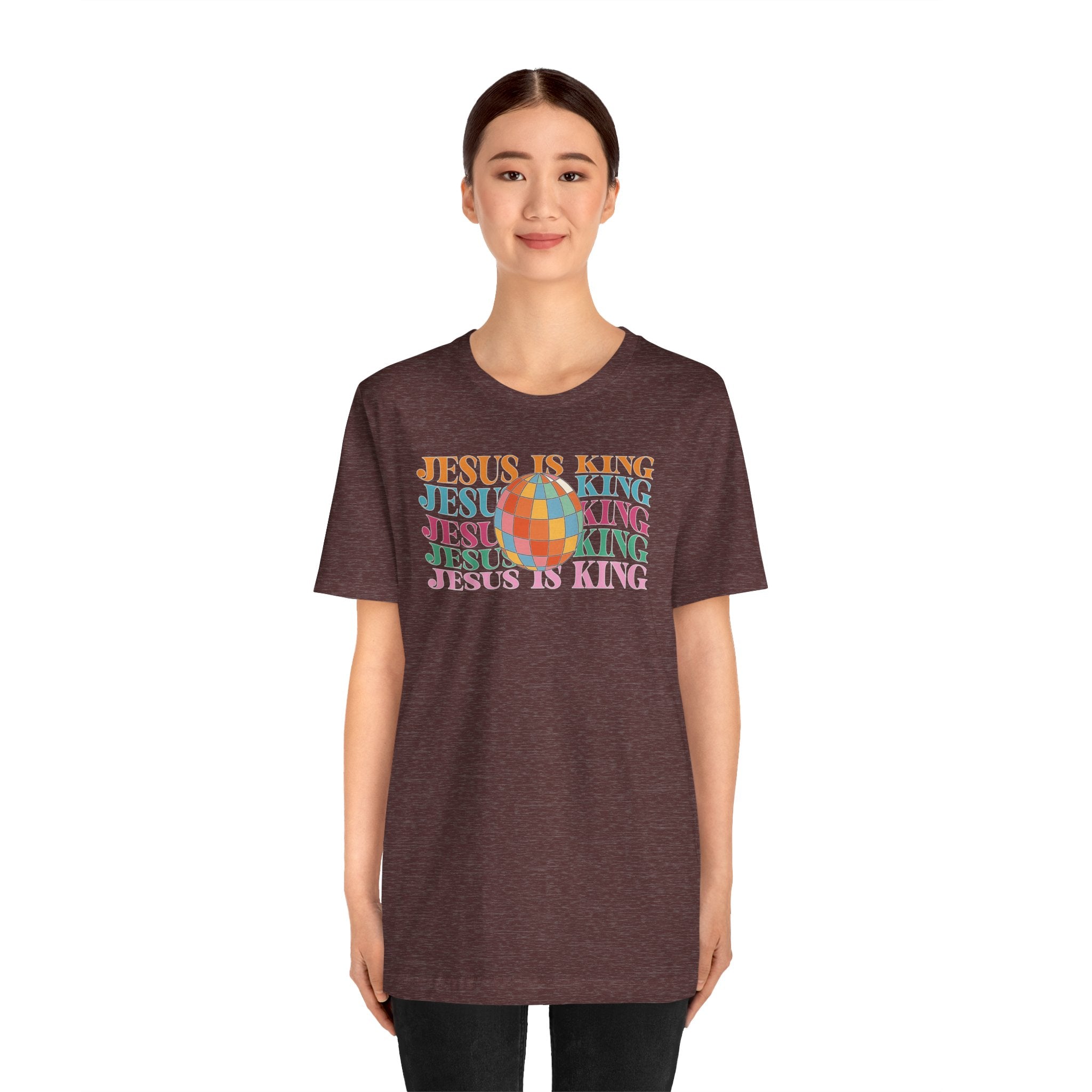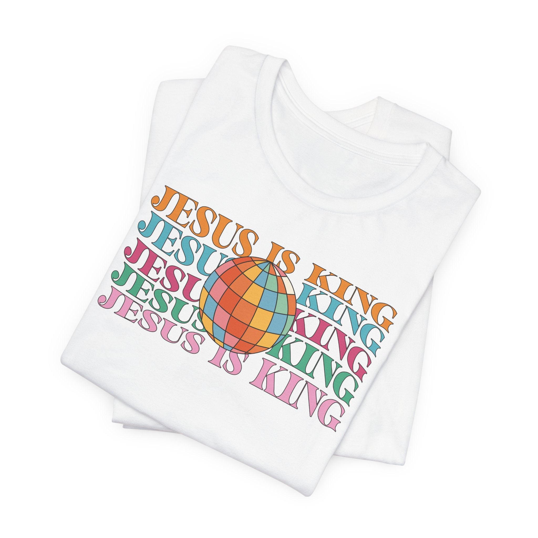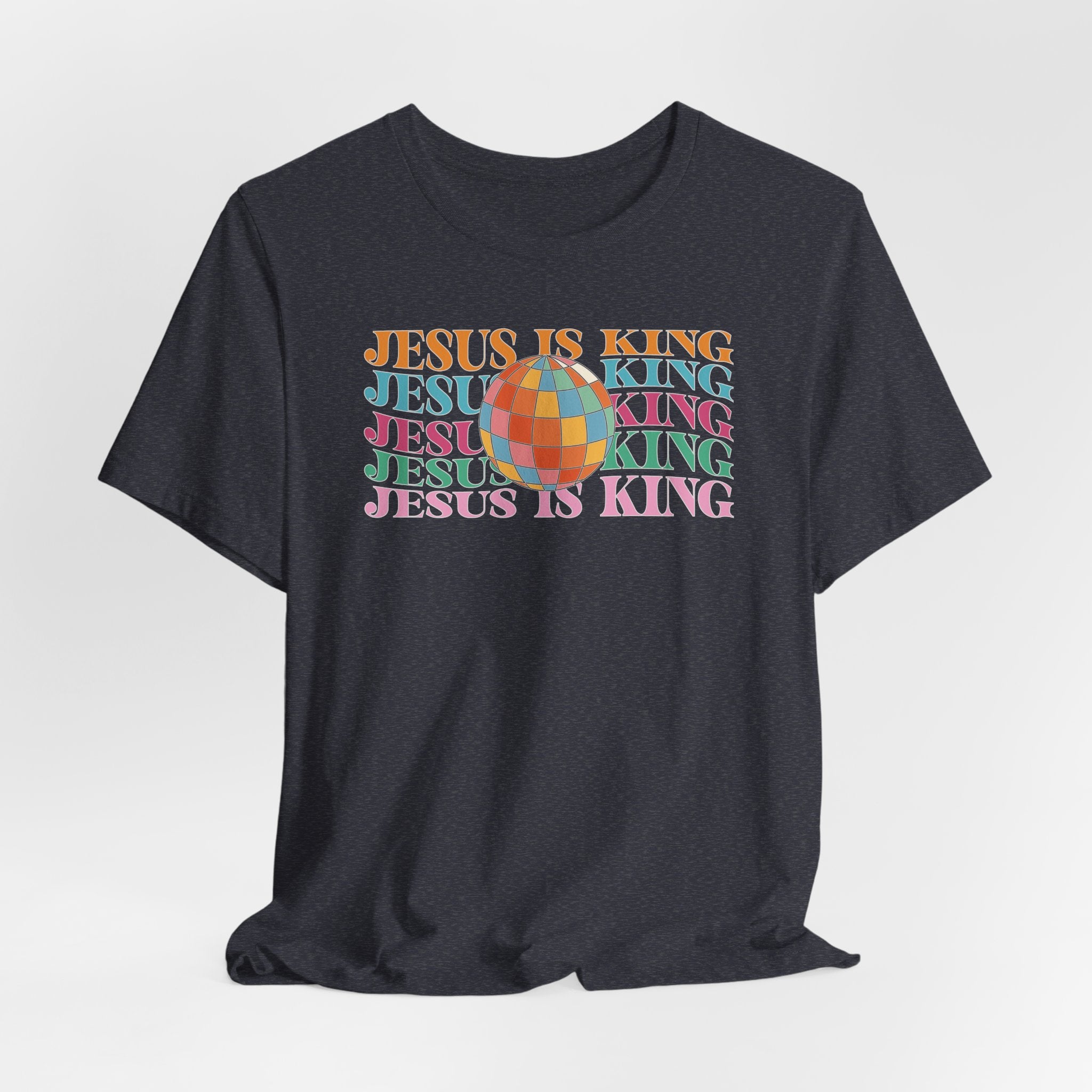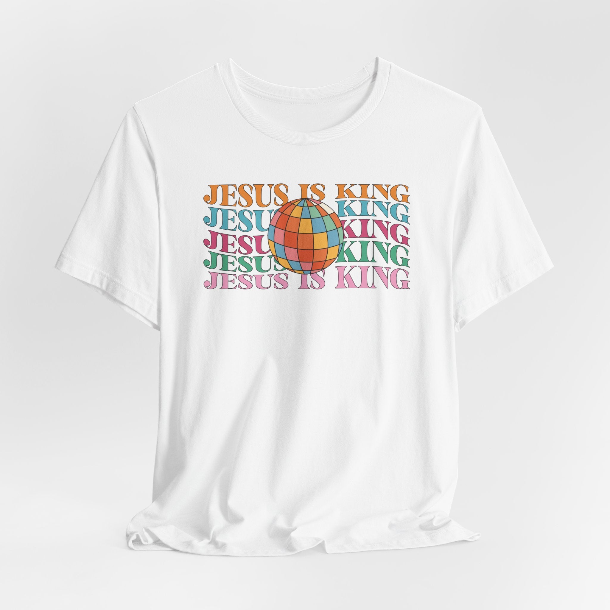 Jesus Is King tee — a groovy, retro-style Christian T-shirt proclaiming His lordship over all the earth.