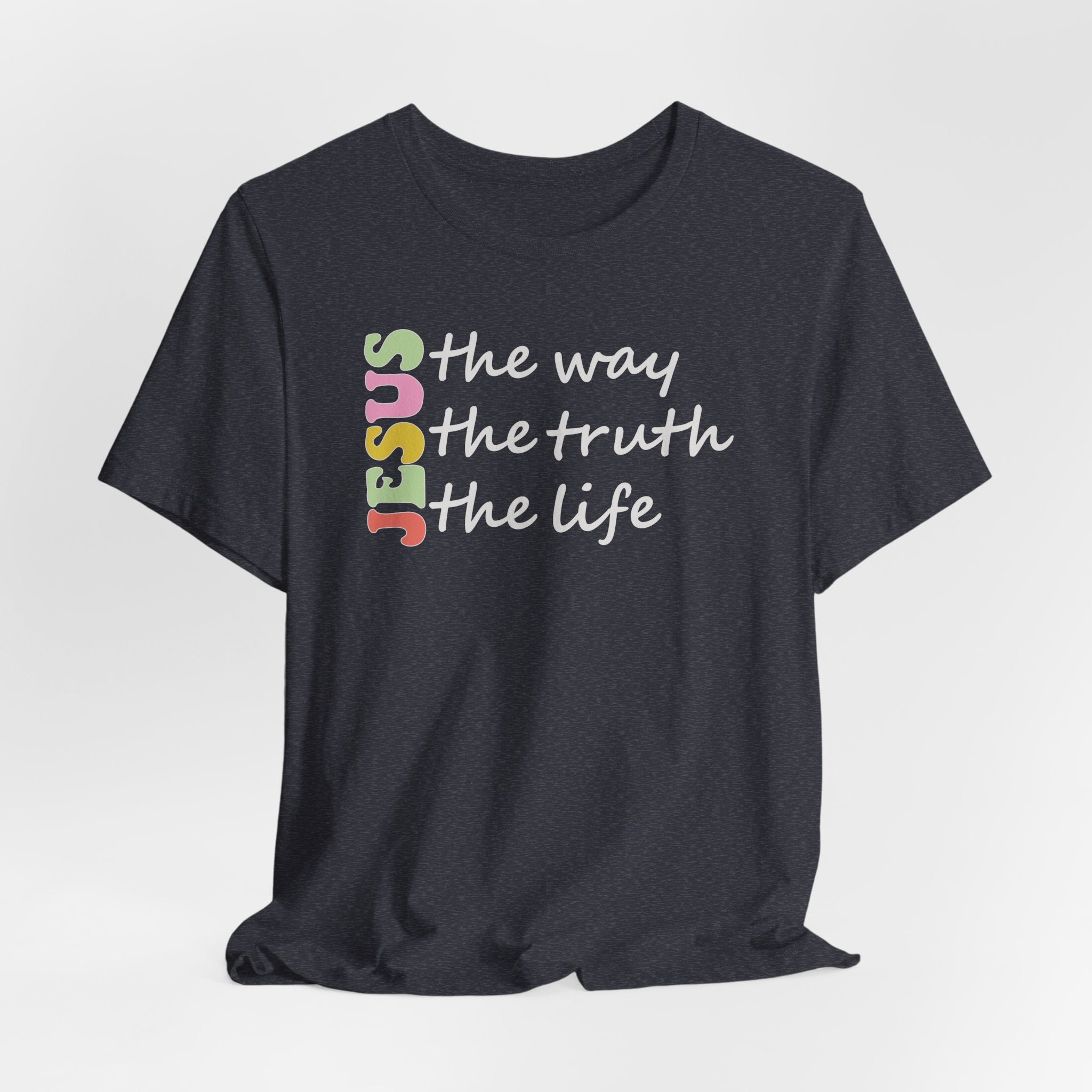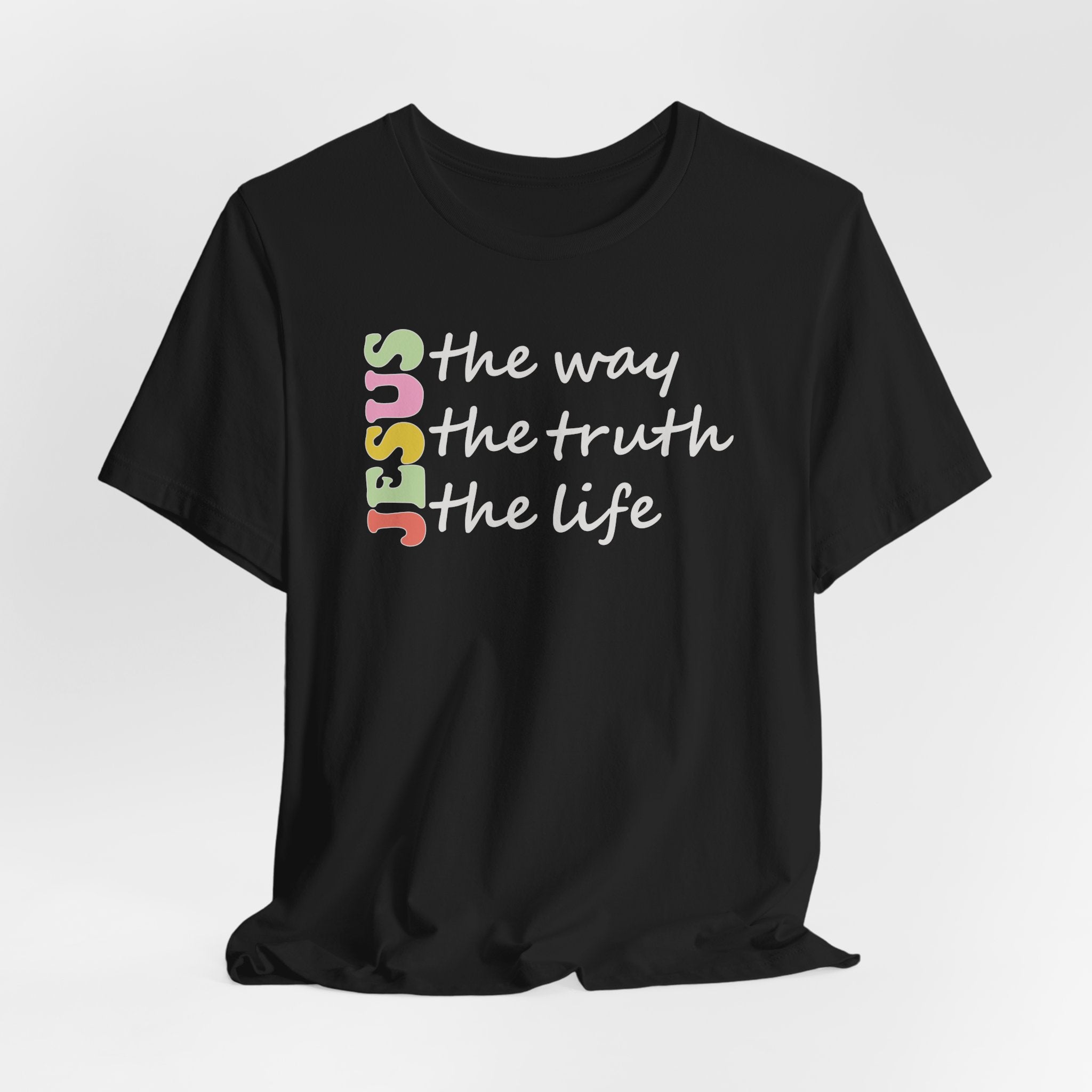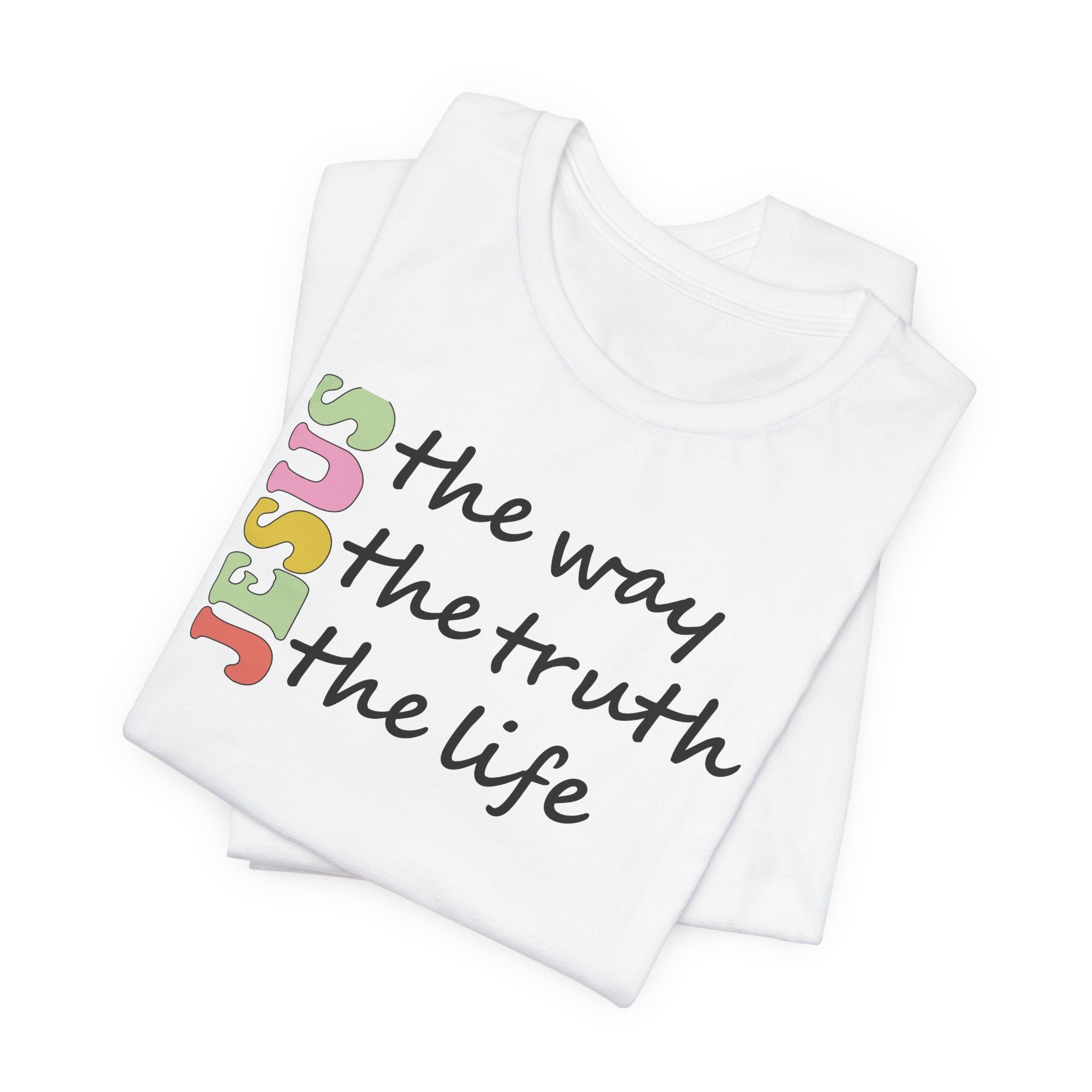 Jesus The Way The Truth The Life tee — a retro, colorful Christian T-shirt proclaiming the foundational truth of John 14:6.