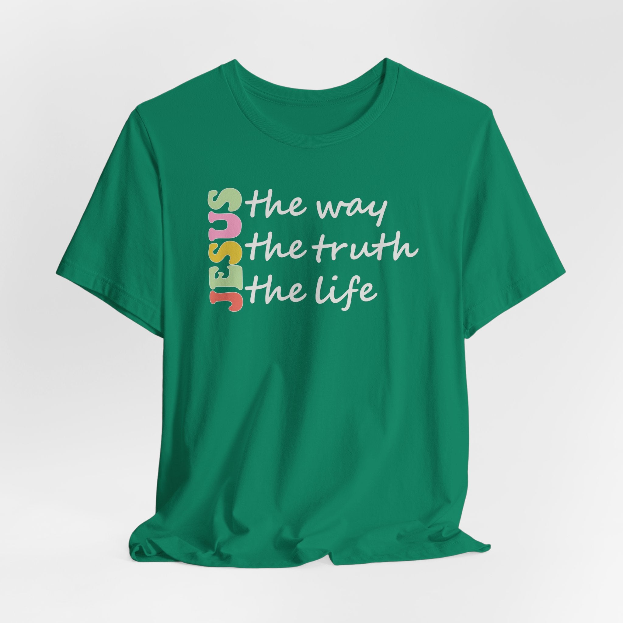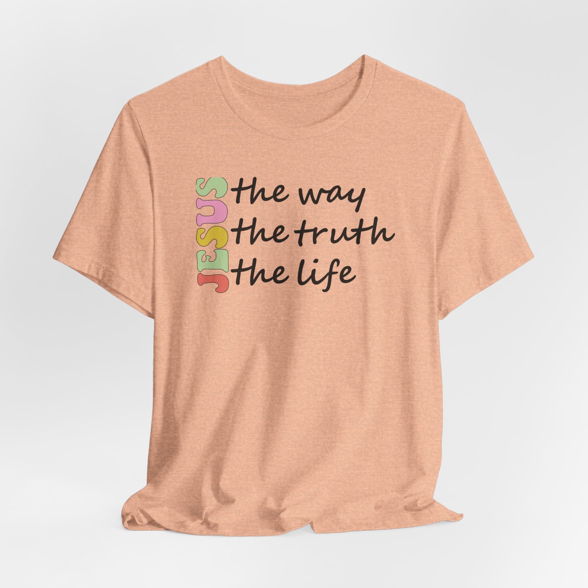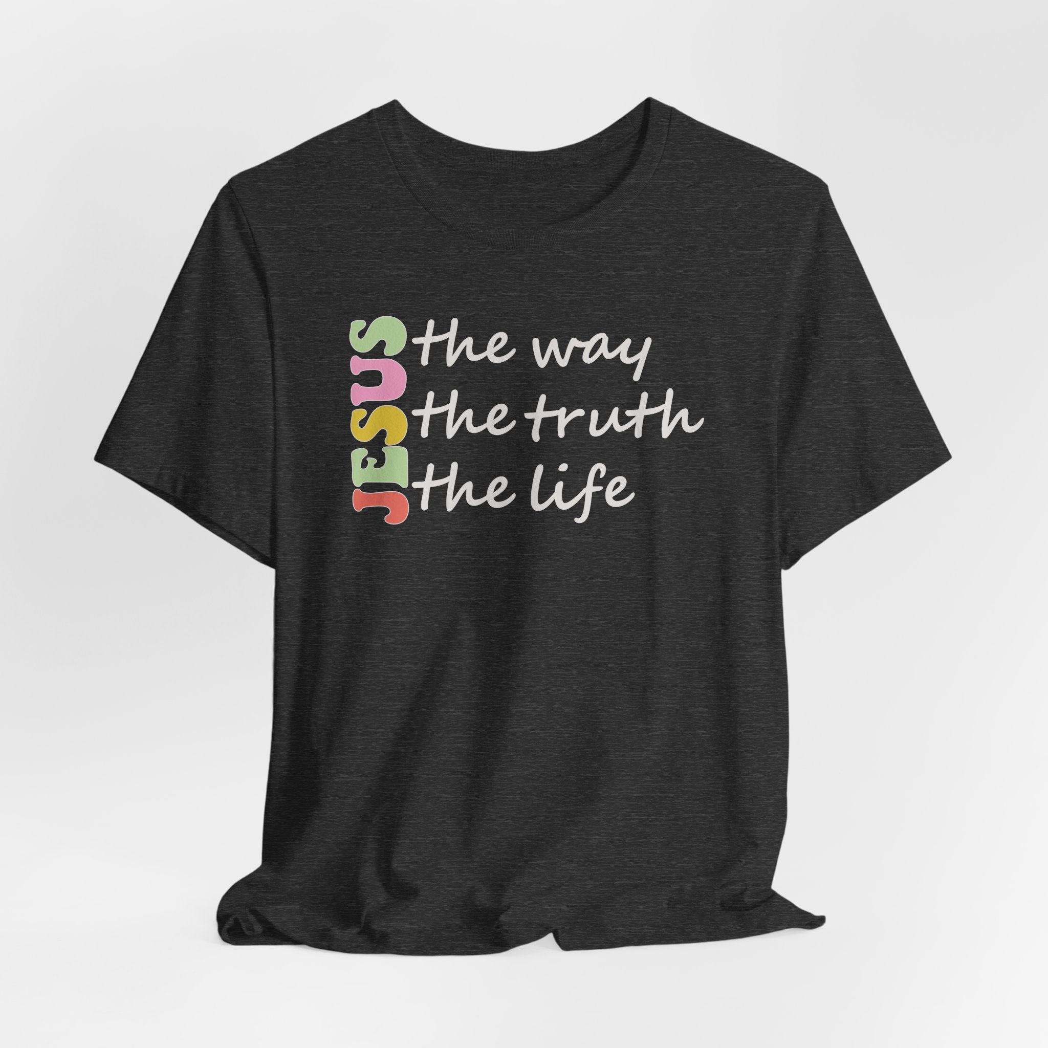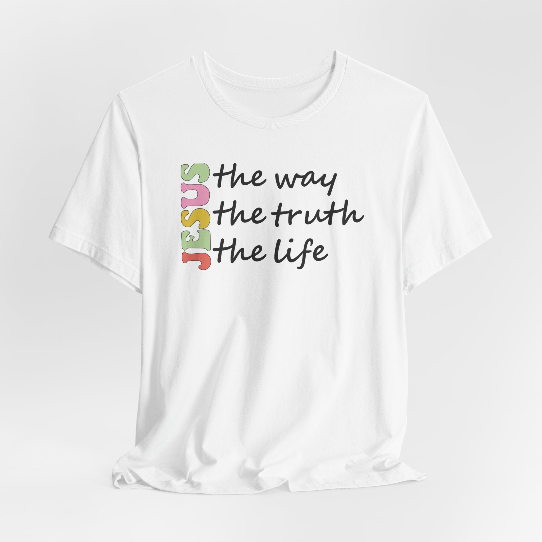 Jesus The Way The Truth The Life tee — a retro, colorful Christian T-shirt proclaiming the foundational truth of John 14:6.