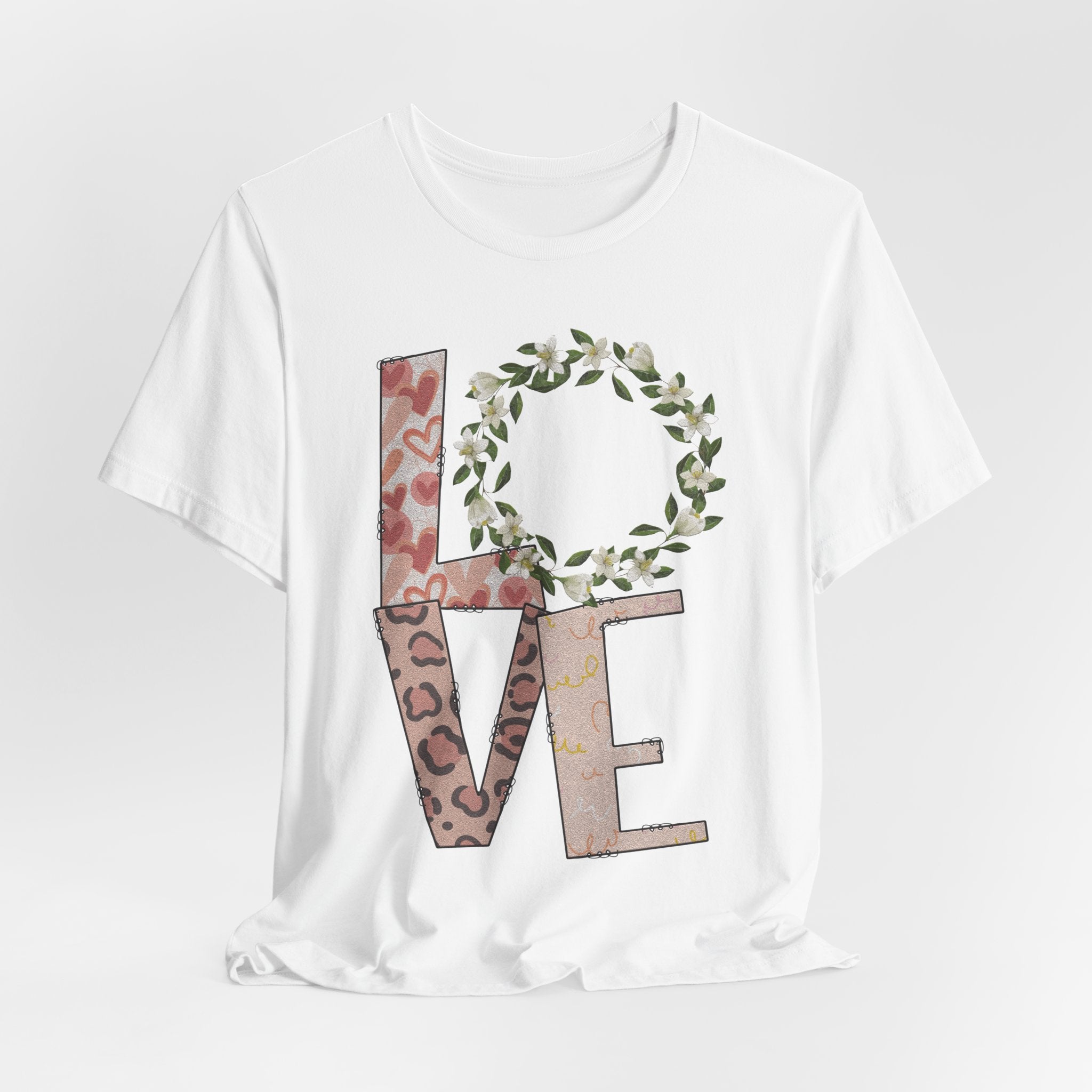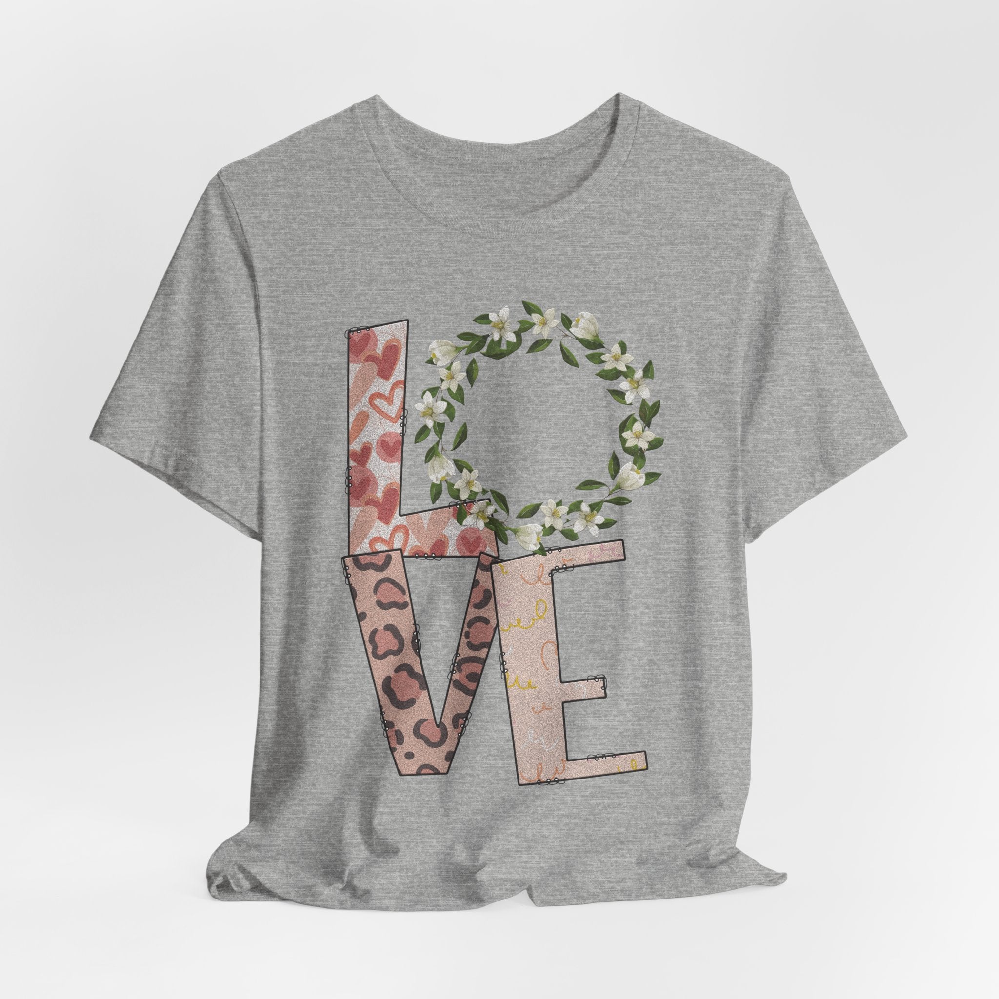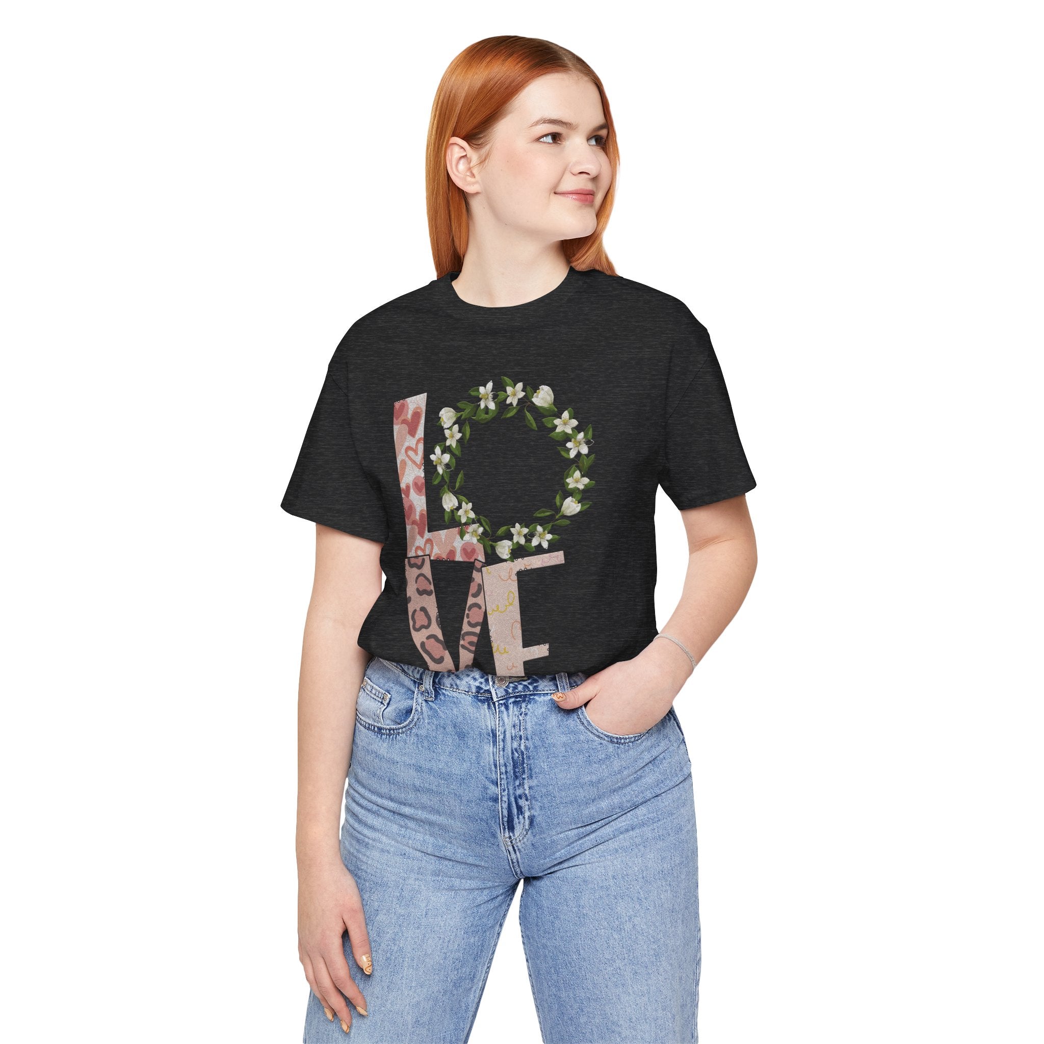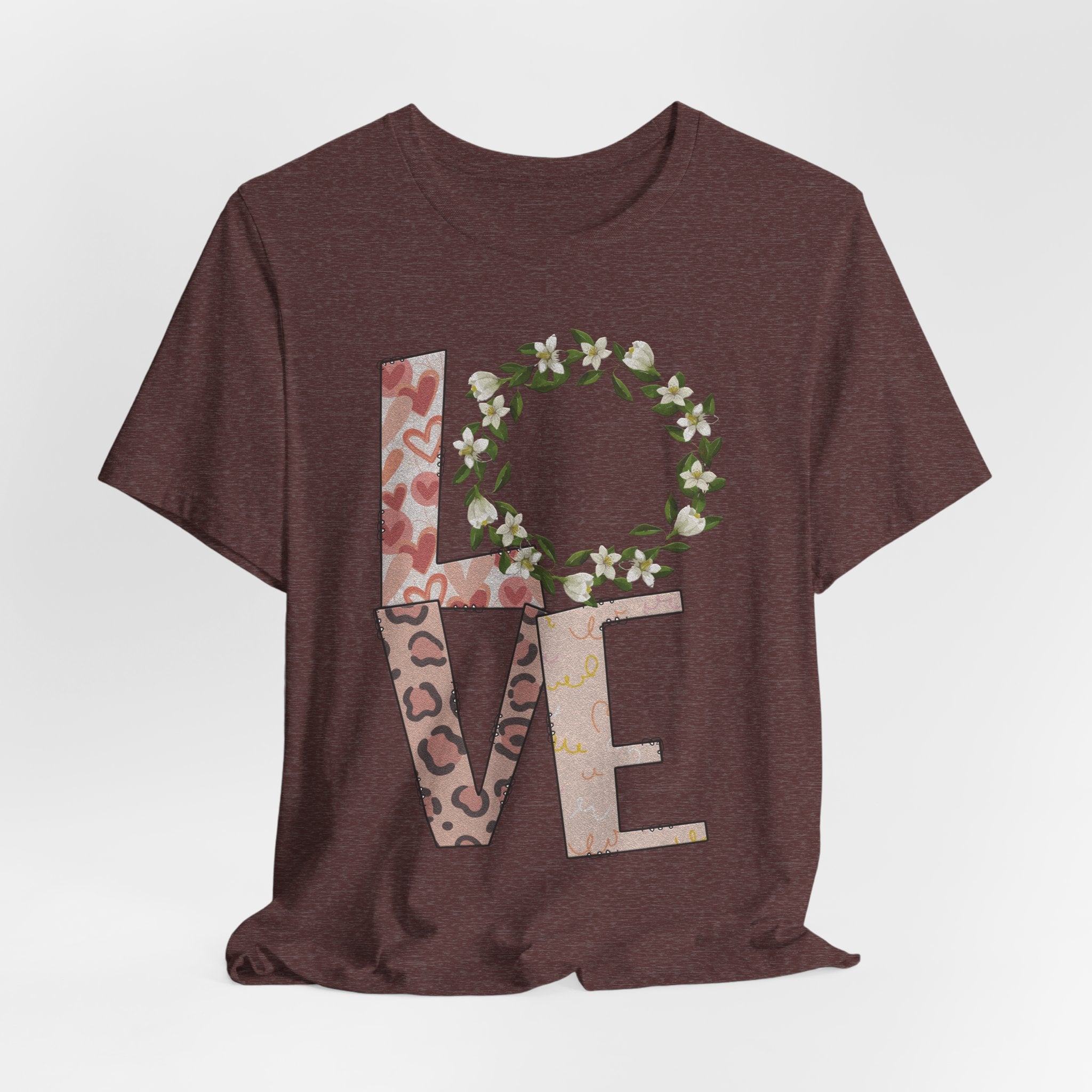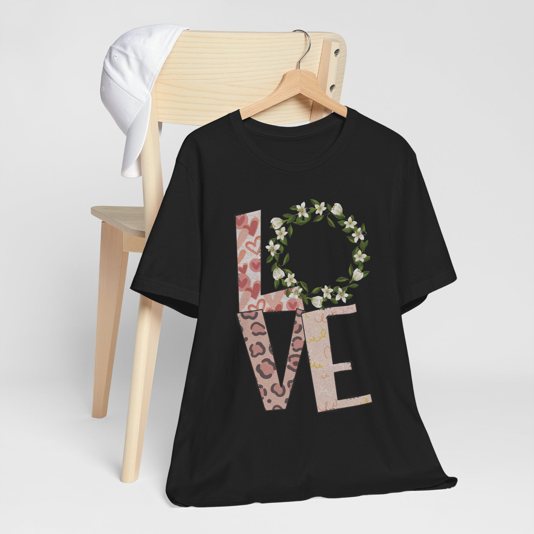 Trendy LOVE Design: Show your style with this chic LOVE T-shirt, featuring a trendy mix of patterns: hearts, a floral wreath, and leopard print.