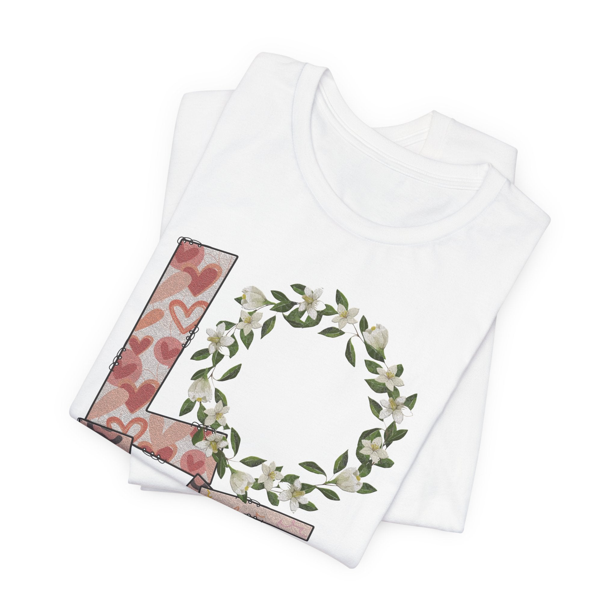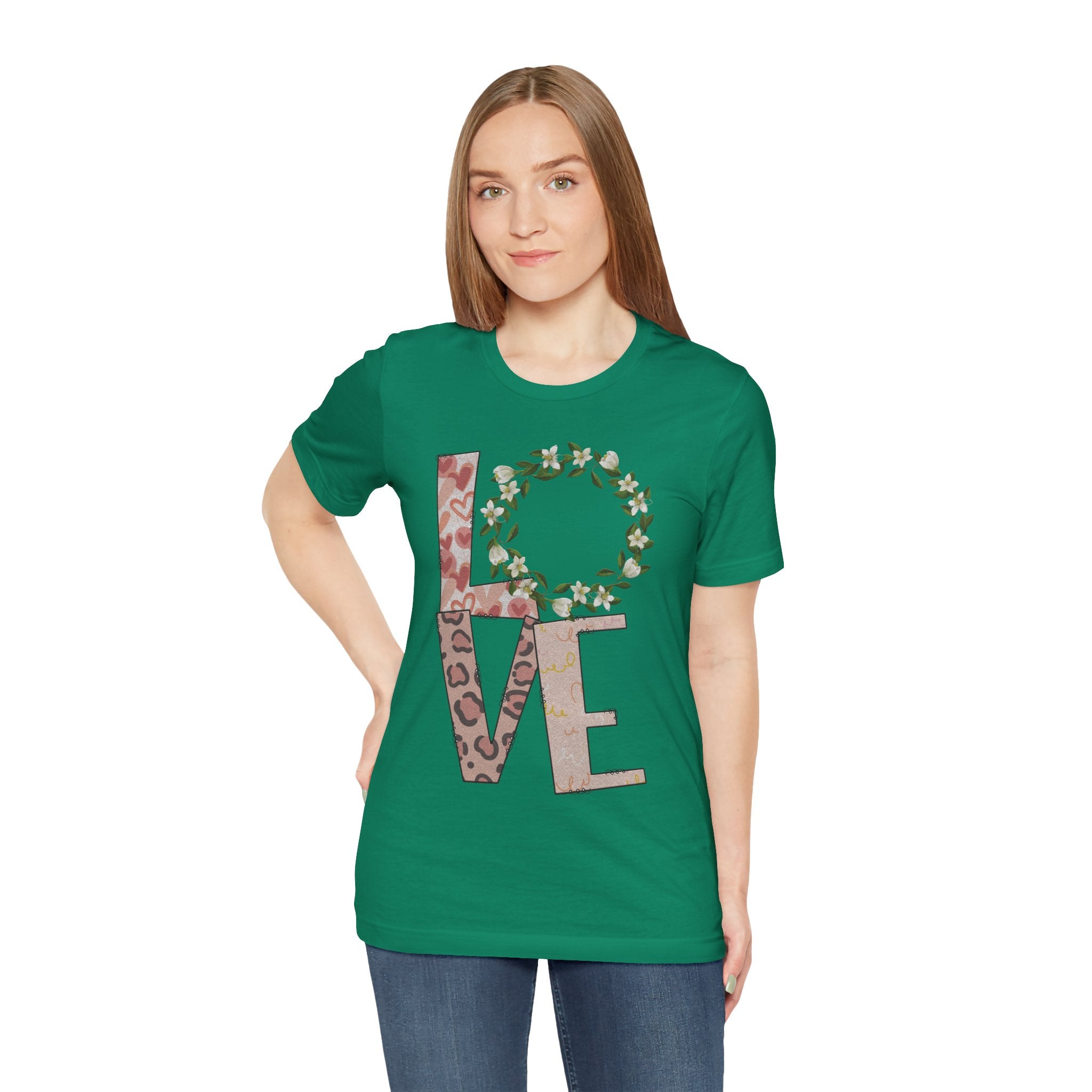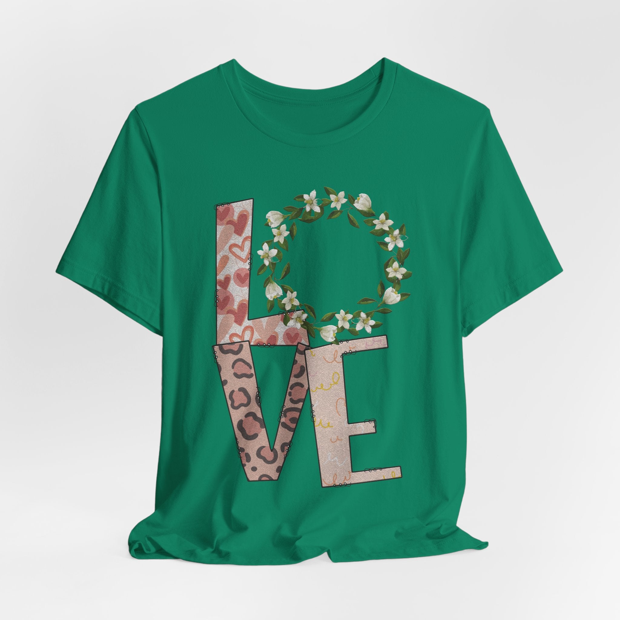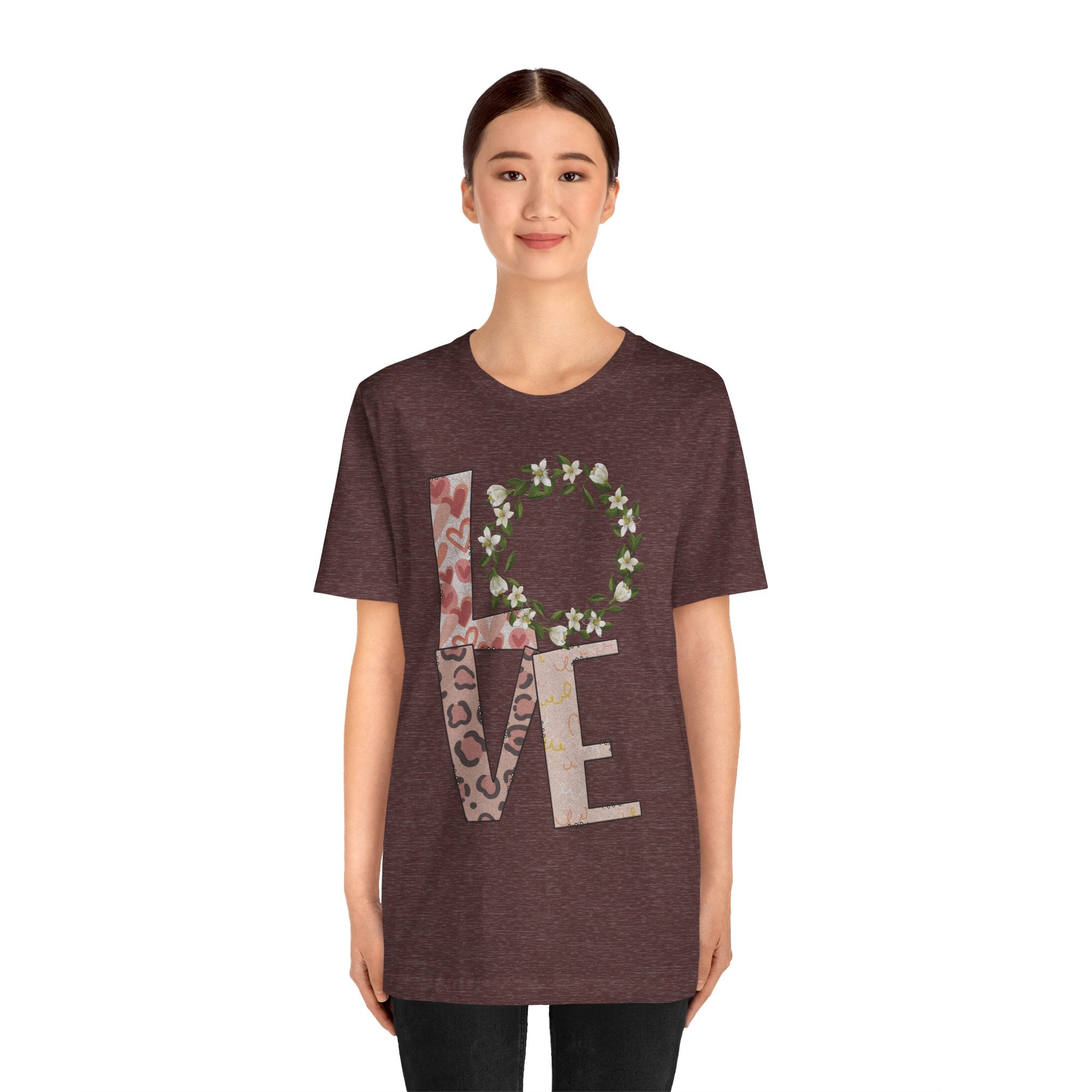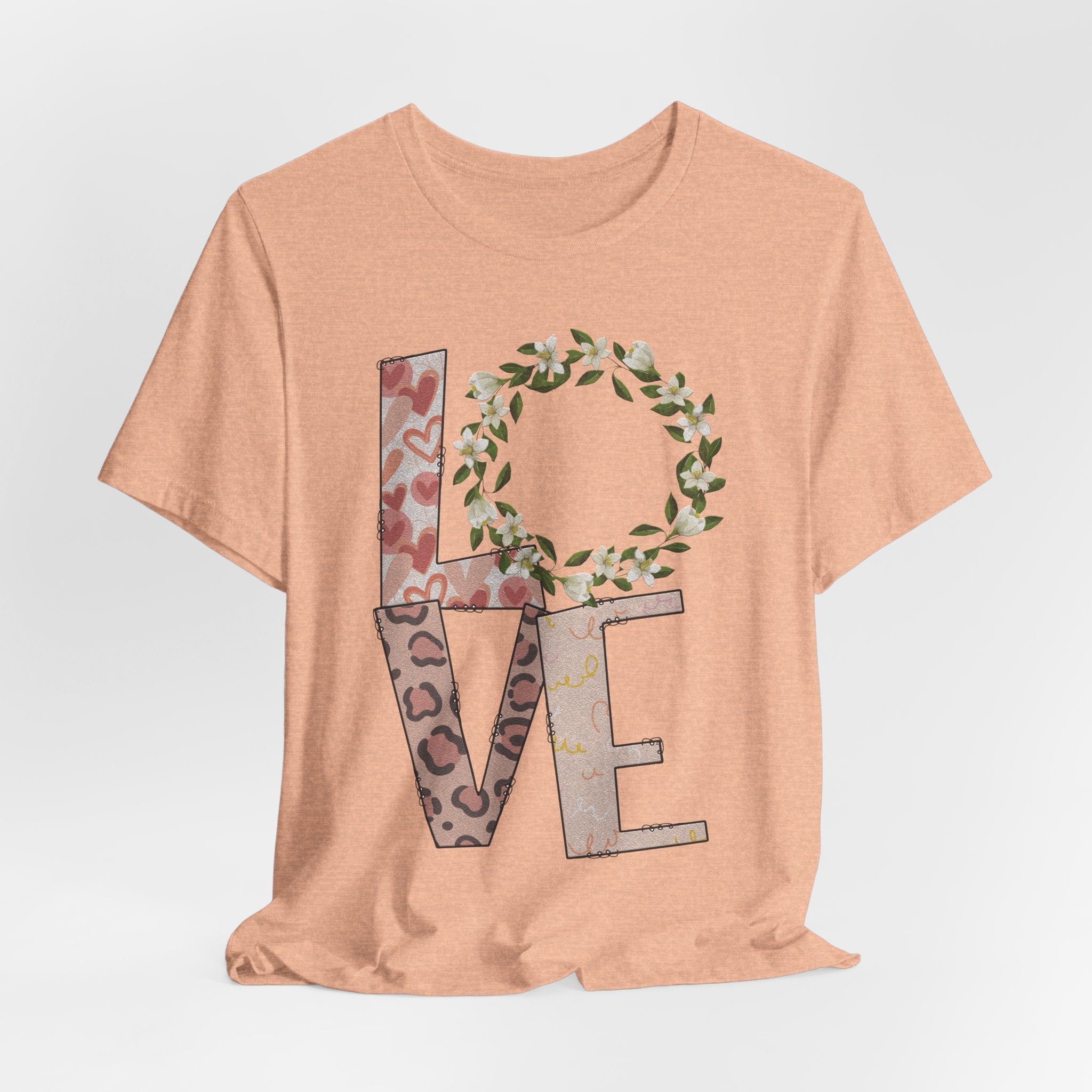 Trendy LOVE Design: Show your style with this chic LOVE T-shirt, featuring a trendy mix of patterns: hearts, a floral wreath, and leopard print.