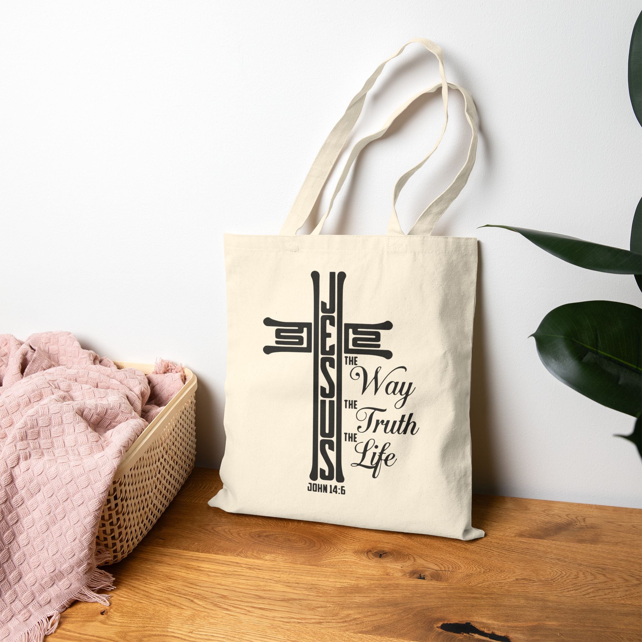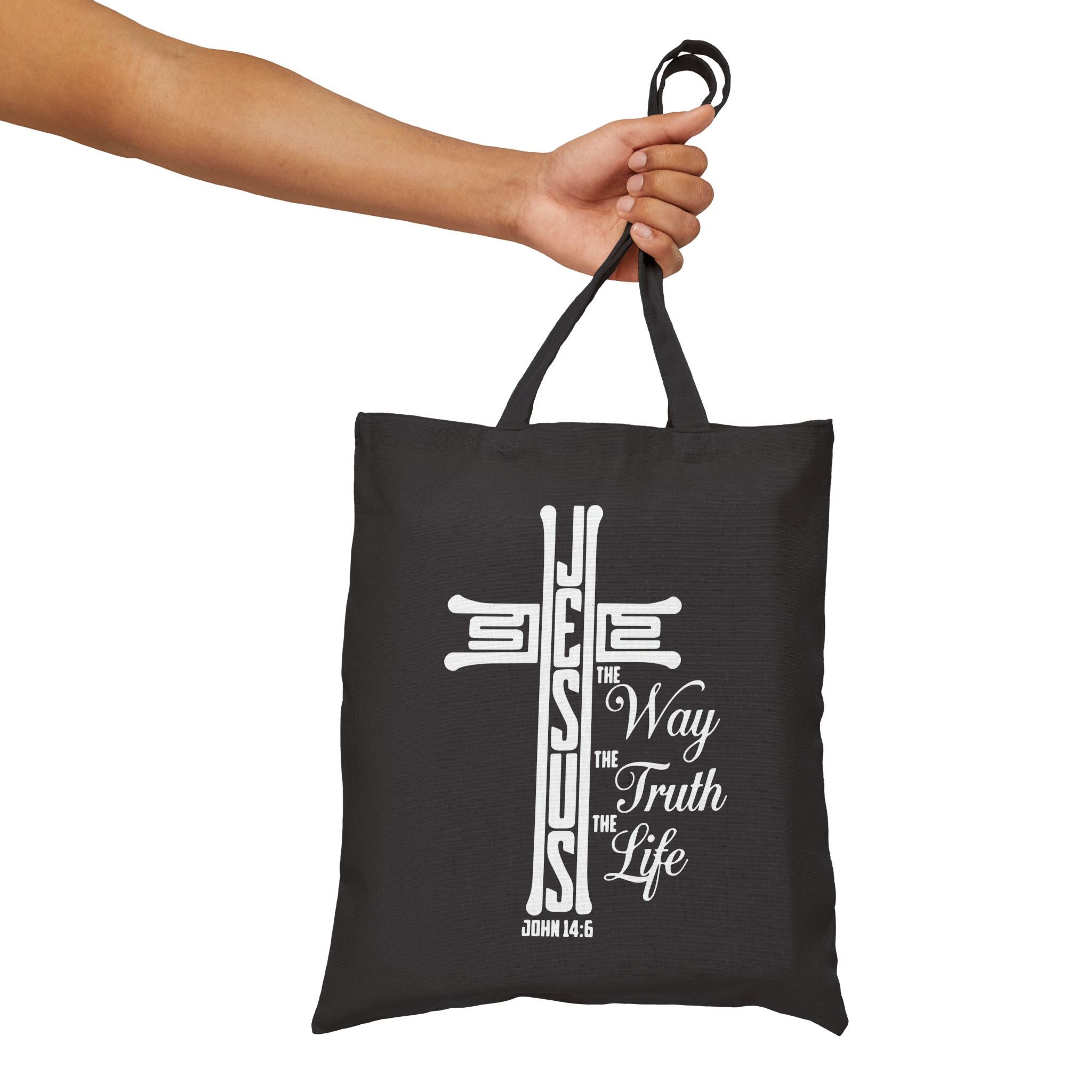 Jesus: The Way, The Truth, The Life tote bag • a meaningful Christian canvas bag honoring John 14:6 with a bold cross-centered Gospel message.