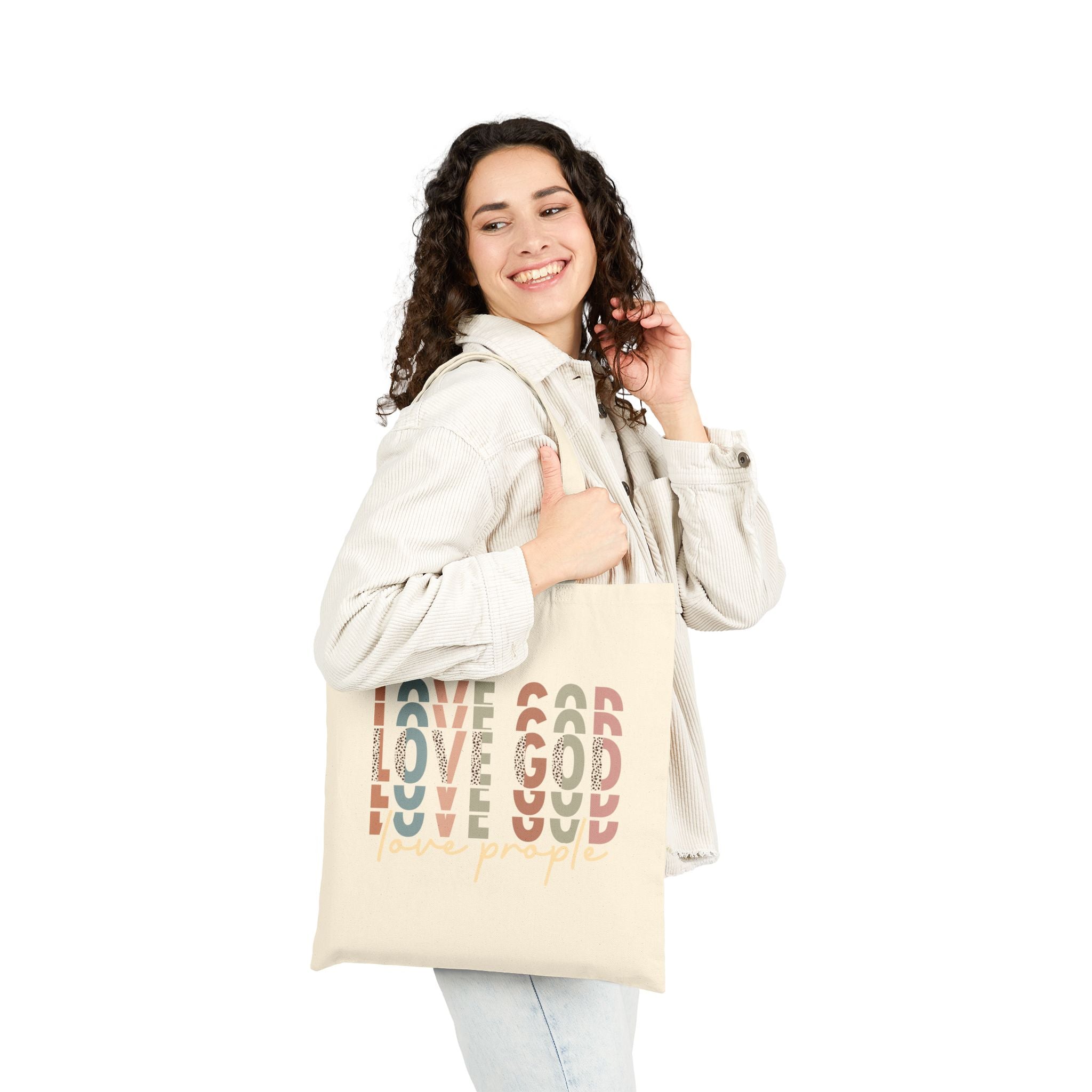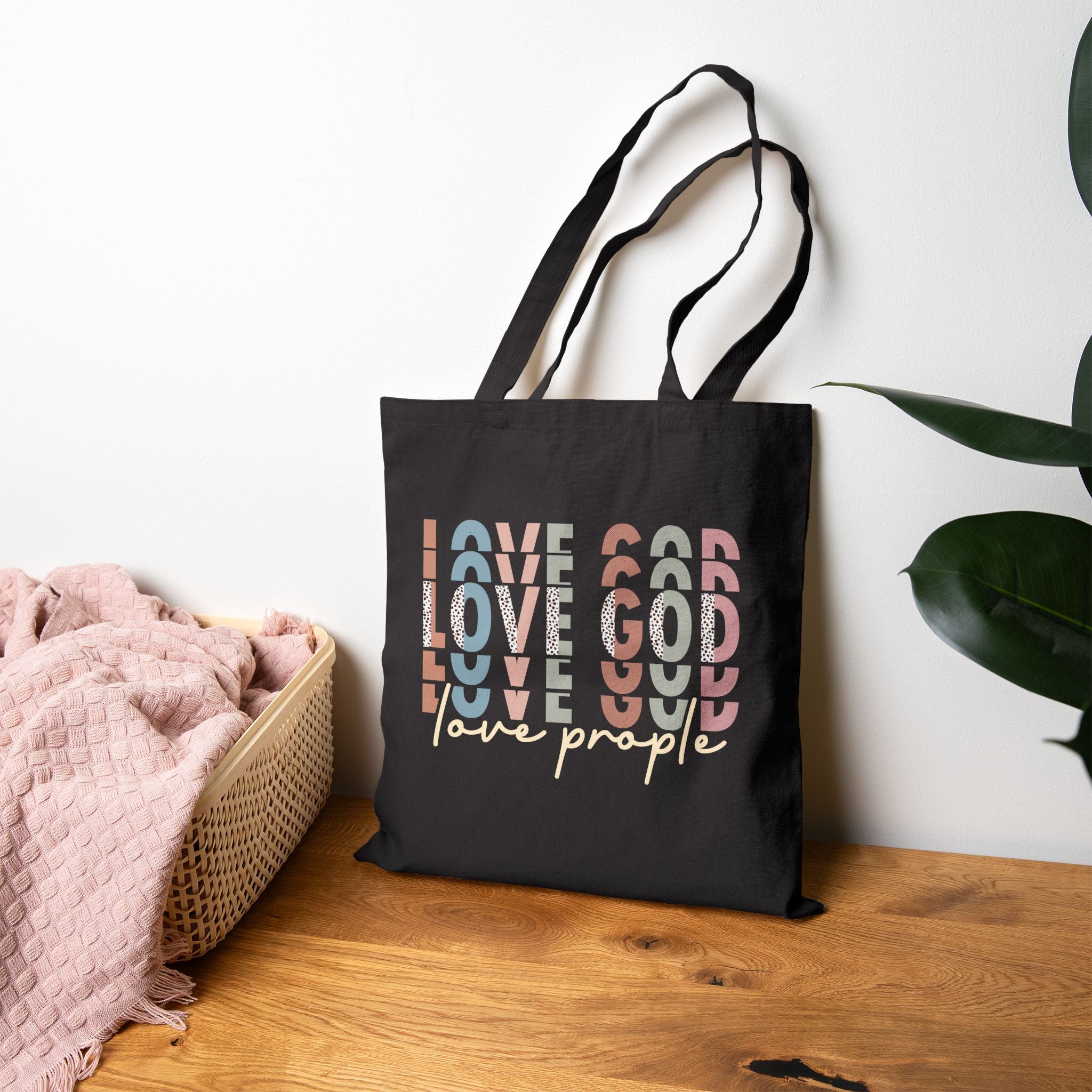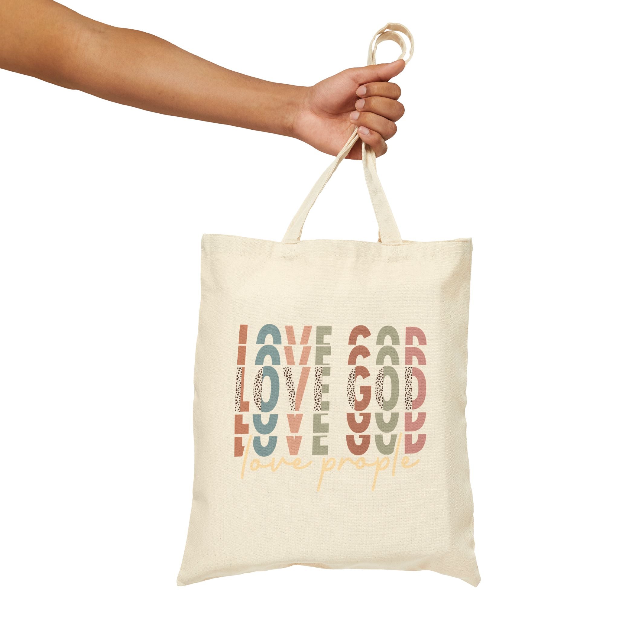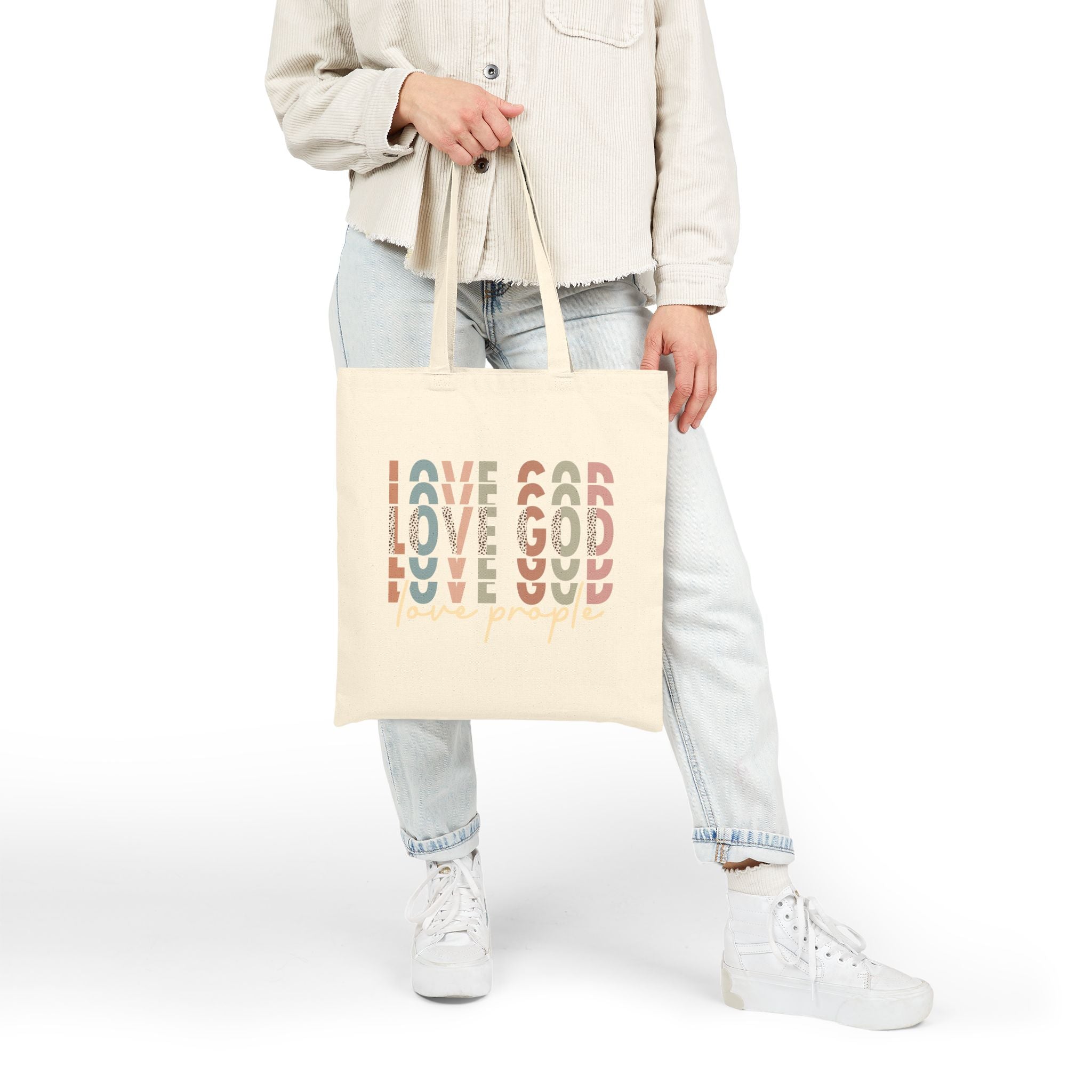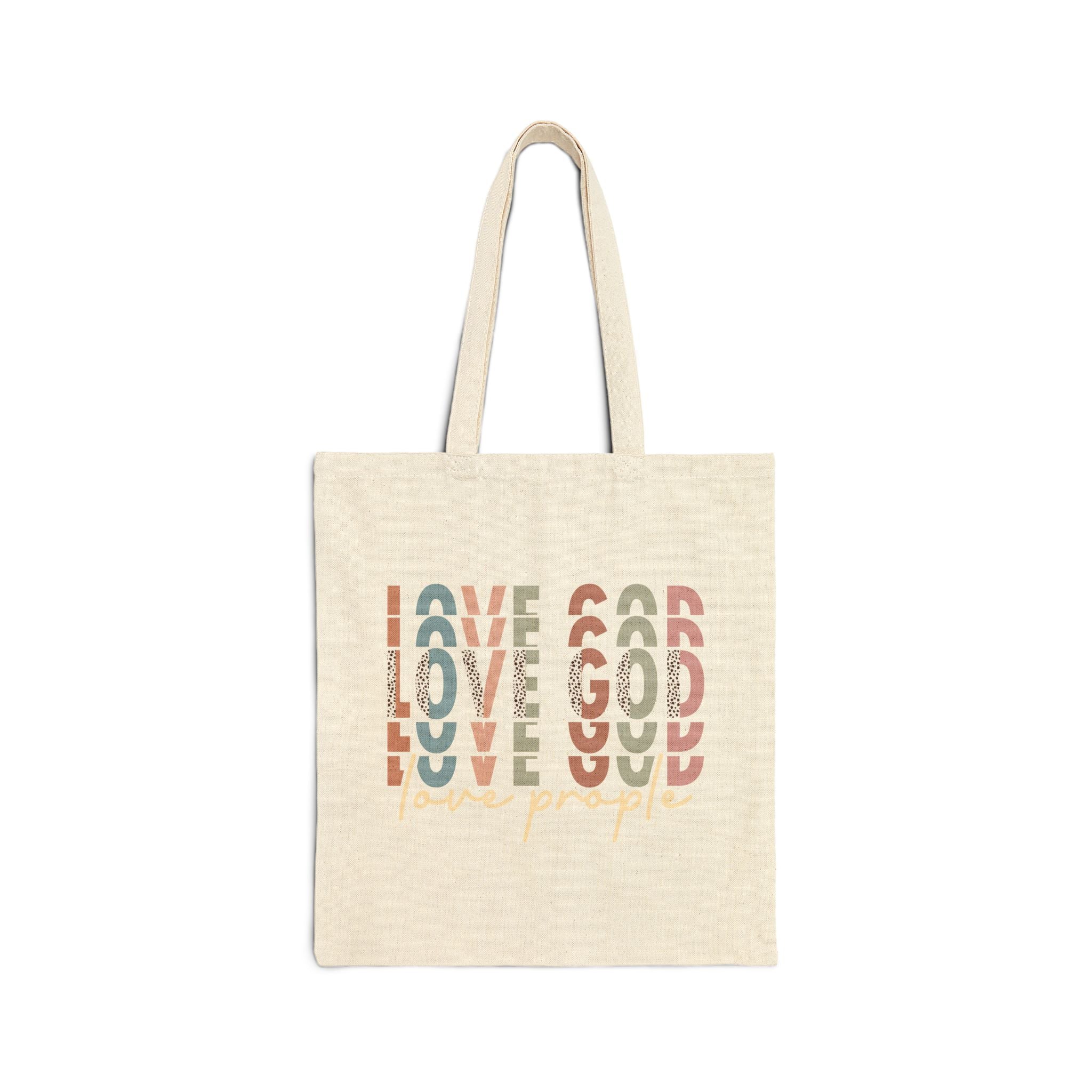 Love God Love People Christian tote bag — a modern Scripture-inspired canvas bag sharing Jesus’ greatest commandment in everyday life.